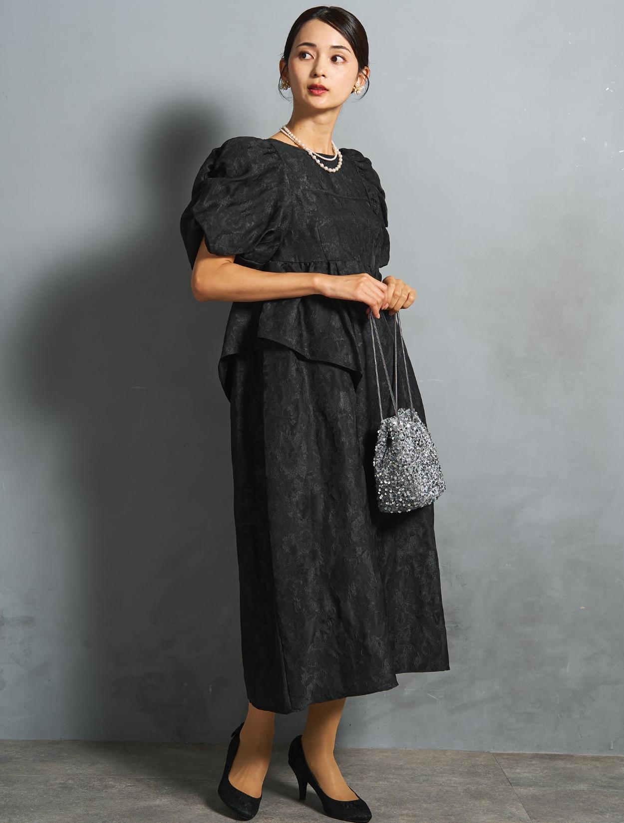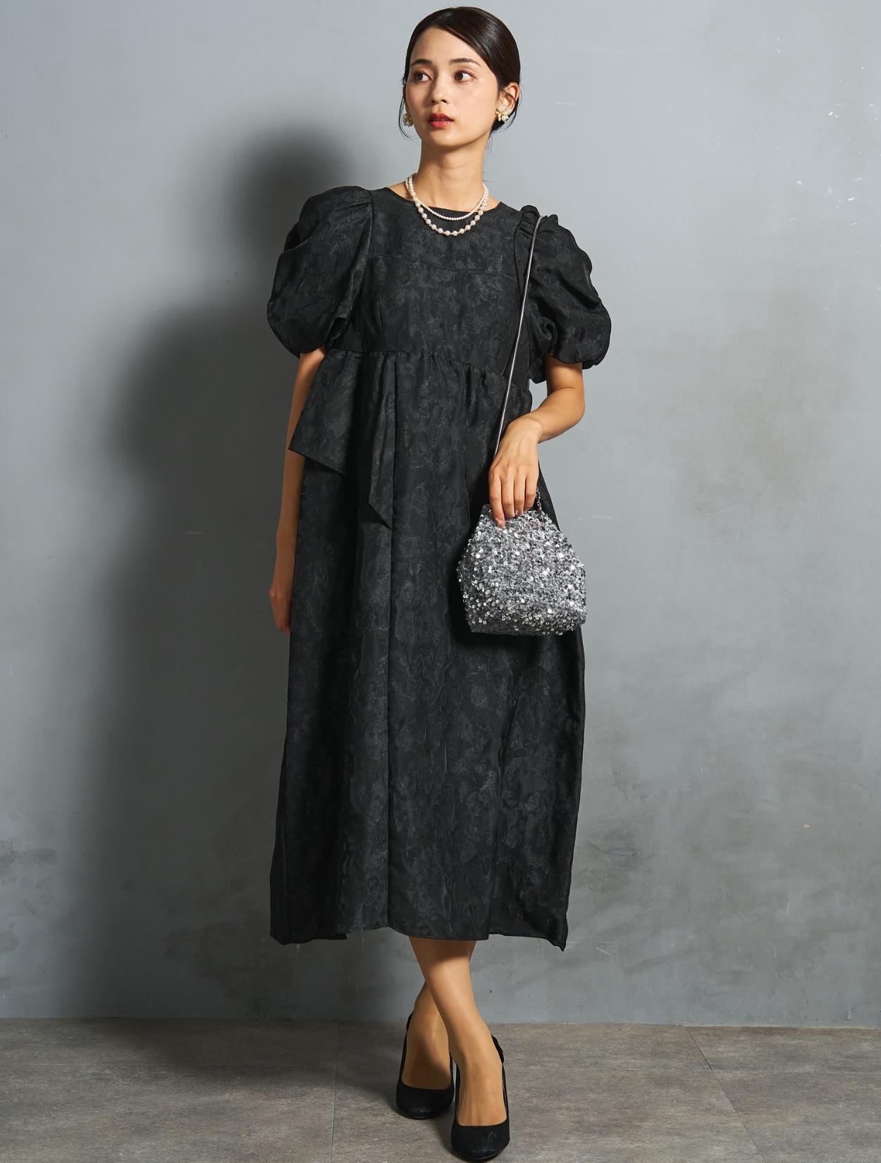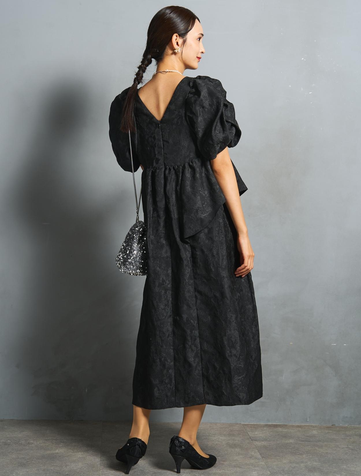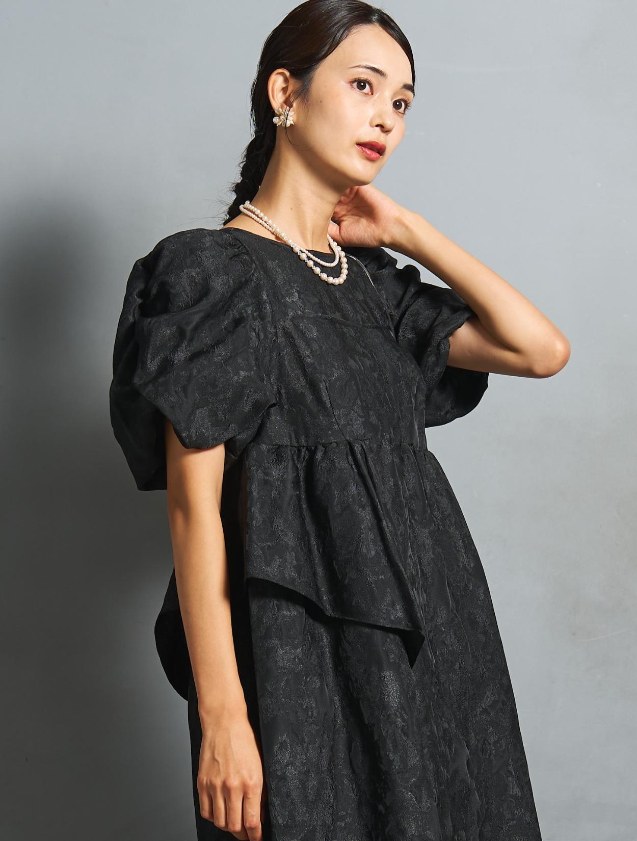 光沢のある糸を織り交ぜた、高級感と立体感のあるジャガード生地がポイントのドレス。上品な生地のフォーマル感と、オーバーシルエットのボリューム感のバランスが絶妙。今っぽくもクラシカルな印象で着こなせます。