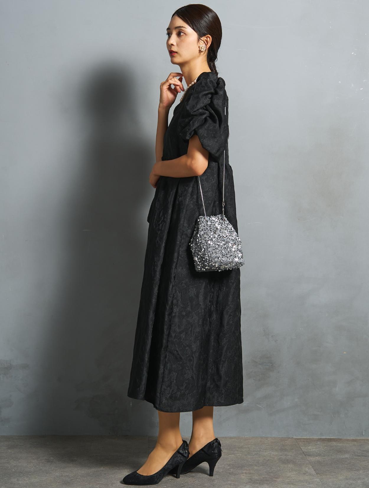 今っぽい雰囲気のワンピースドレスにぴったりのスパンコールバッグ。いい意味でラフさのある頑張りすぎない印象が20代30代に人気。ブラックに映えるシルバーが華やかさをプラスしてくれます。アクセサリーは2連のパールネックレスをセレクト。フォーマル度がUPするので、結婚式でも安心して着られるコーディネートです。シックなドレスのカラーにパールのホワイトが映えて、写真写りも◎。