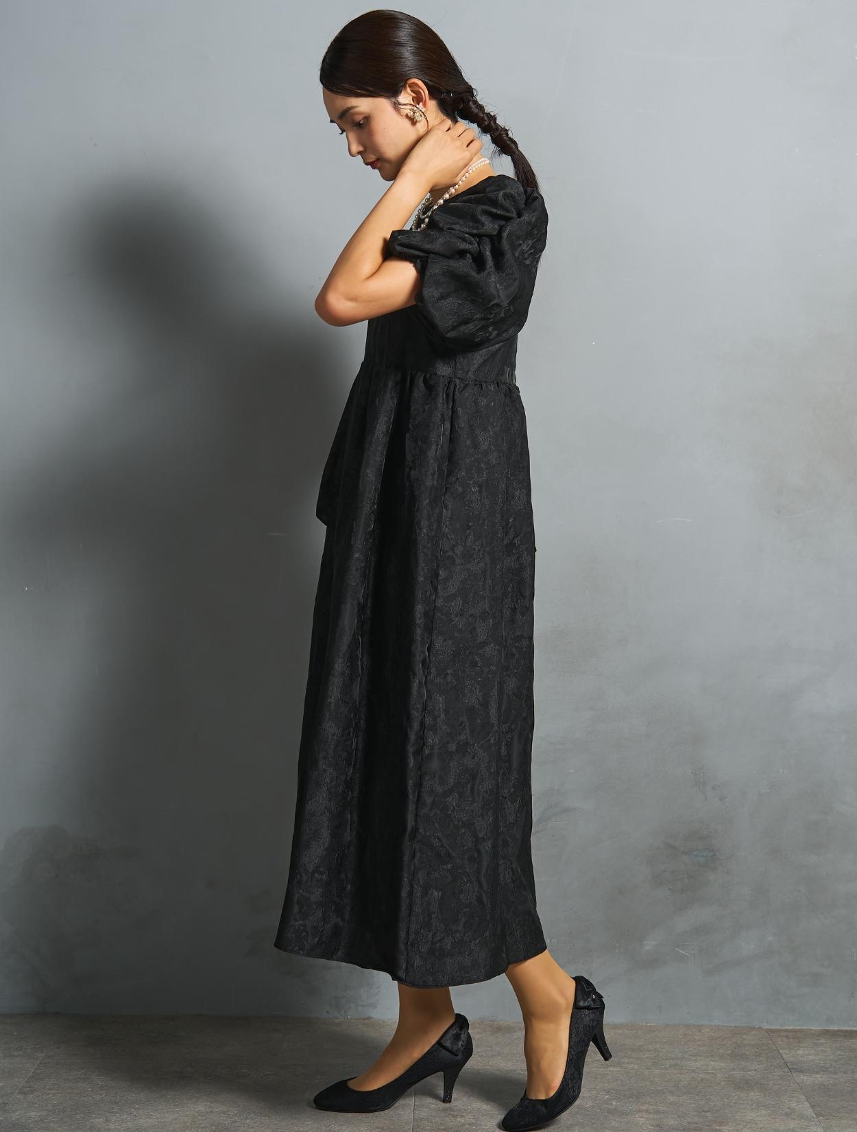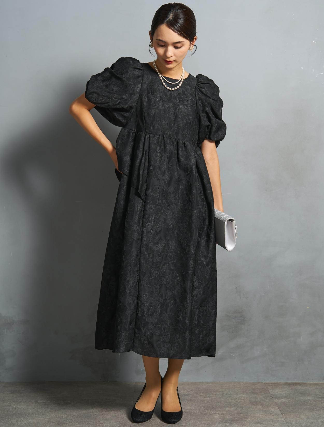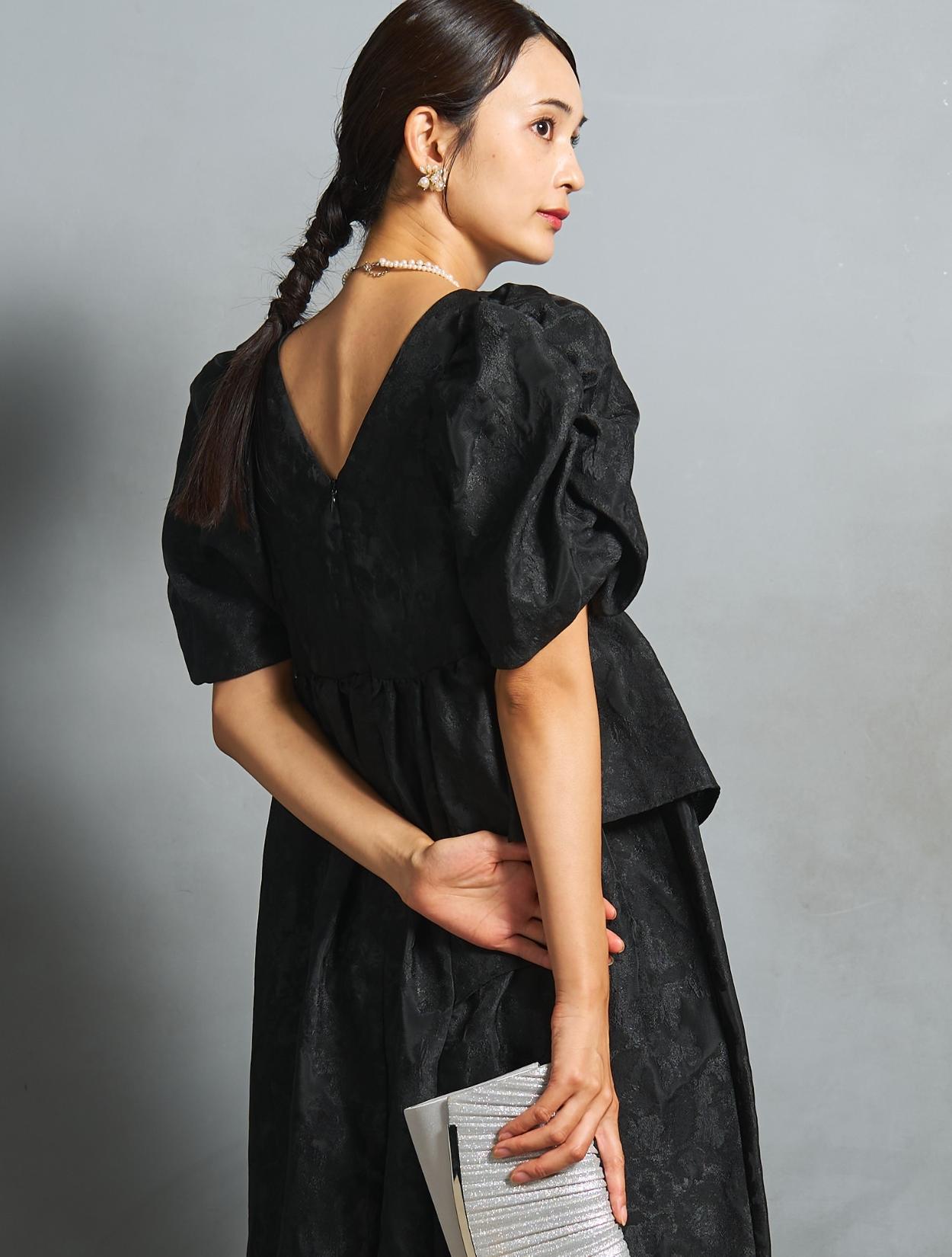 光沢のある糸を織り交ぜた、高級感と立体感のあるジャガード生地がポイントのドレス。上品な生地のフォーマル感と、オーバーシルエットのボリューム感のバランスが絶妙。今っぽくもクラシカルな印象で着こなせます。