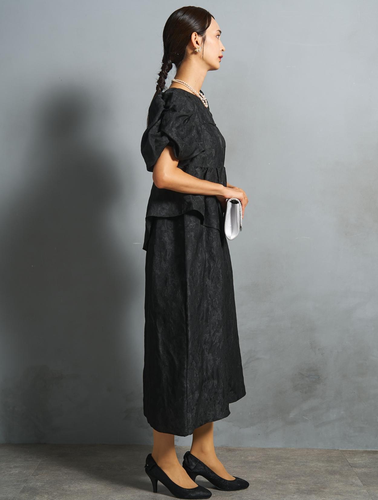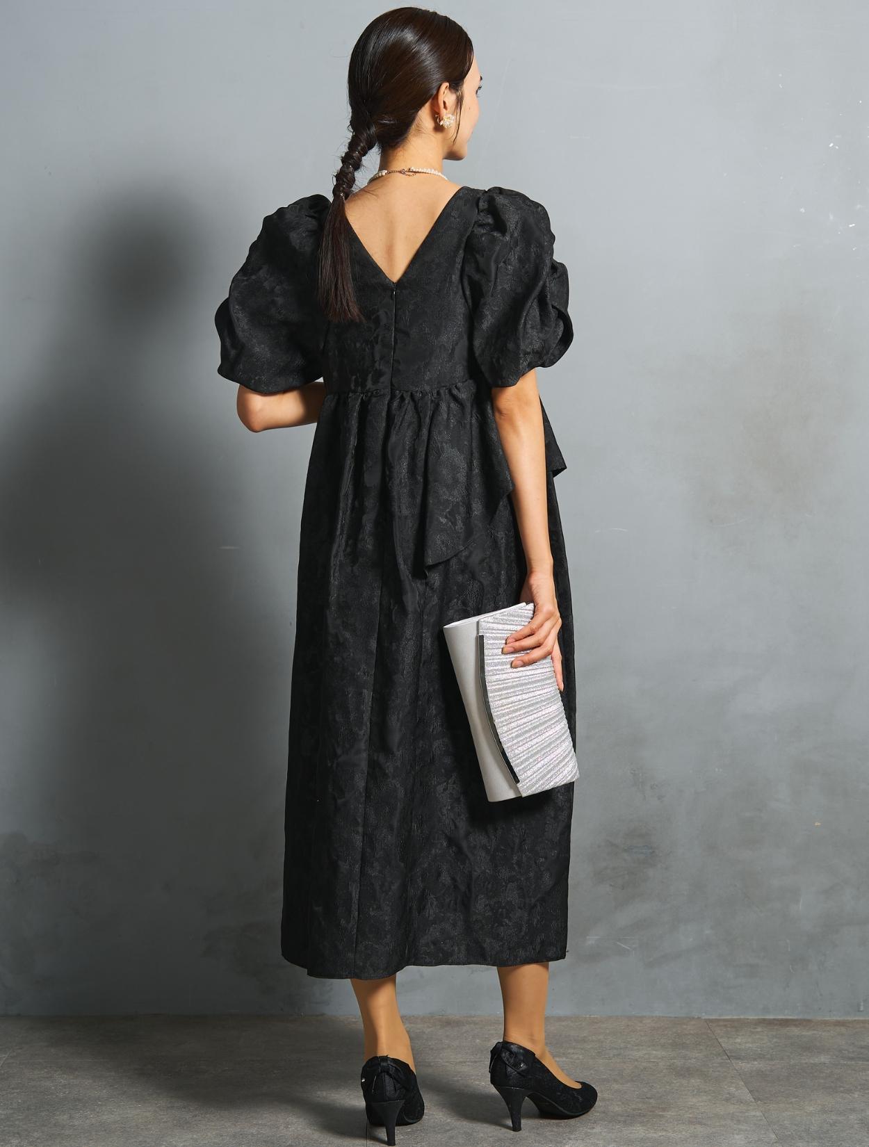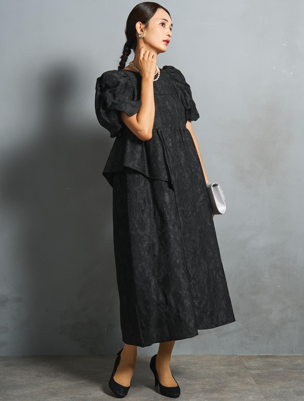 光沢のある糸を織り交ぜた、高級感と立体感のあるジャガード生地がポイントのドレス。上品な生地のフォーマル感と、オーバーシルエットのボリューム感のバランスが絶妙。今っぽくもクラシカルな印象で着こなせます。