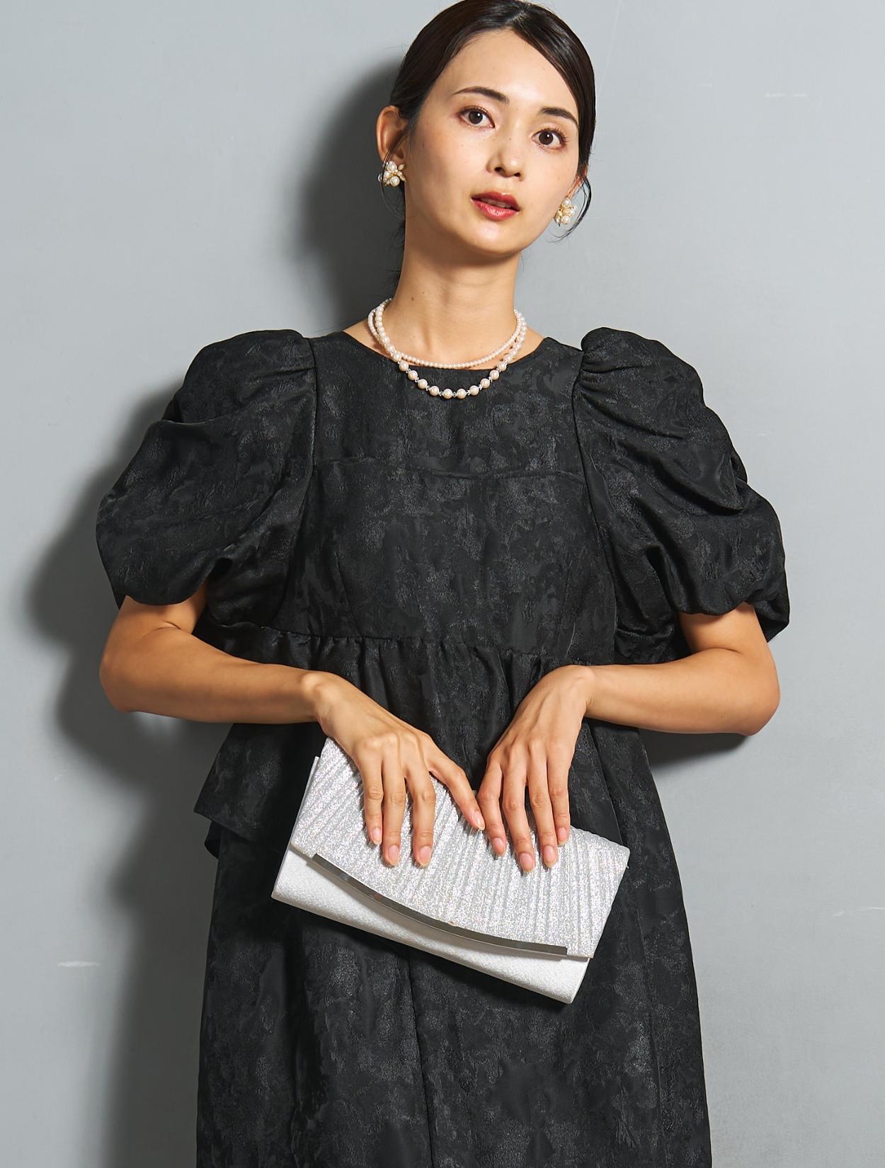 フォーマル感のあるパーティー用のバッグがポイントのコーディネート。きちんと感もあり様々なシーンや立場・年代におすすめです。ブラックに映えるシルバーラメが華やかさをプラスしてくれます。アクセサリーは2連のパールネックレスをセレクト。フォーマル度がUPするので、結婚式でも安心して着られるコーディネートです。シックなドレスのカラーにパールのホワイトが映えて、写真写りも◎。