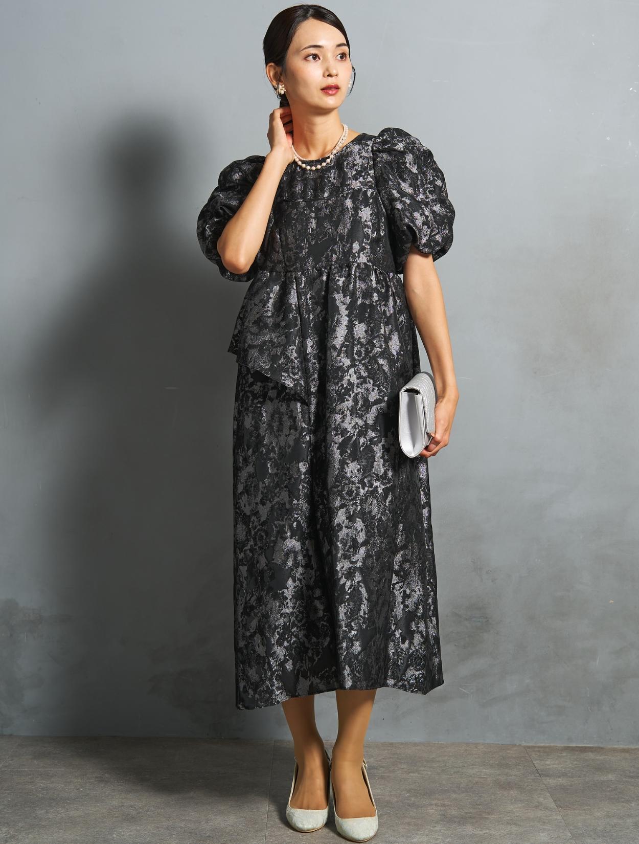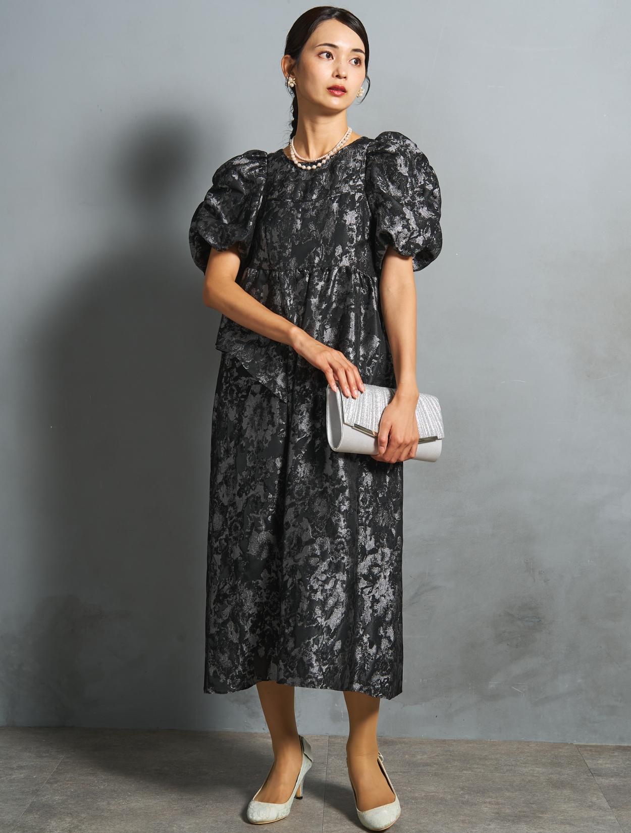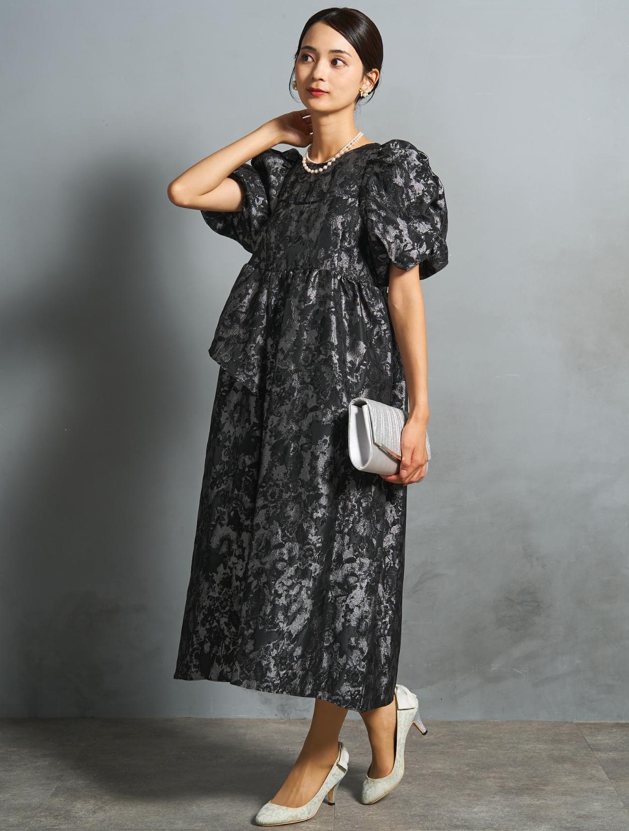 光沢のある糸を織り交ぜた、高級感と立体感のあるジャガード生地がポイントのドレス。上品な生地のフォーマル感と、オーバーシルエットのボリューム感のバランスが絶妙。今っぽくもクラシカルな印象で着こなせます。