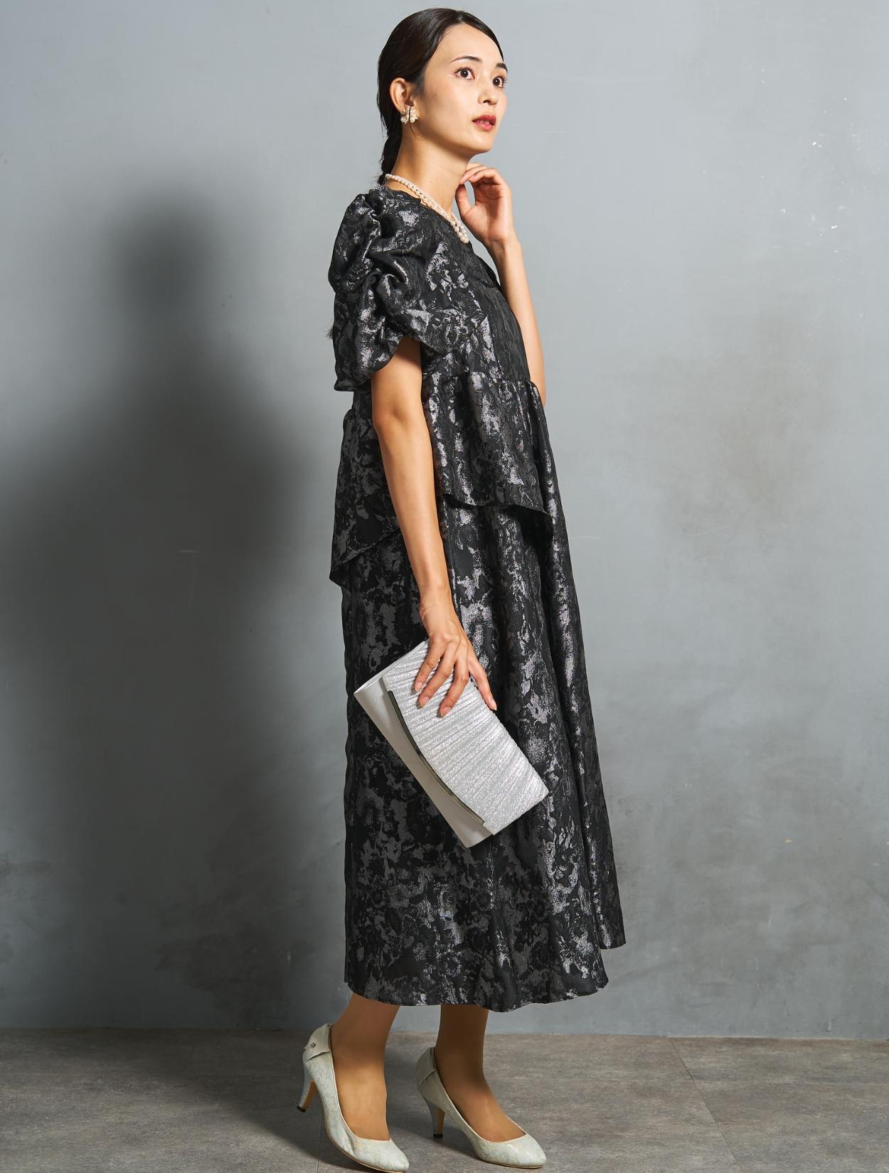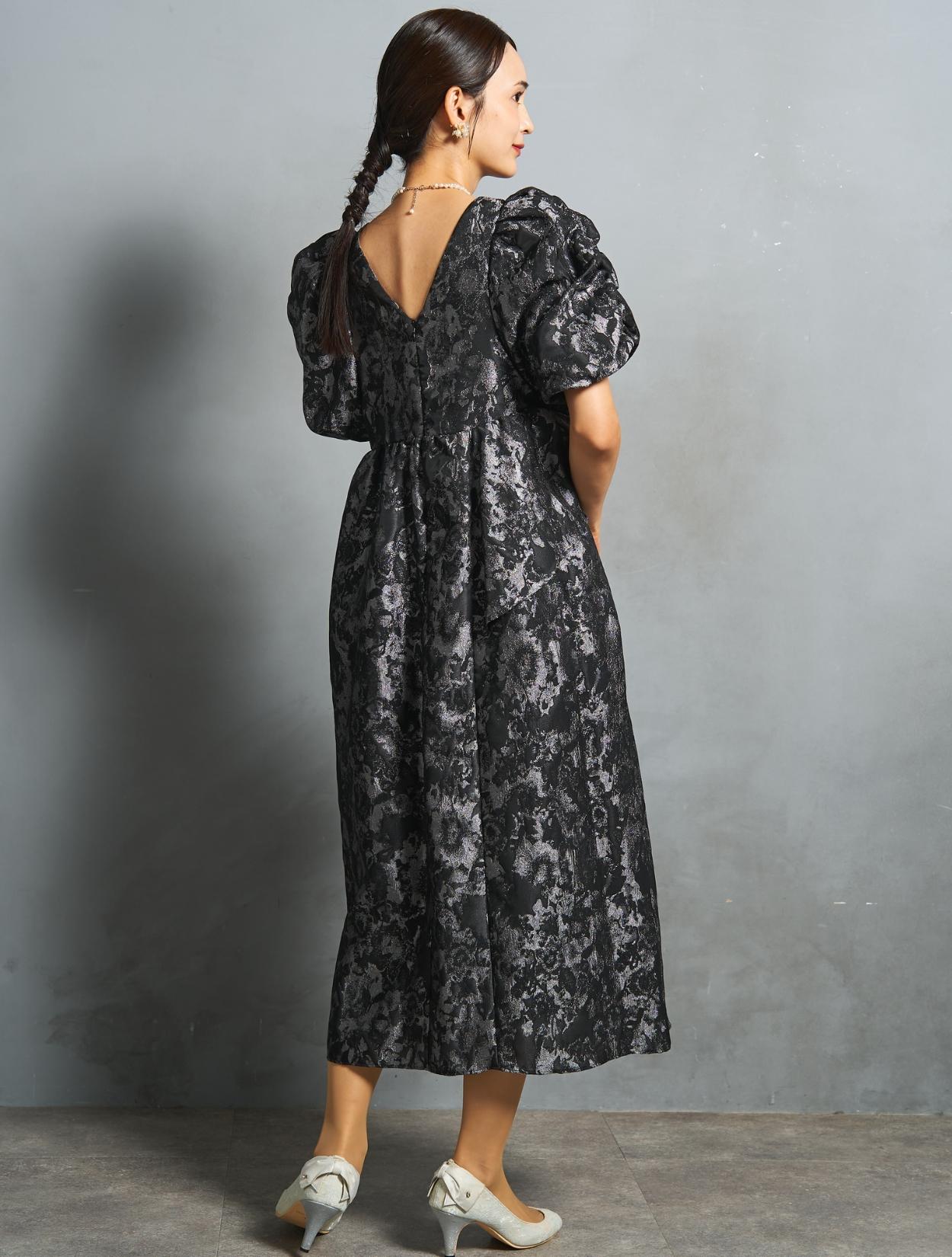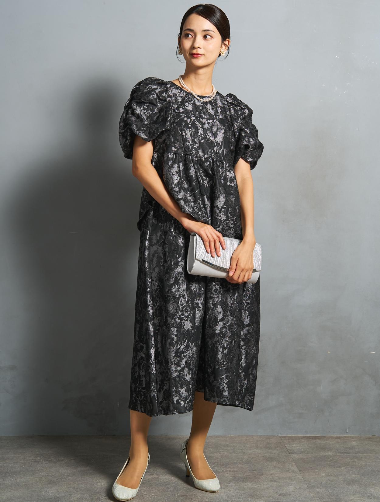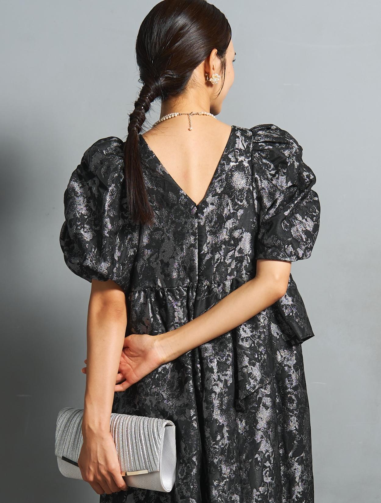 光沢のある糸を織り交ぜた、高級感と立体感のあるジャガード生地がポイントのドレス。上品な生地のフォーマル感と、オーバーシルエットのボリューム感のバランスが絶妙。今っぽくもクラシカルな印象で着こなせます。