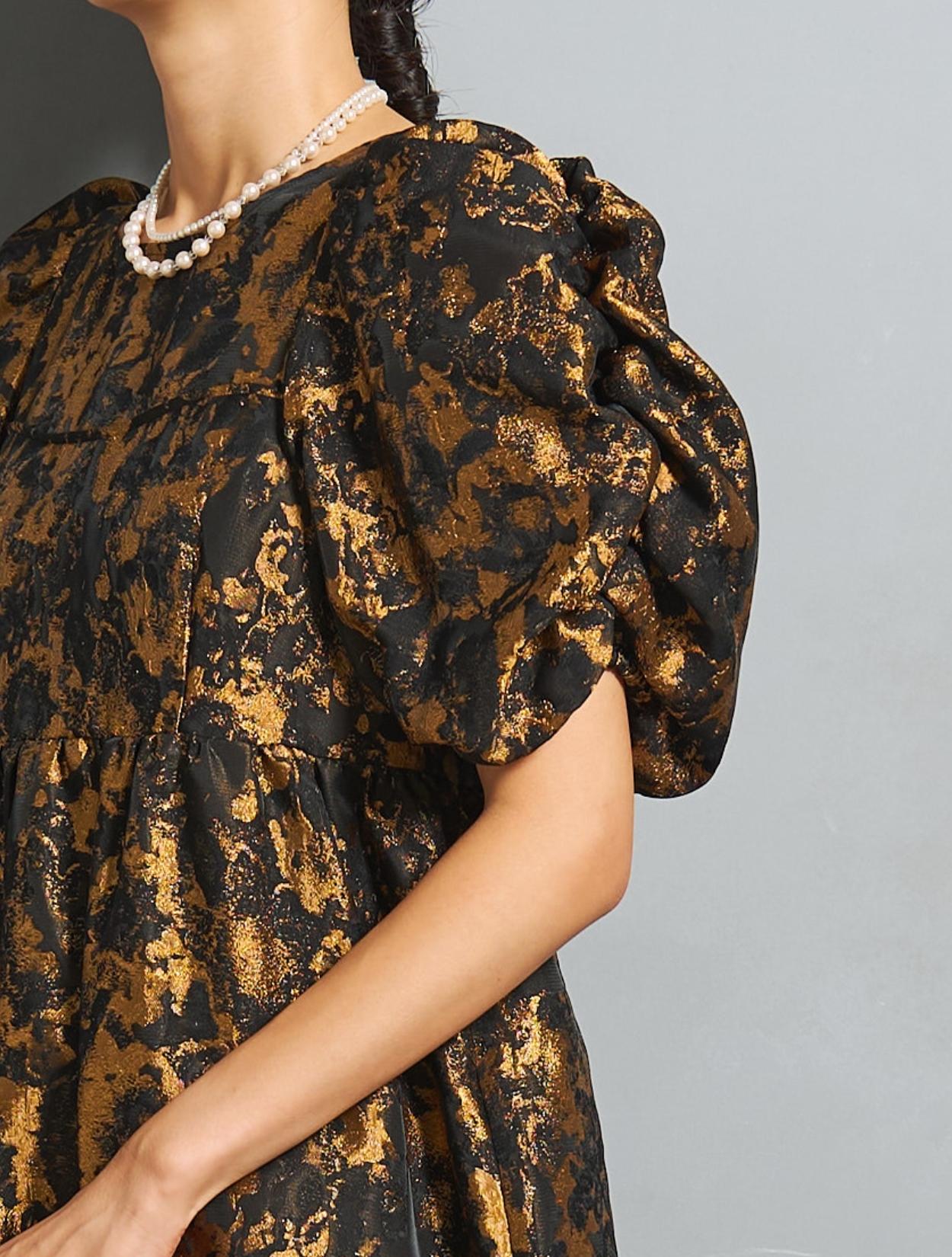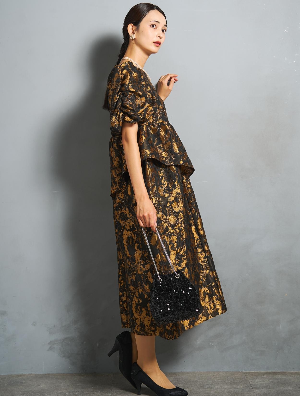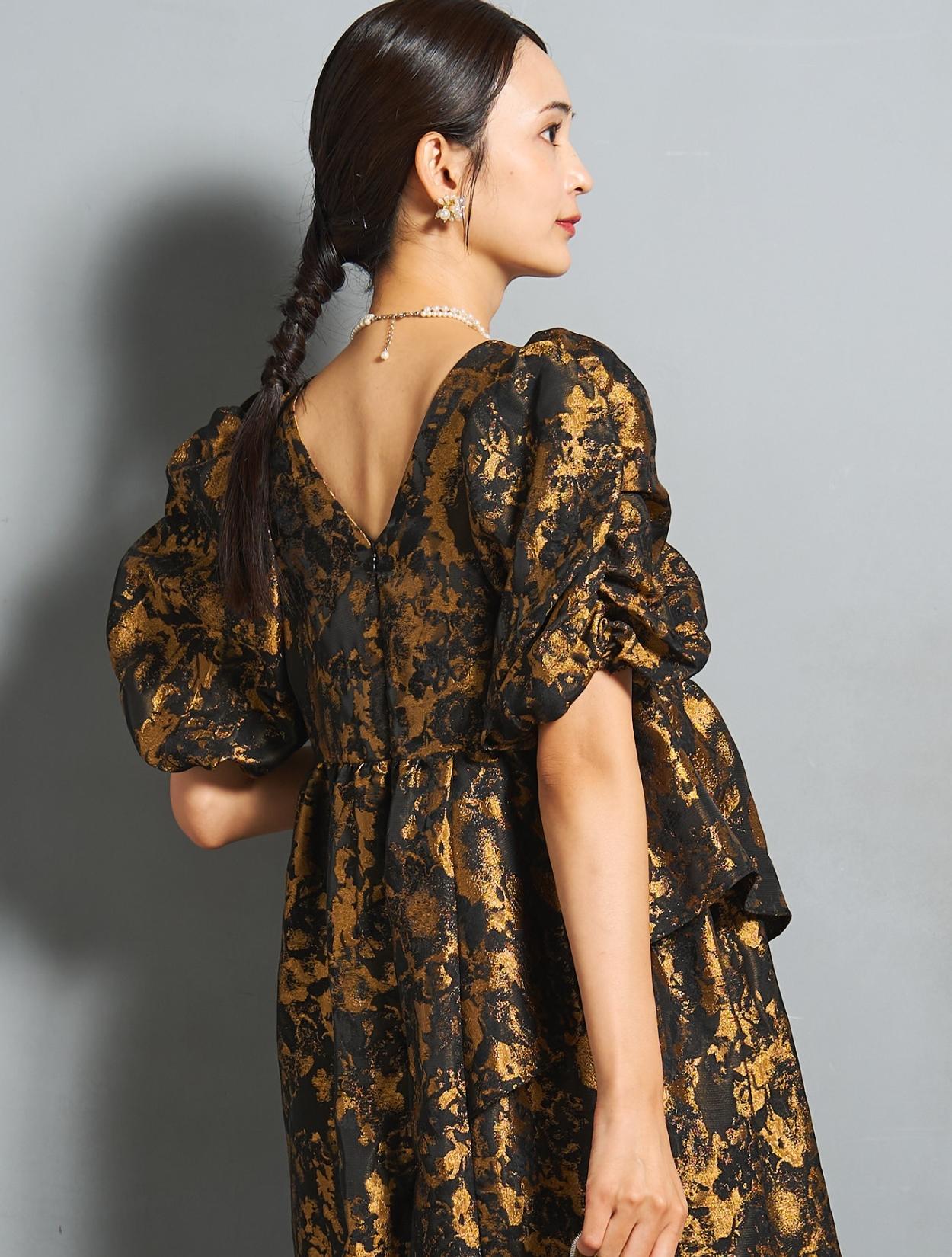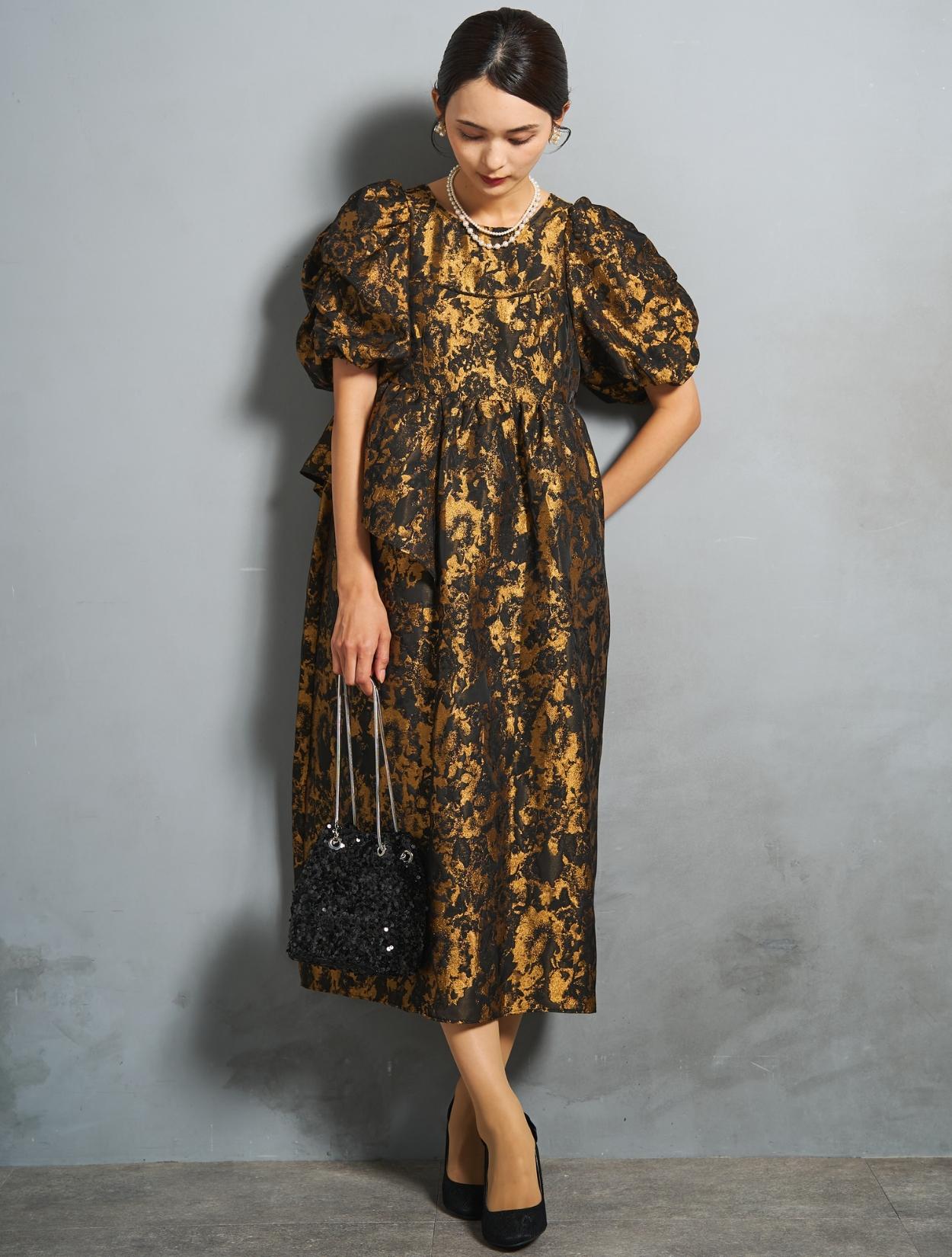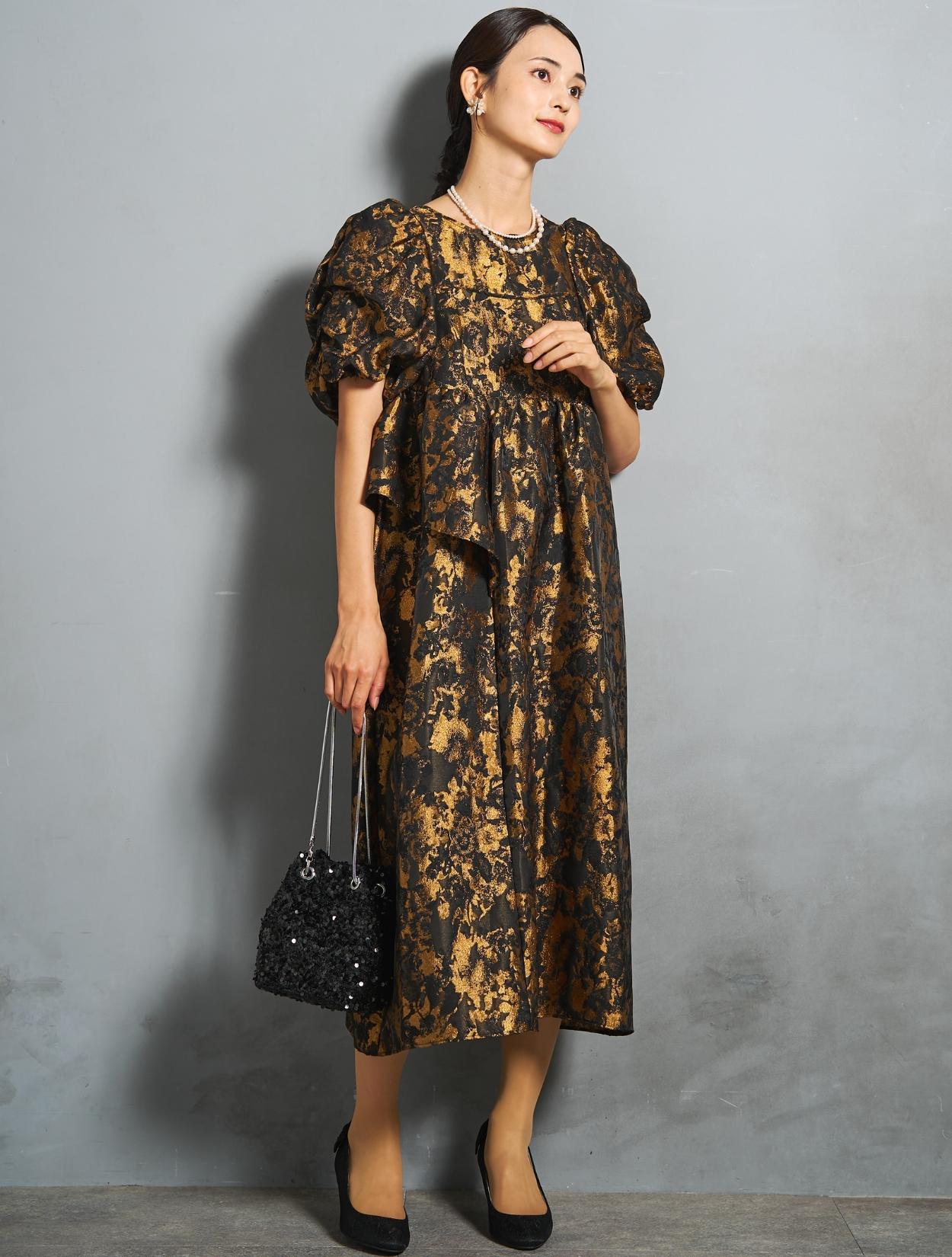 光沢のある糸を織り交ぜた、高級感と立体感のあるジャガード生地がポイントのドレス。上品な生地のフォーマル感と、オーバーシルエットのボリューム感のバランスが絶妙。今っぽくもクラシカルな印象で着こなせます。