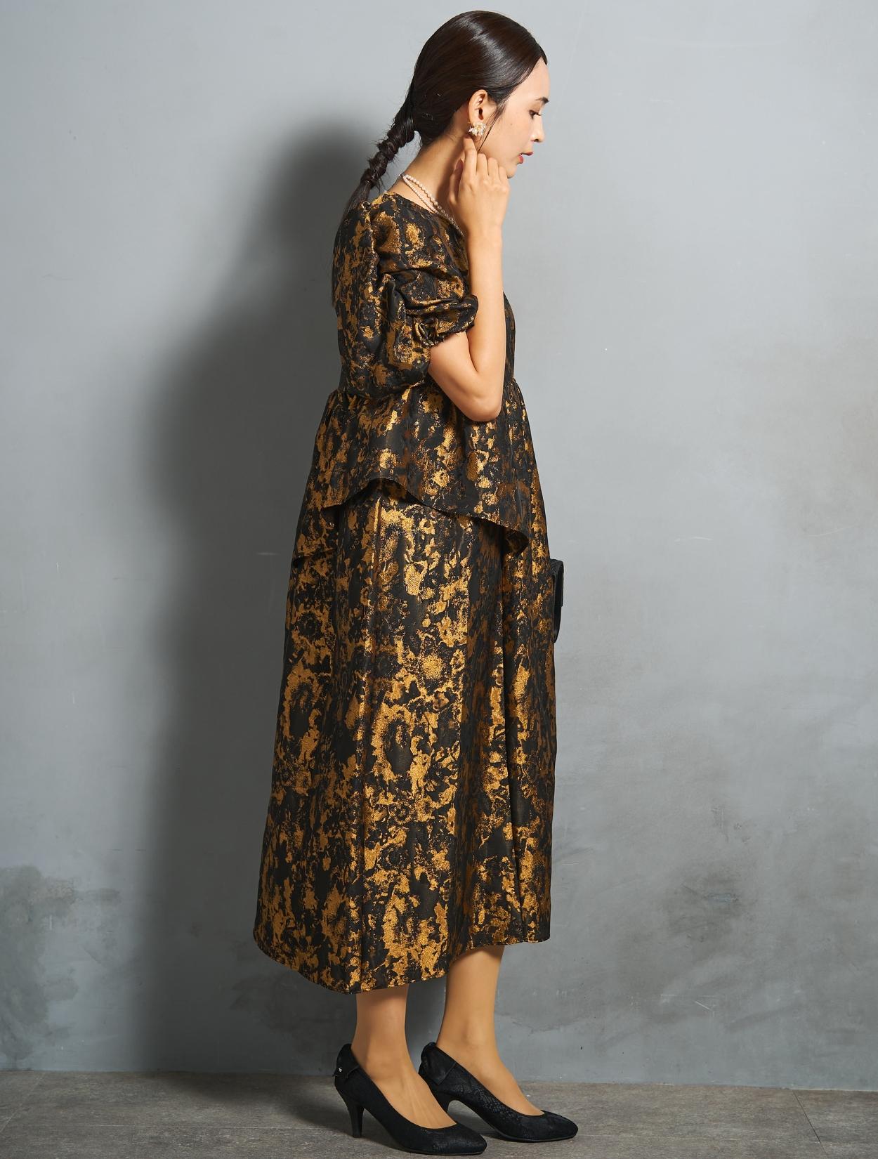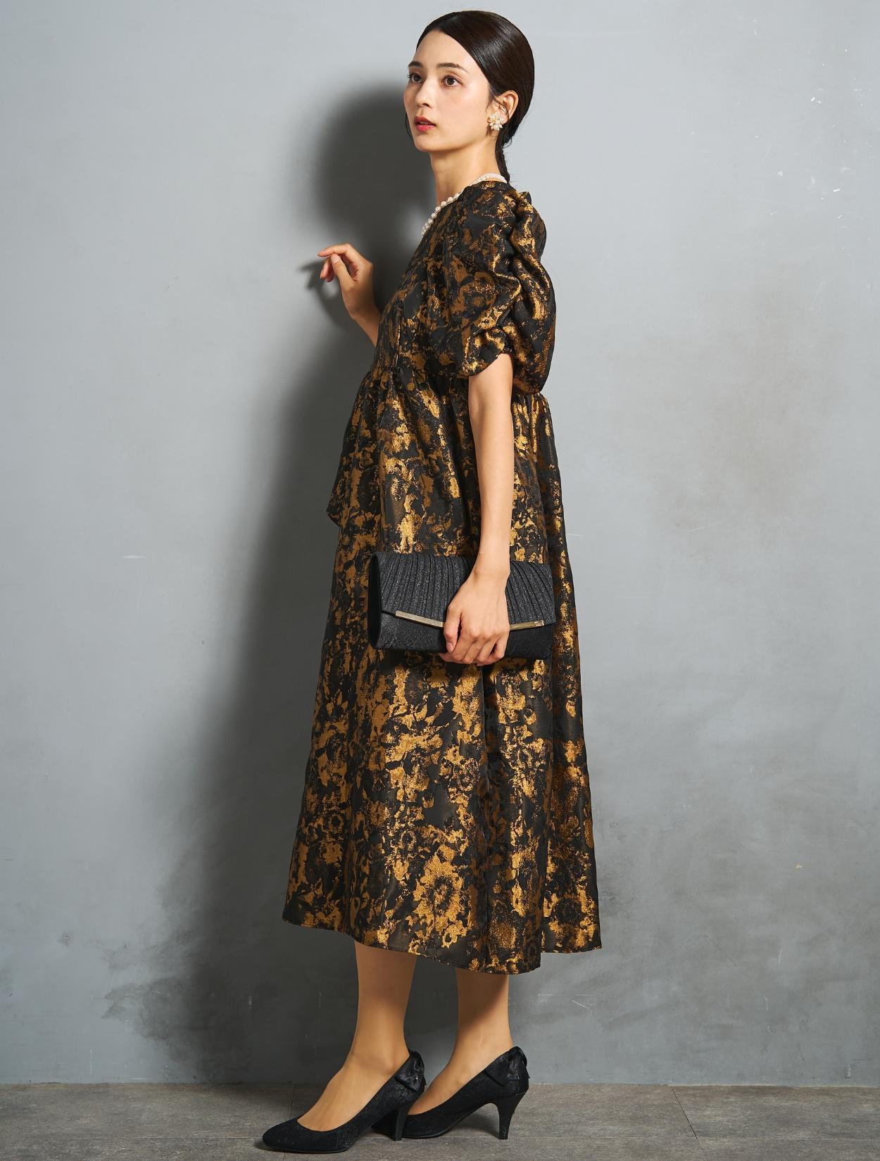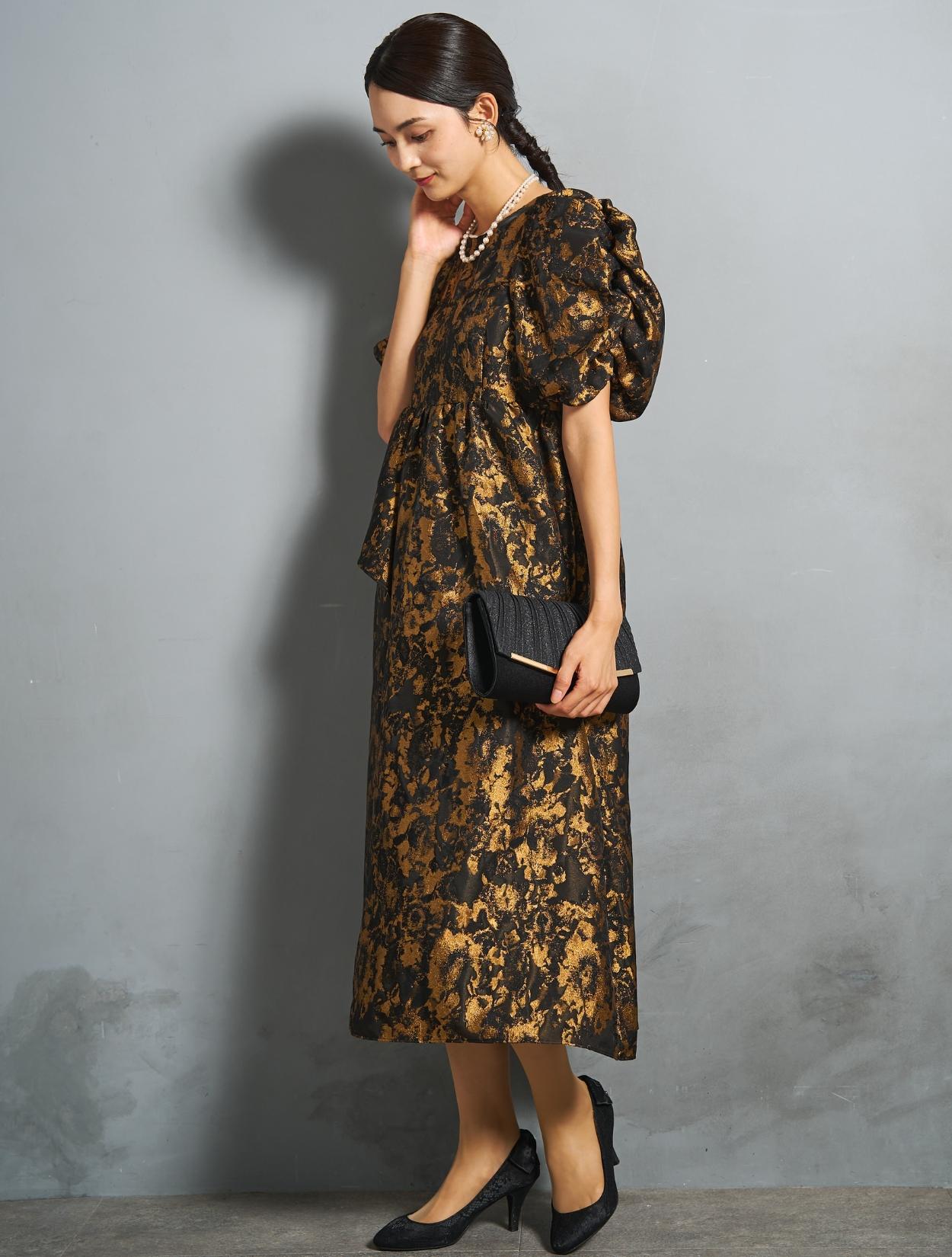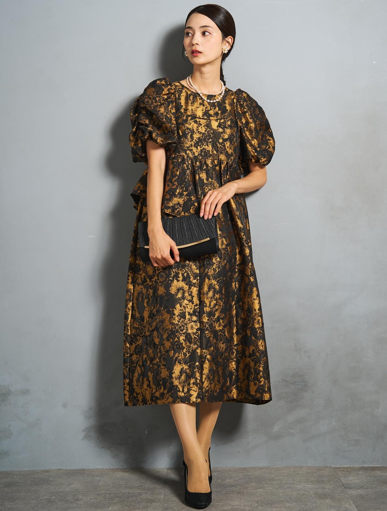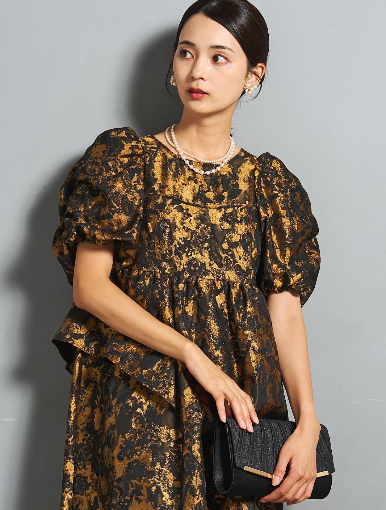光沢のある糸を織り交ぜた、高級感と立体感のあるジャガード生地がポイントのドレス。上品な生地のフォーマル感と、オーバーシルエットのボリューム感のバランスが絶妙。今っぽくもクラシカルな印象で着こなせます。