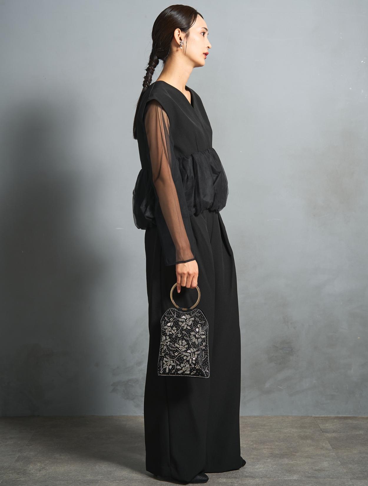 かっこいいパンツドレスに、サテン刺繍バッグが上品なフォーマルさを演出してくれる結婚式におすすめのコーディネート。刺繍の柄が華やかでブラックのパンツドレスに映えます。Vネックのデザインを生かすために、ネックレスではなくイヤリングをセレクト。華やかさとフォーマル感のあるパールとクリスタルビジューのイヤリングは、パンツドレスをパーティー仕様にアップデートしてくれます。