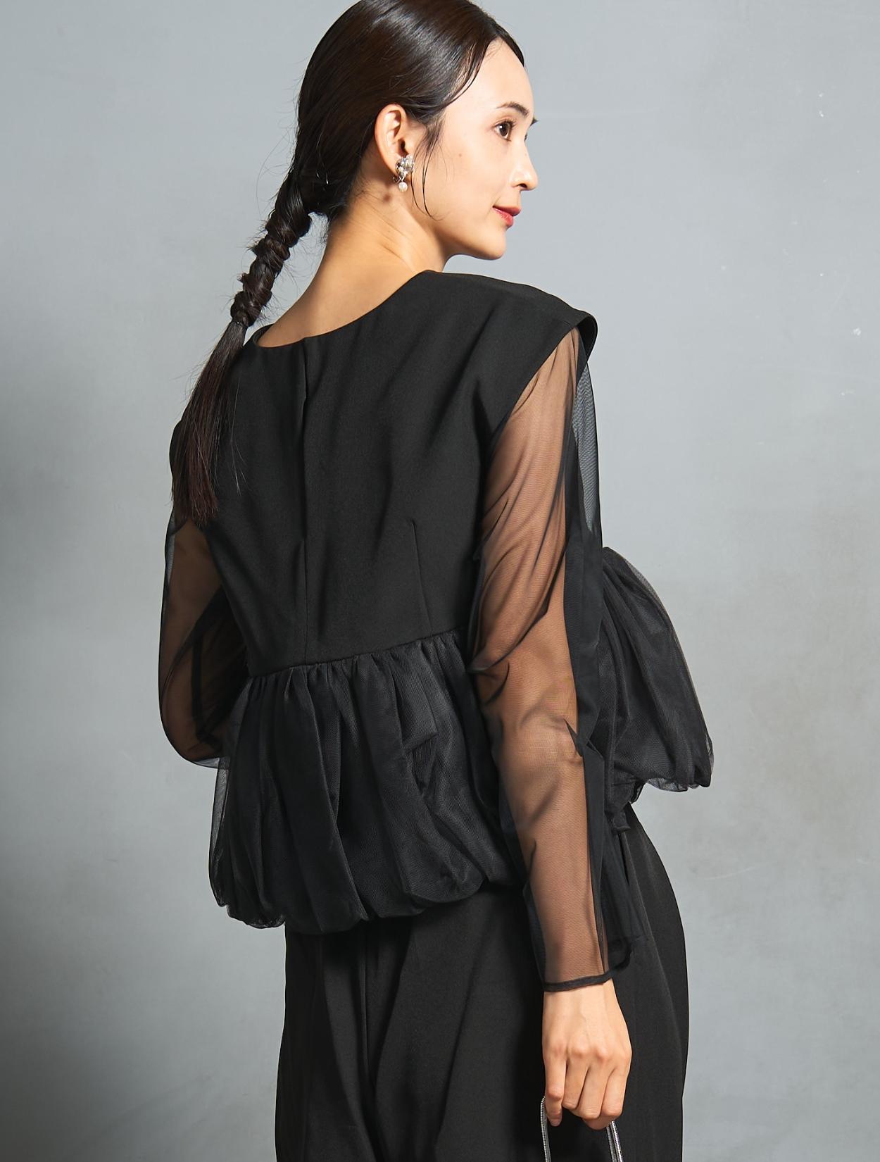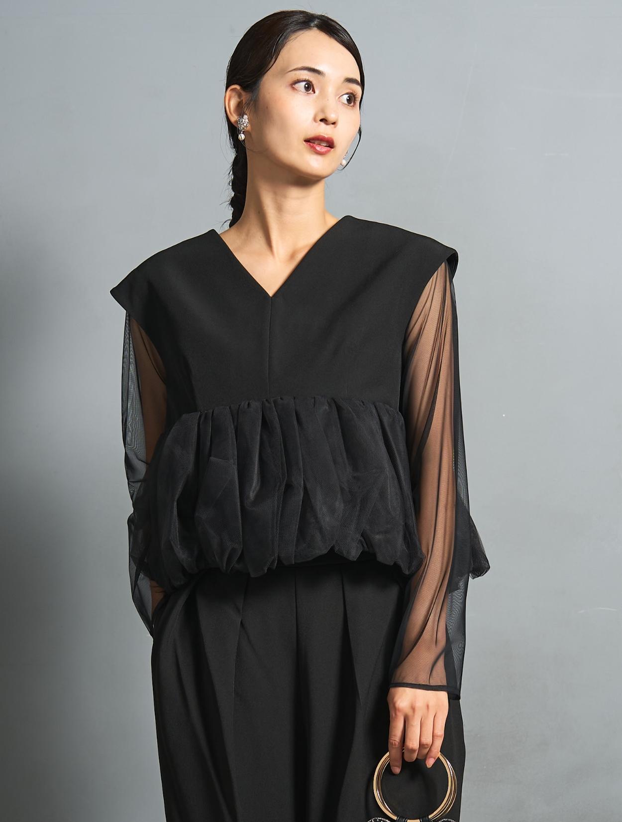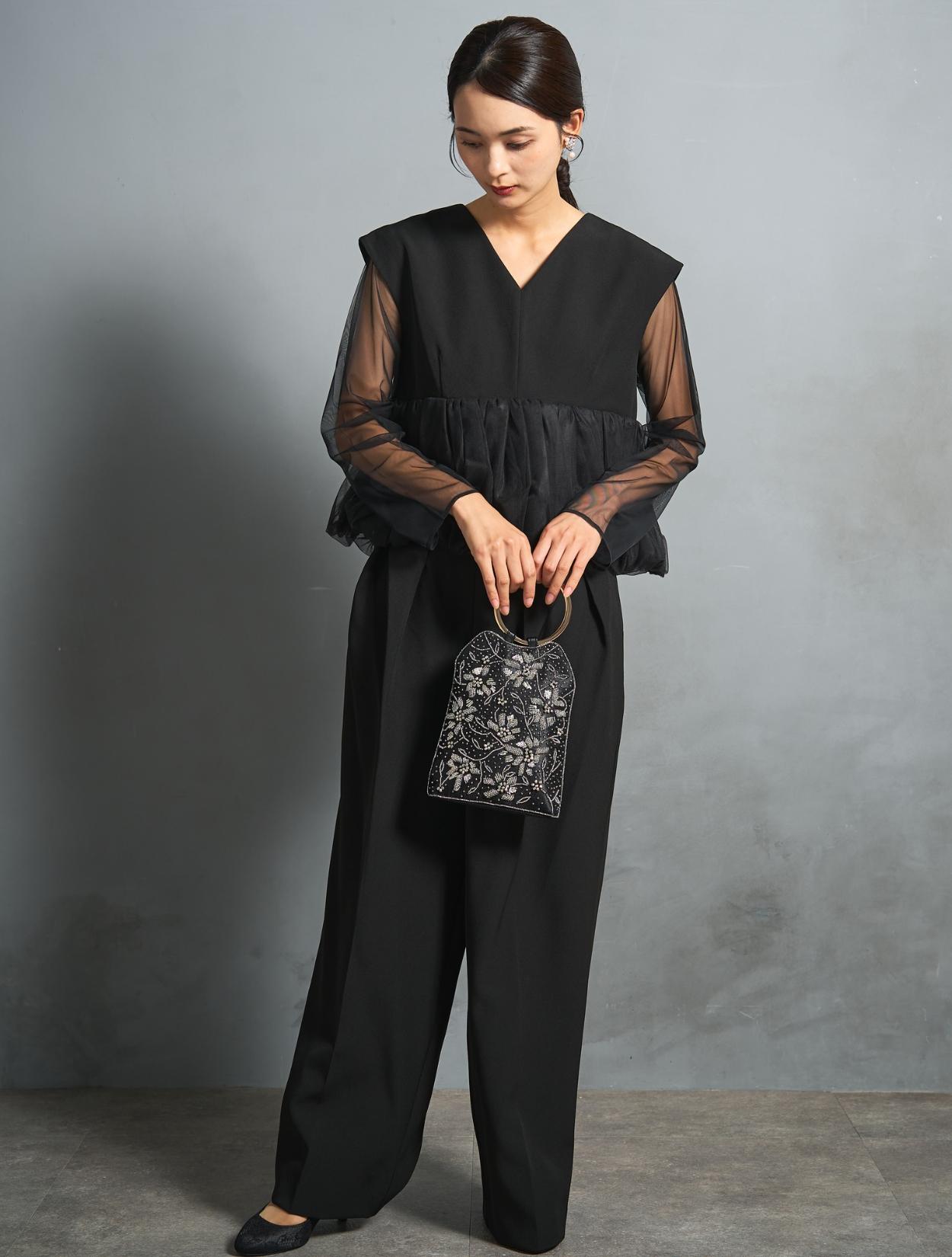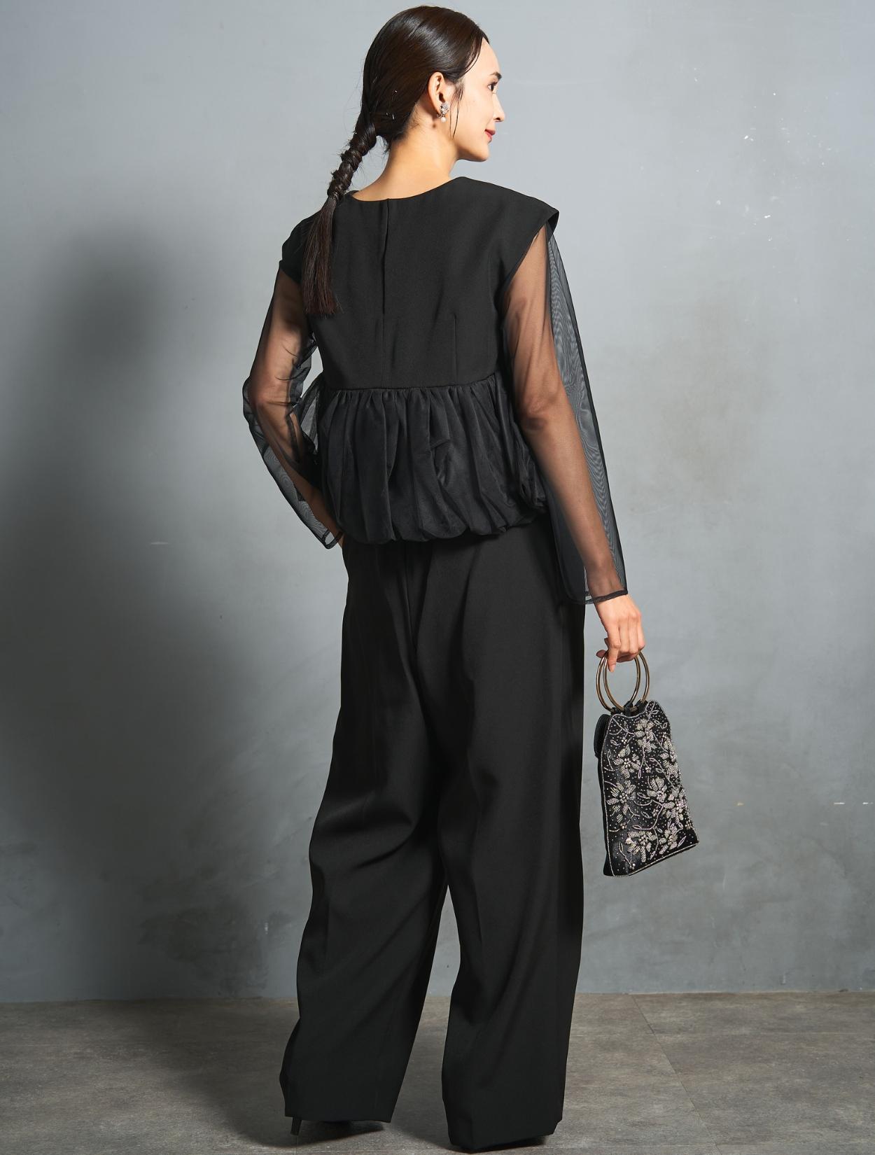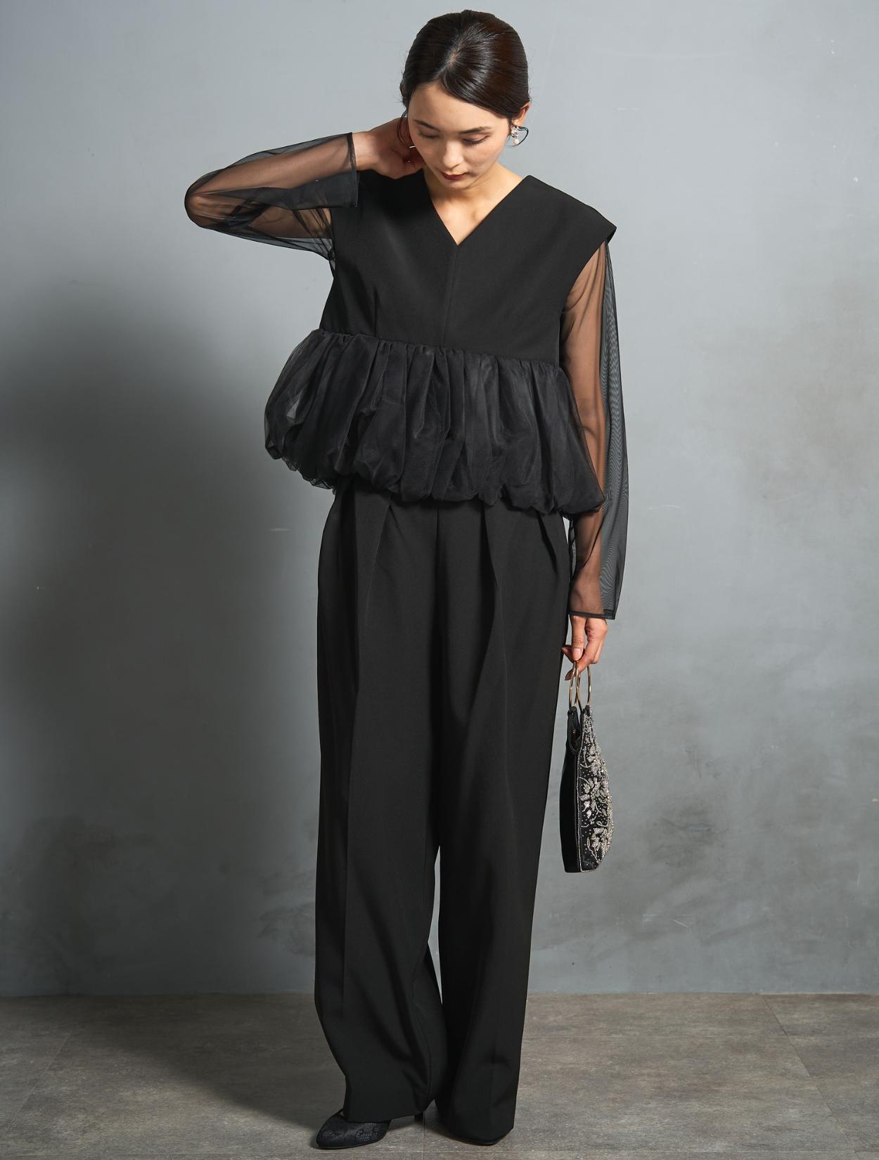 チュールのボリュームペプラムがポイントのパンツドレス。かっこいいパンツスタイルに、大人かわいいディテールを入れたこなれ感のある着こなしができます。高い位置での切り替えは脚長効果も抜群。