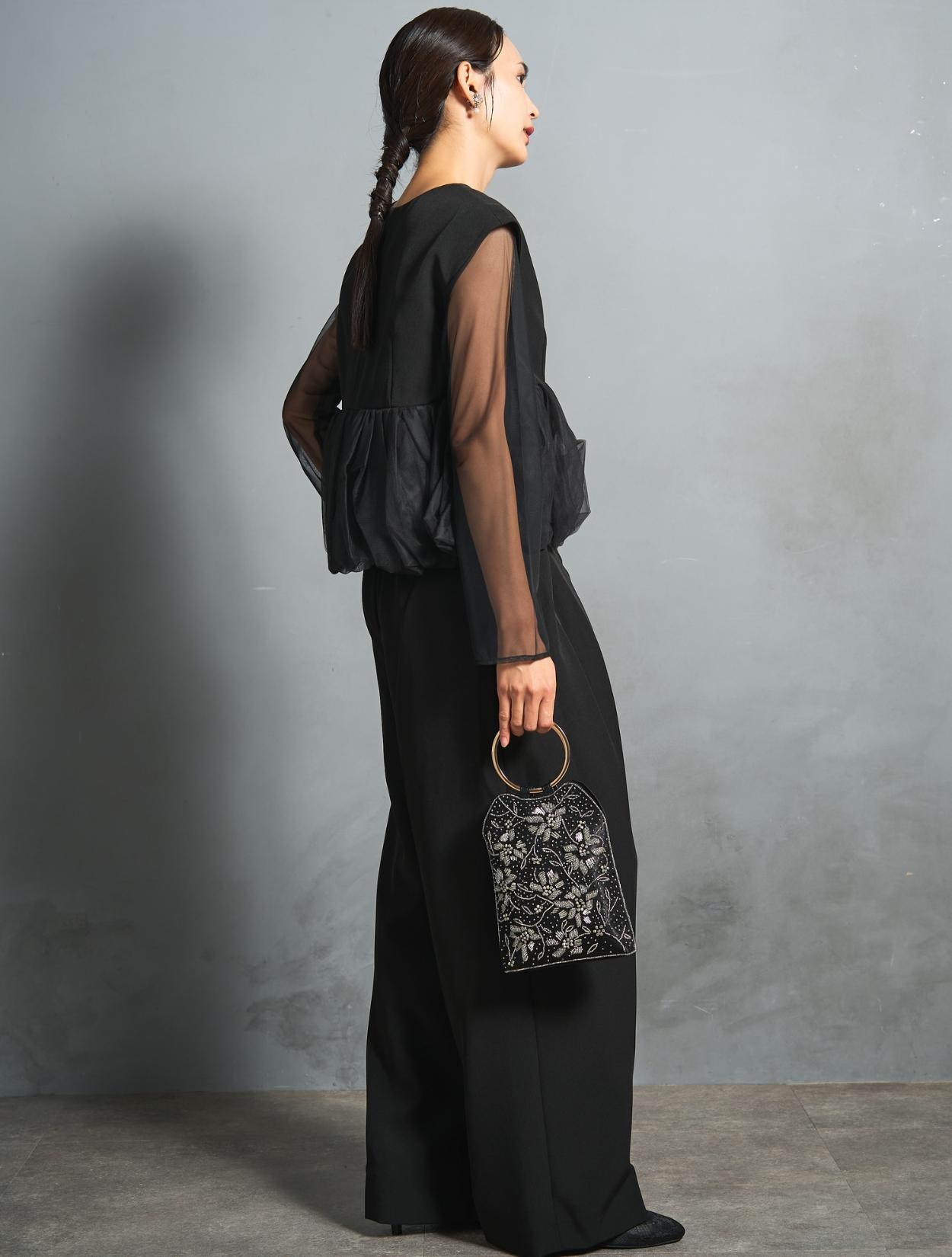 シックでかっこいいブラックカラー。軽さと透け感のあるチュールのブラックとのコンビで、どこか女性らしい印象もあり。フォーマルなシーンで活躍する万能カラーです。