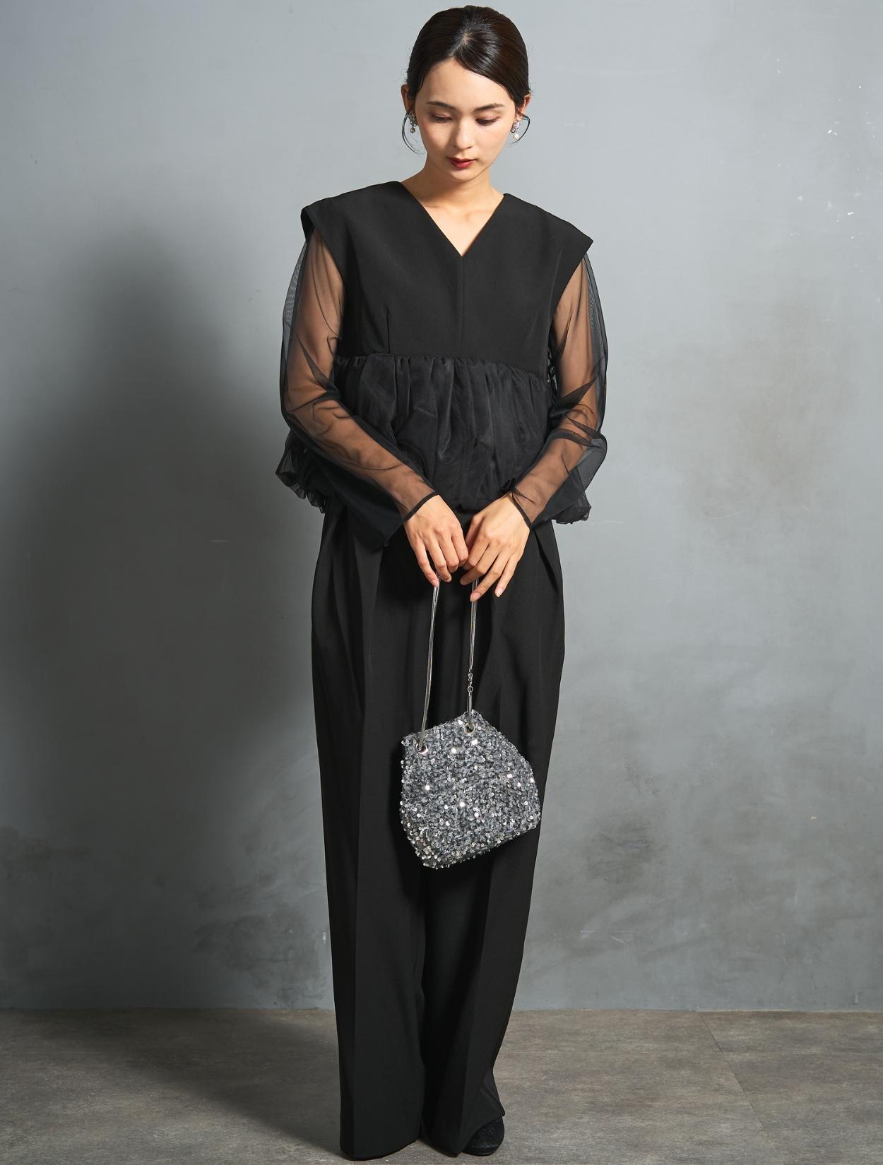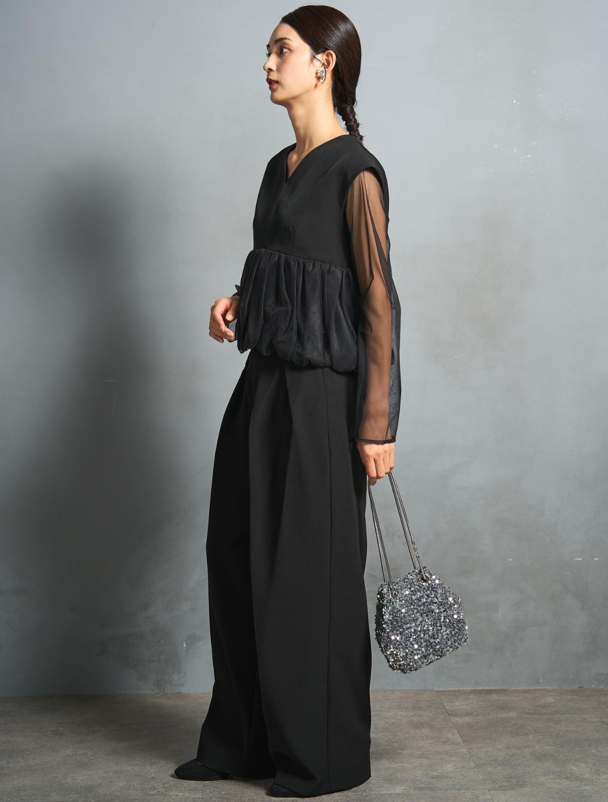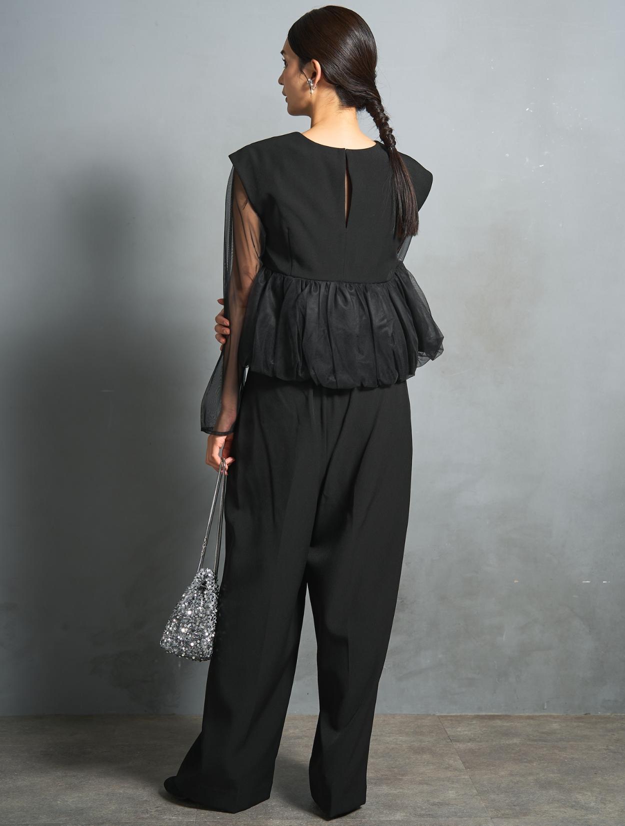 チュールのボリュームペプラムがポイントのパンツドレス。かっこいいパンツスタイルに、大人かわいいディテールを入れたこなれ感のある着こなしができます。高い位置での切り替えは脚長効果も抜群。