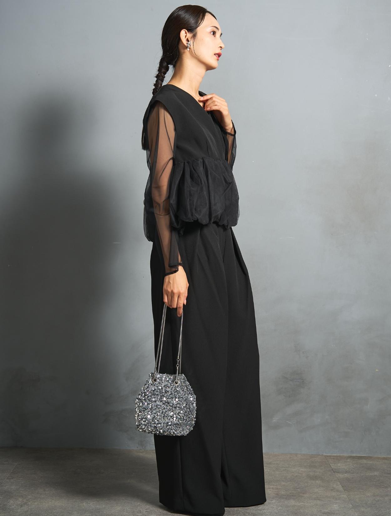 ブラックのパンツドレスにシルバーのスパンコールバッグが映えるトレンドコーデ。巾着バッグのいい意味での程よいラフさは、大人の頑張りすぎないスタイルに。バッグはショルダーにもなるので、両手を空けたいお子様連れにもおすすめです。Vネックのデザインを生かすために、ネックレスではなくイヤリングをセレクト。華やかさとフォーマル感のあるパールとクリスタルビジューのイヤリングは、パンツドレスをパーティー仕様にアップデートしてくれます。