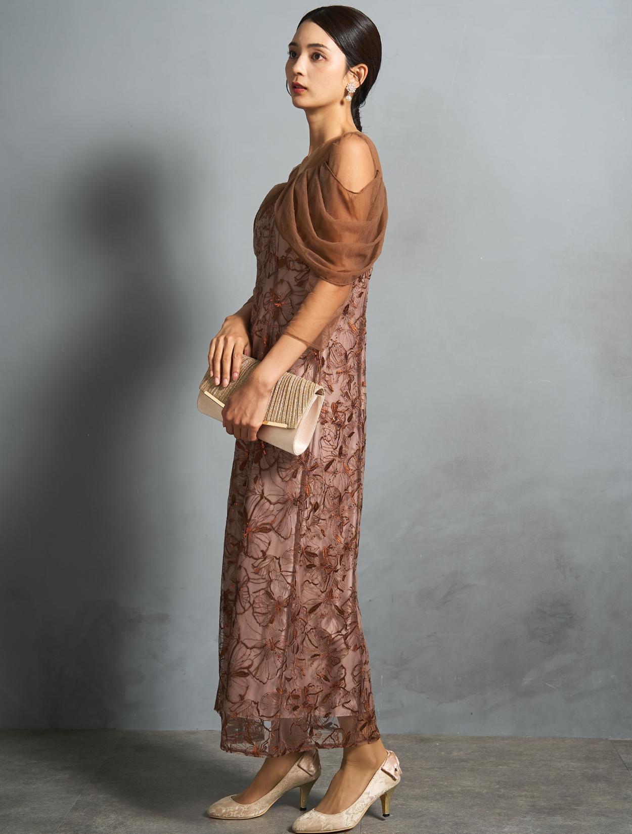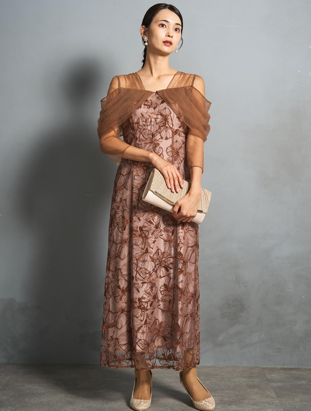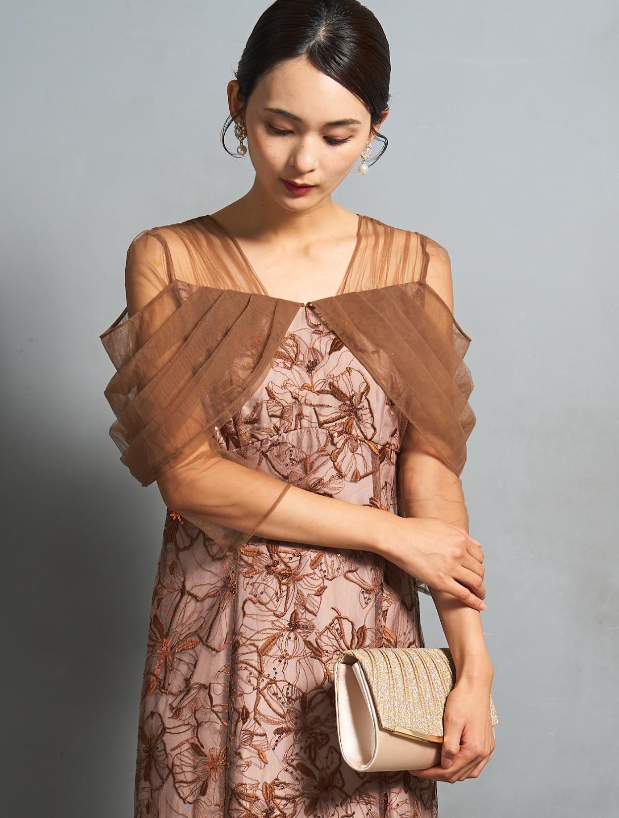 上品で派手過ぎないブラウンカラーに、ゴールドベージュのバッグで華やかなパーティー仕様に。ブラウンとベージュは同系色なので、優しくまろやかな印象で着こなせます。上半身にデザインがあるドレスなので、アクセサリーはイヤリングがおすすめ。少し大ぶりなホワイトパールのフラワーイヤリングが、お顔回りを華やかにしてくれます。ゴールド系なのでドレスカラーにもぴったりです。