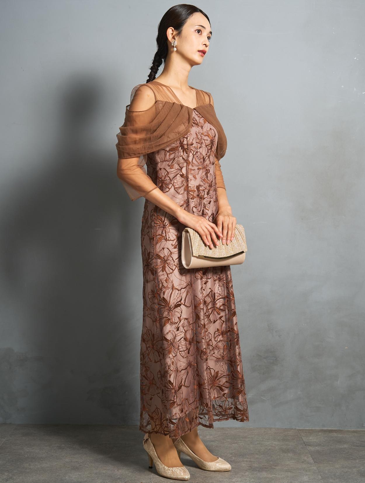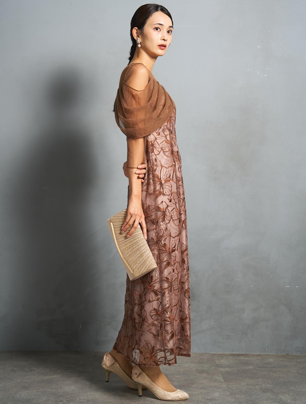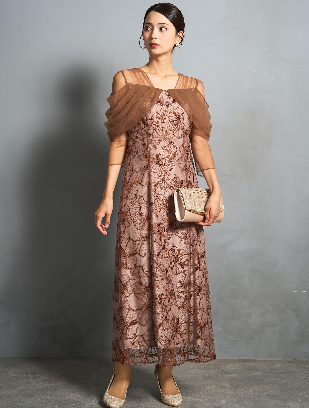 上品で派手過ぎないブラウンカラーに、ゴールドベージュのバッグで華やかなパーティー仕様に。ブラウンとベージュは同系色なので、優しくまろやかな印象で着こなせます。上半身にデザインがあるドレスなので、アクセサリーはイヤリングがおすすめ。少し大ぶりなホワイトパールのフラワーイヤリングが、お顔回りを華やかにしてくれます。ゴールド系なのでドレスカラーにもぴったりです。