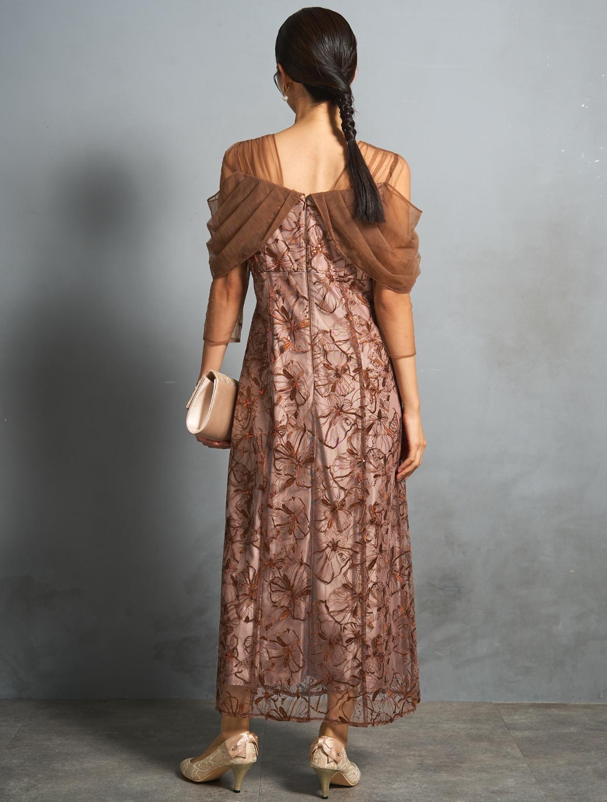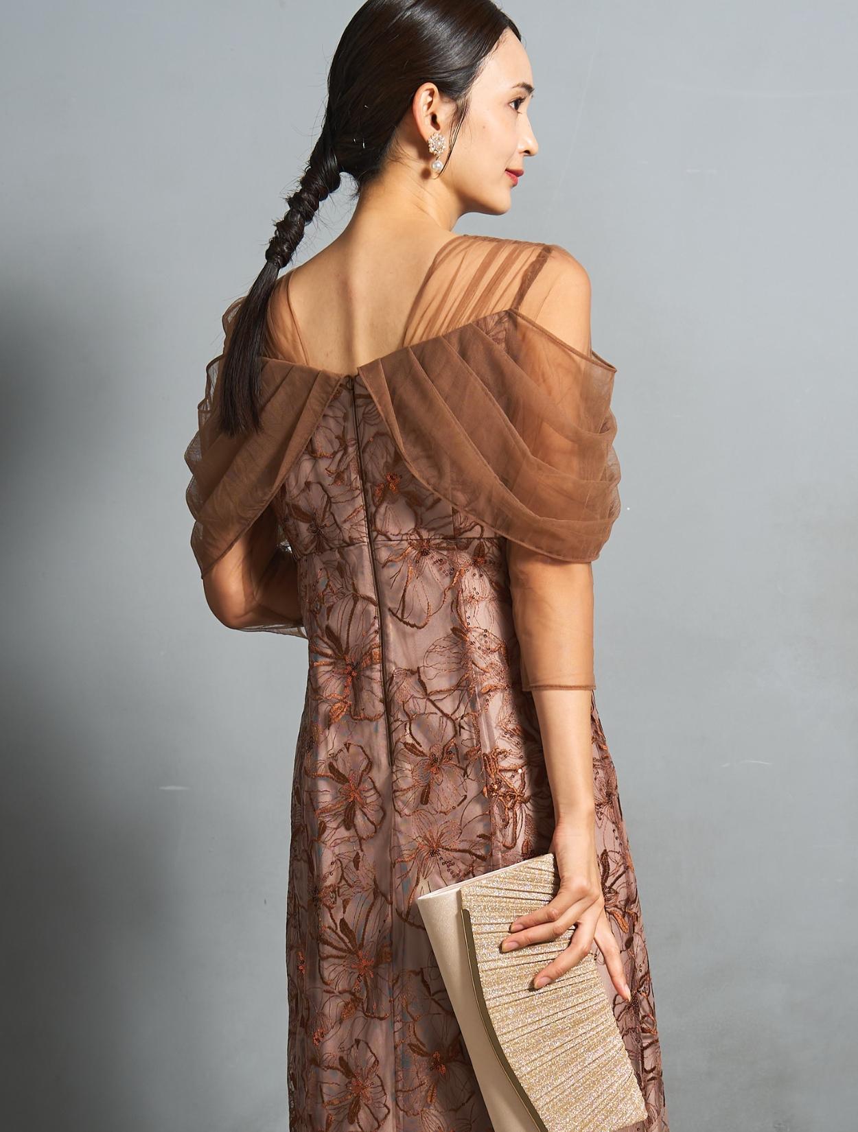 人気のスパンコール刺繍レースのシリーズドレス。ふんわりエアリーなソフトチュールのオフショルダーが目を惹きます。程よくフェミニンなテイストが、大人かわいいを叶えてくれます。透け感のあるシアースリーブですが、気になる二の腕はソフトチュールでしっかりカバー。重たく見えないのに隠したいところは隠せる人気のデザインです。