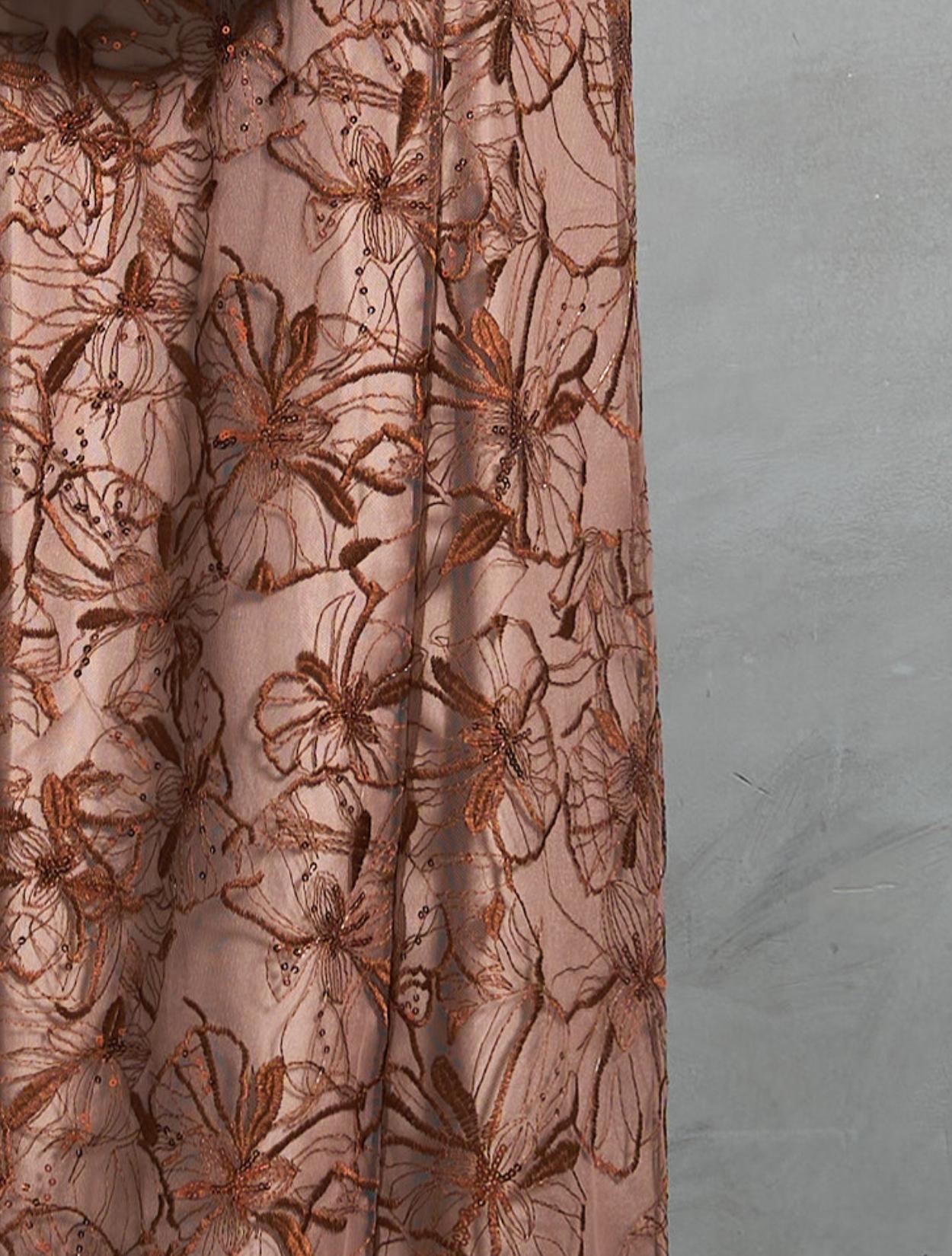 細かいスパンコールが散りばめられたレース生地は、上品な輝きでパーティーなど華やかなシーンにぴったり。