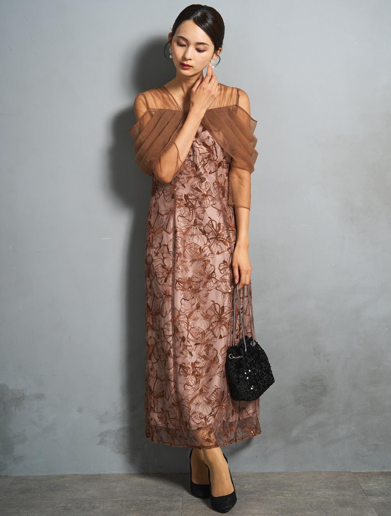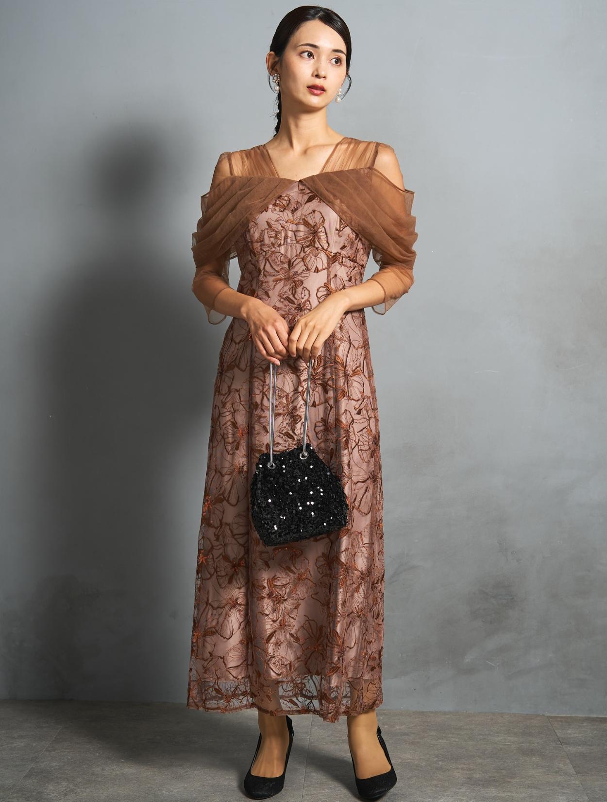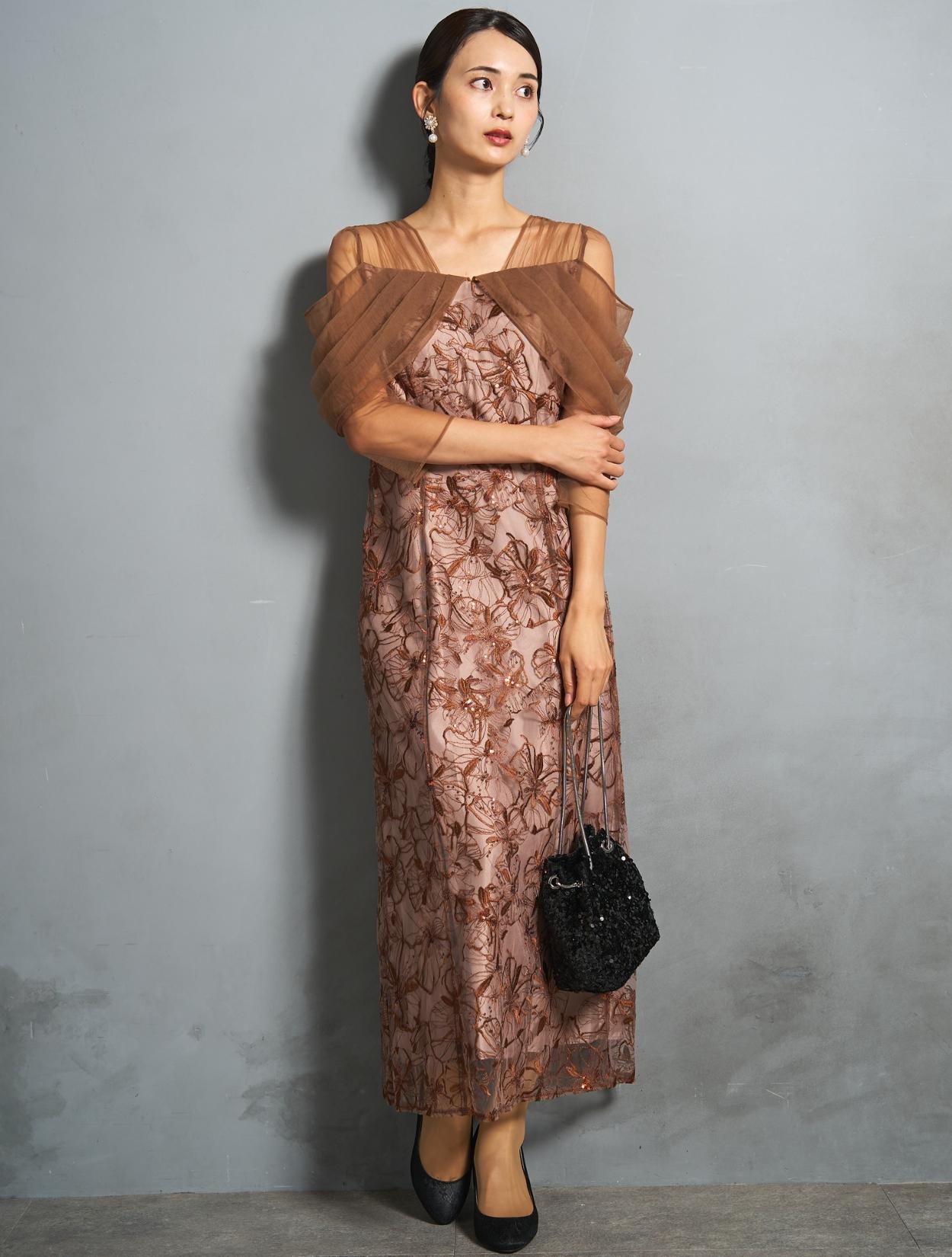 人気のスパンコール刺繍レースのシリーズドレス。ふんわりエアリーなソフトチュールのオフショルダーが目を惹きます。程よくフェミニンなテイストが、大人かわいいを叶えてくれます。透け感のあるシアースリーブですが、気になる二の腕はソフトチュールでしっかりカバー。重たく見えないのに隠したいところは隠せる人気のデザインです。