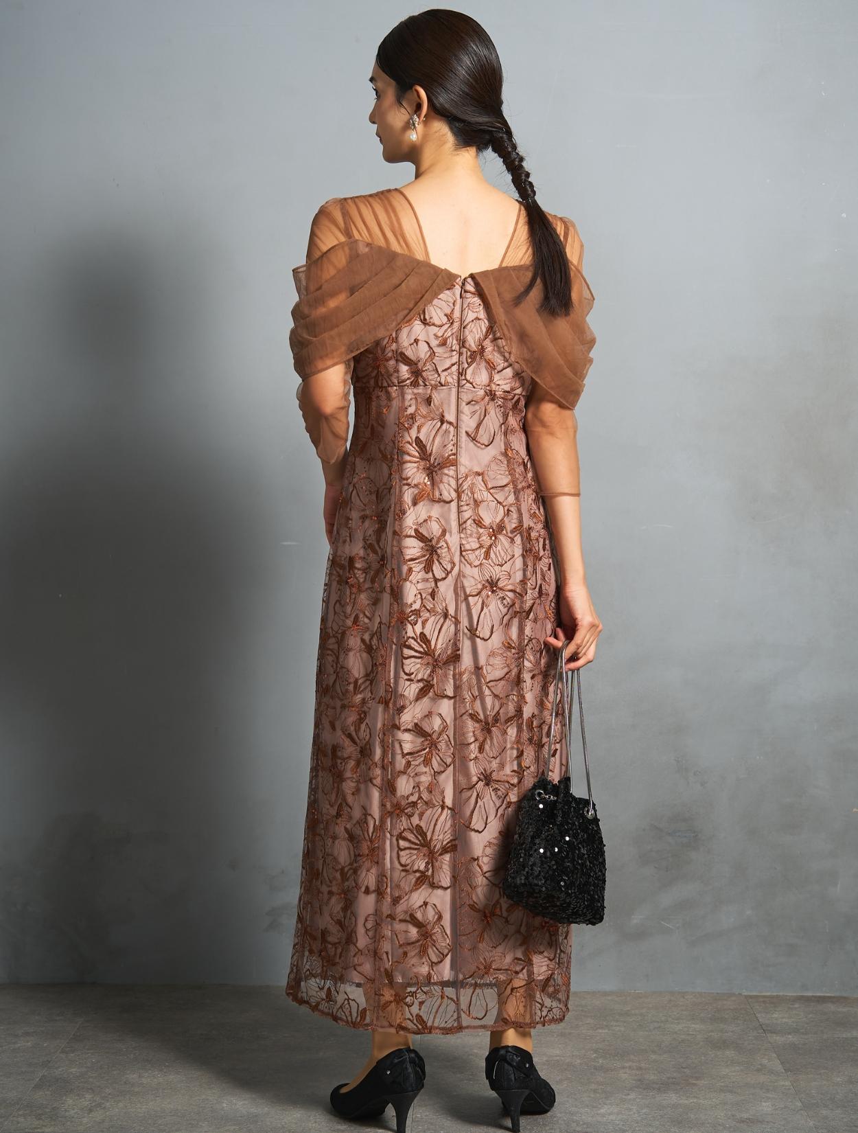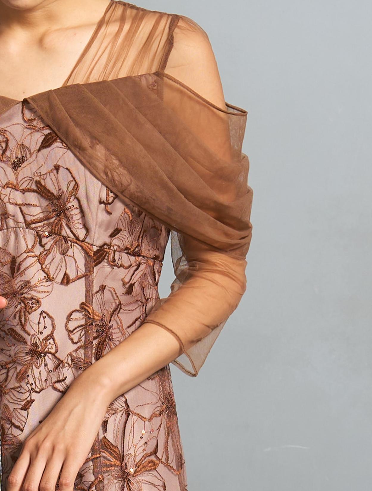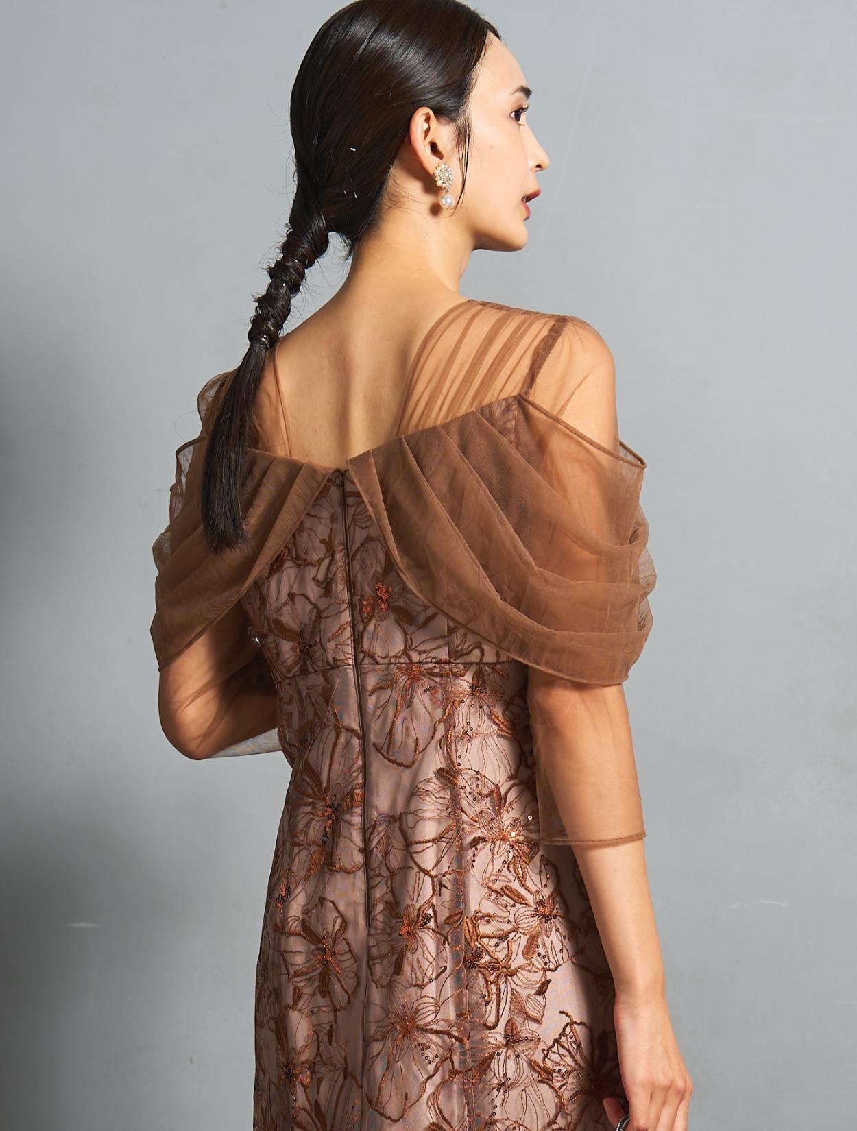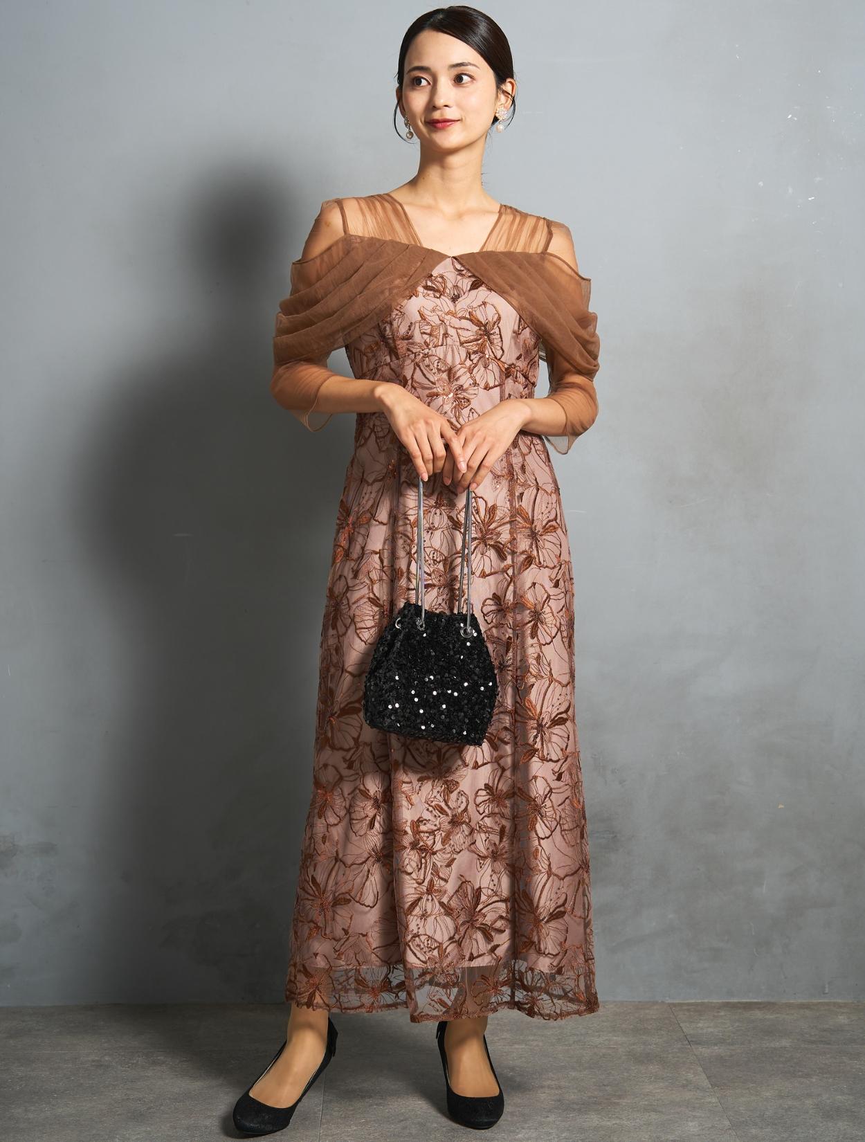 人気のスパンコール刺繍レースのシリーズドレス。ふんわりエアリーなソフトチュールのオフショルダーが目を惹きます。程よくフェミニンなテイストが、大人かわいいを叶えてくれます。透け感のあるシアースリーブですが、気になる二の腕はソフトチュールでしっかりカバー。重たく見えないのに隠したいところは隠せる人気のデザインです。