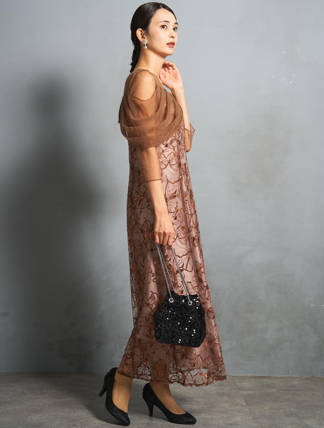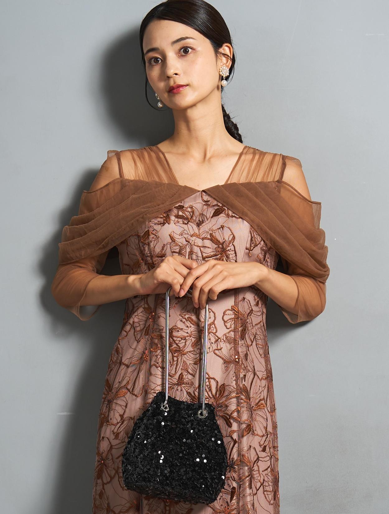 大人上品なブラウンドレスを更にシックに着こなしたい方におすすめのブラックコーデ。ほどよくキラキラするスパンコールバッグは、ブラックコーデでも地味見えしないので結婚式でも人気。巾着スタイルで今っぽい雰囲気で使えます。上半身にデザインがあるドレスなので、アクセサリーはイヤリングがおすすめ。少し大ぶりなホワイトパールのフラワーイヤリングが、お顔回りを華やかにしてくれます。