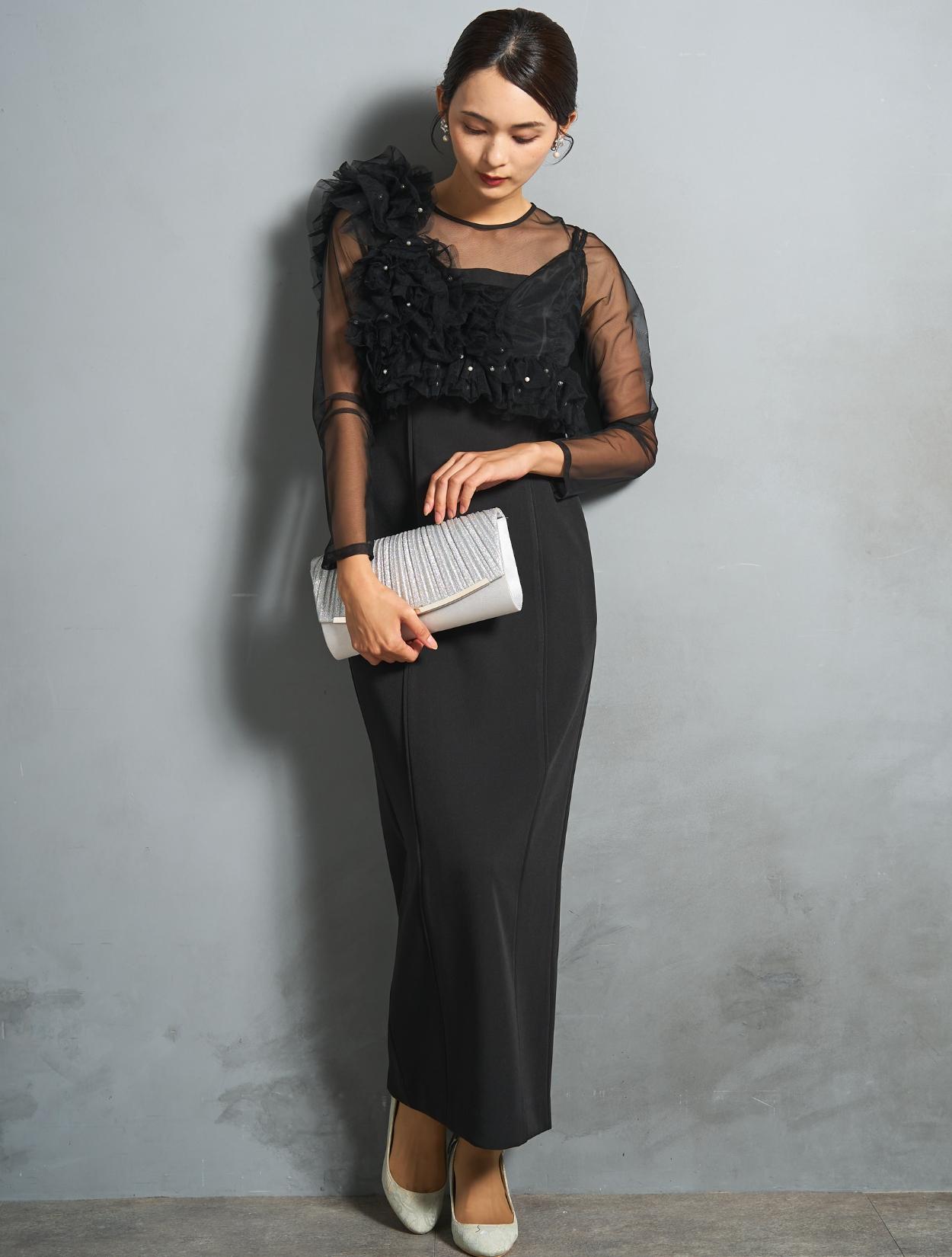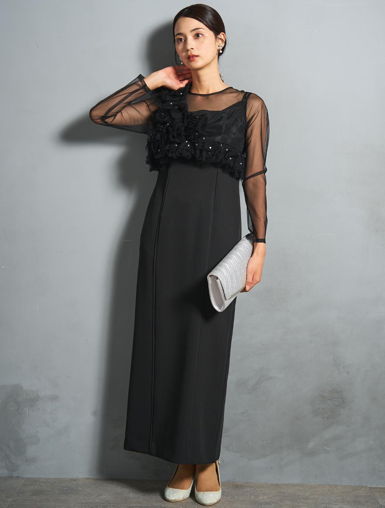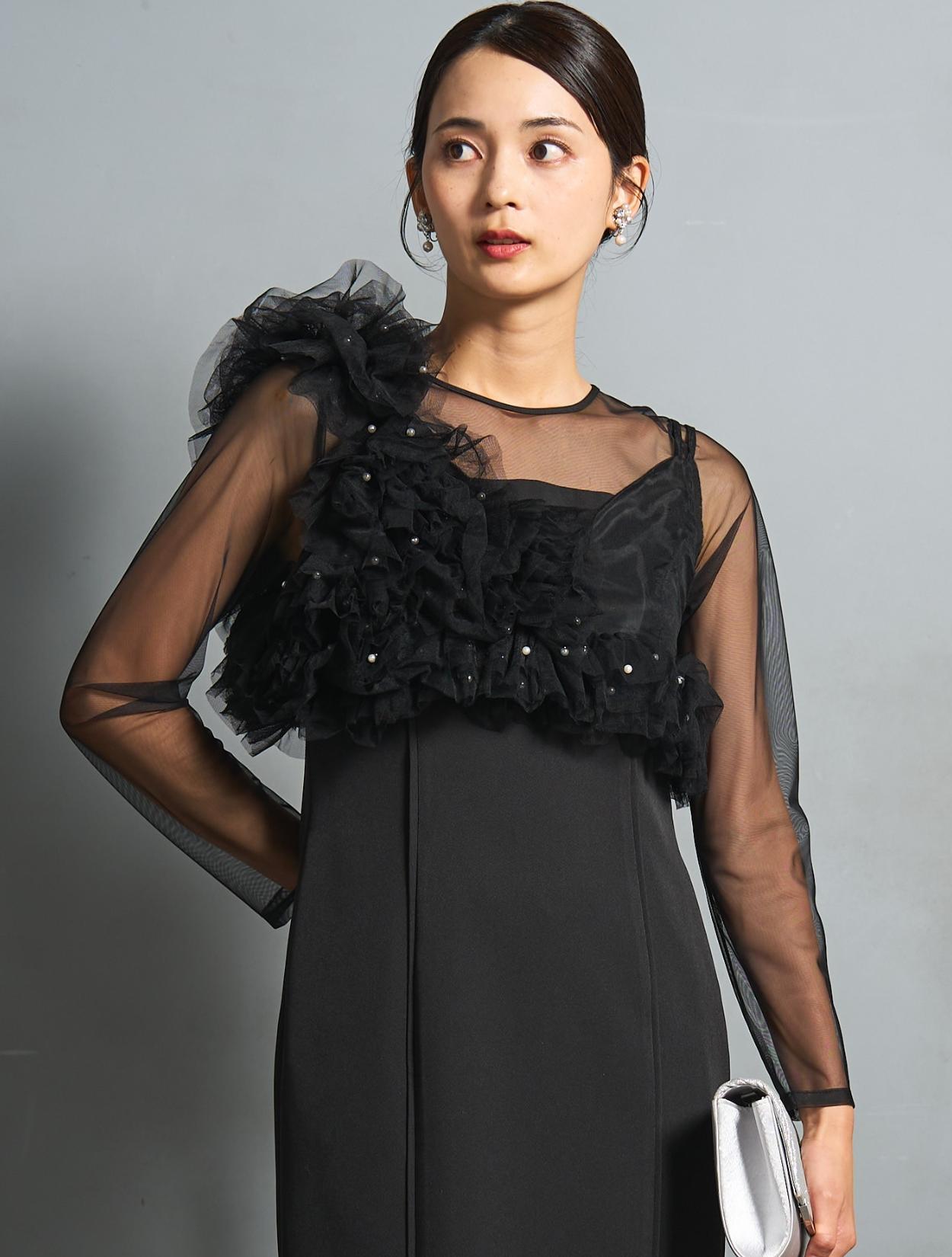 異素材のブラックドレスは、立体感がありメリハリが出るのがポイント。袖のシアー感やチュールのボリューム感、しっかりしたスカートの高級感、どのブラックも違った表情を見せてくれます。様々な立場やシーンで活躍するカラーです。ブラックは結婚式のお呼ばれにも人気。