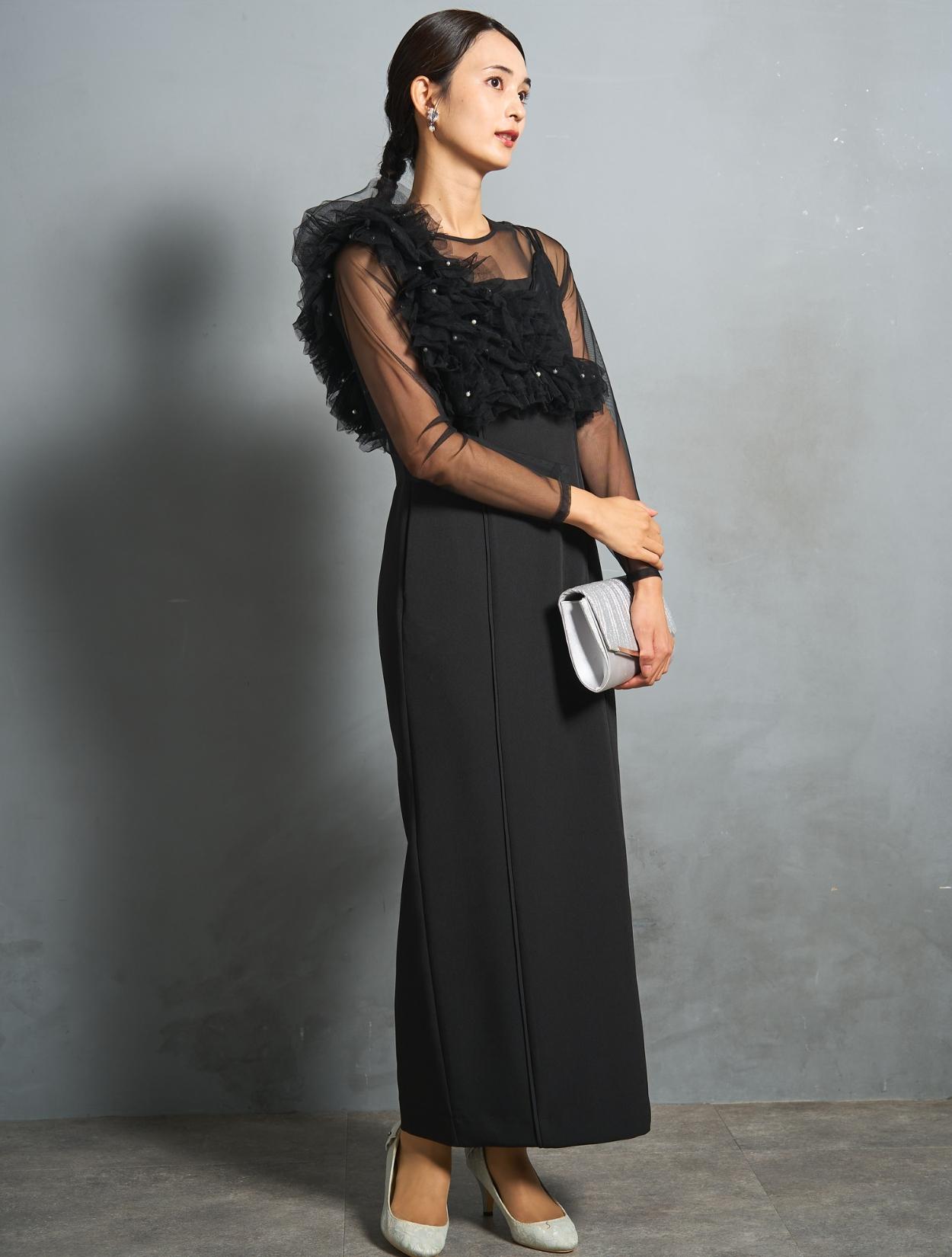 シアー素材をドッキングしたワンピースと、チュールビスチェがセットになったトレンド感のあるドレス。モードな印象もありつつ、マットなチュールを贅沢に使った「大人かわいい」がポイントです。