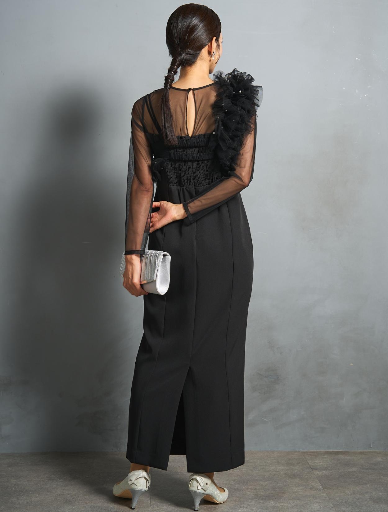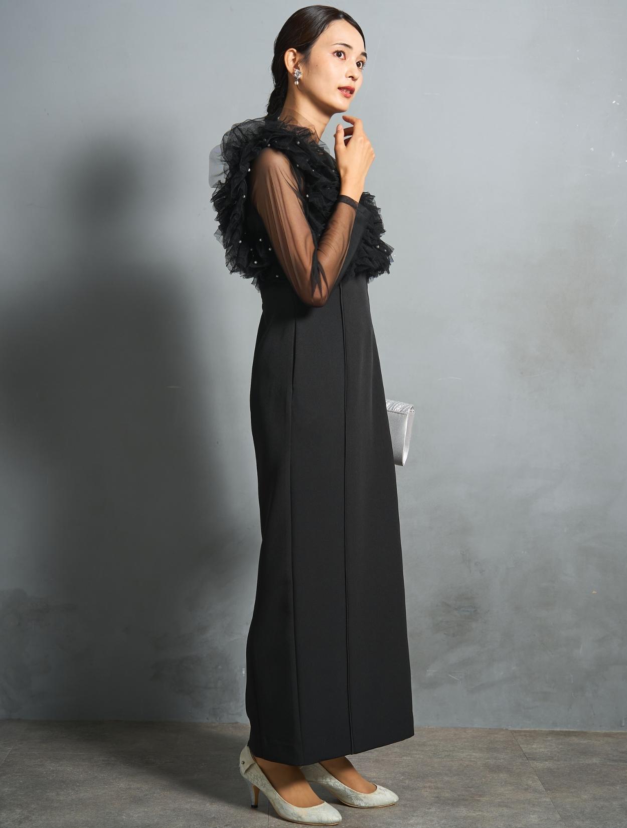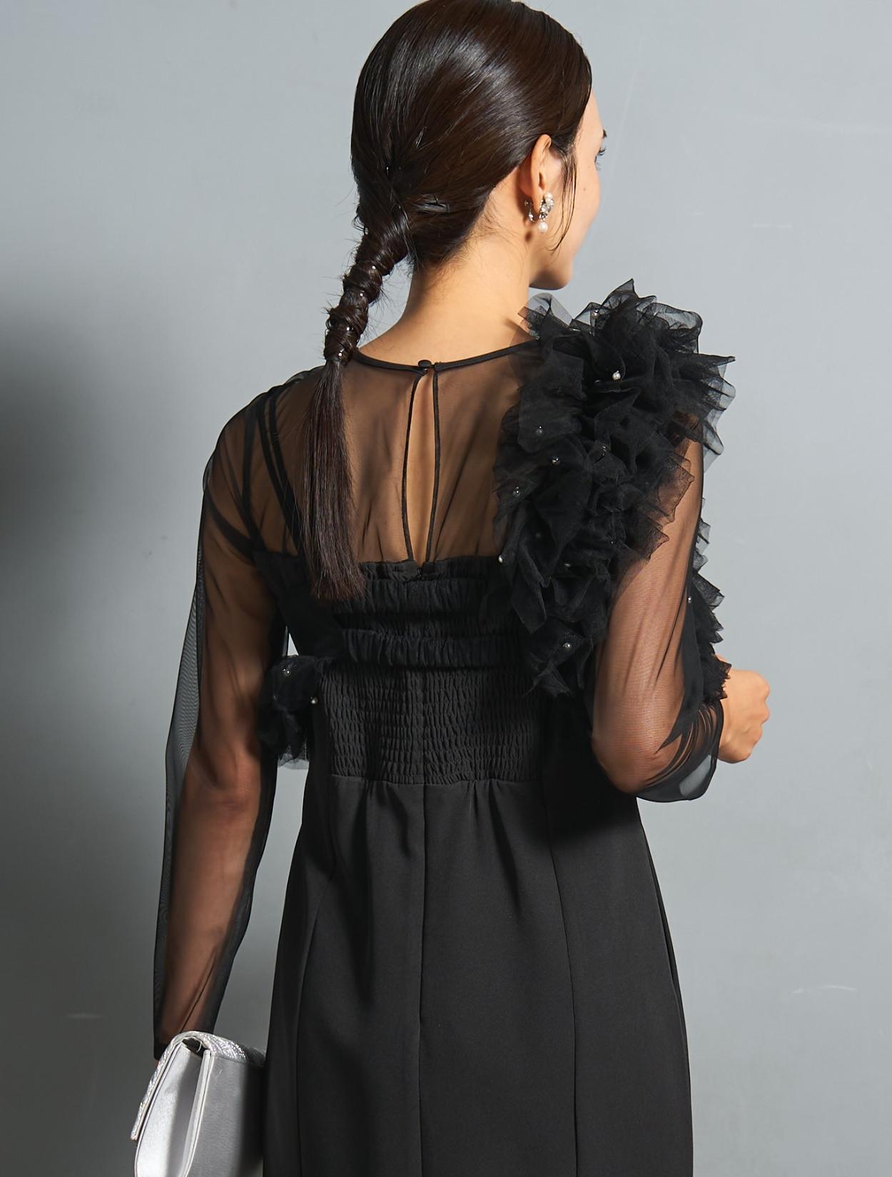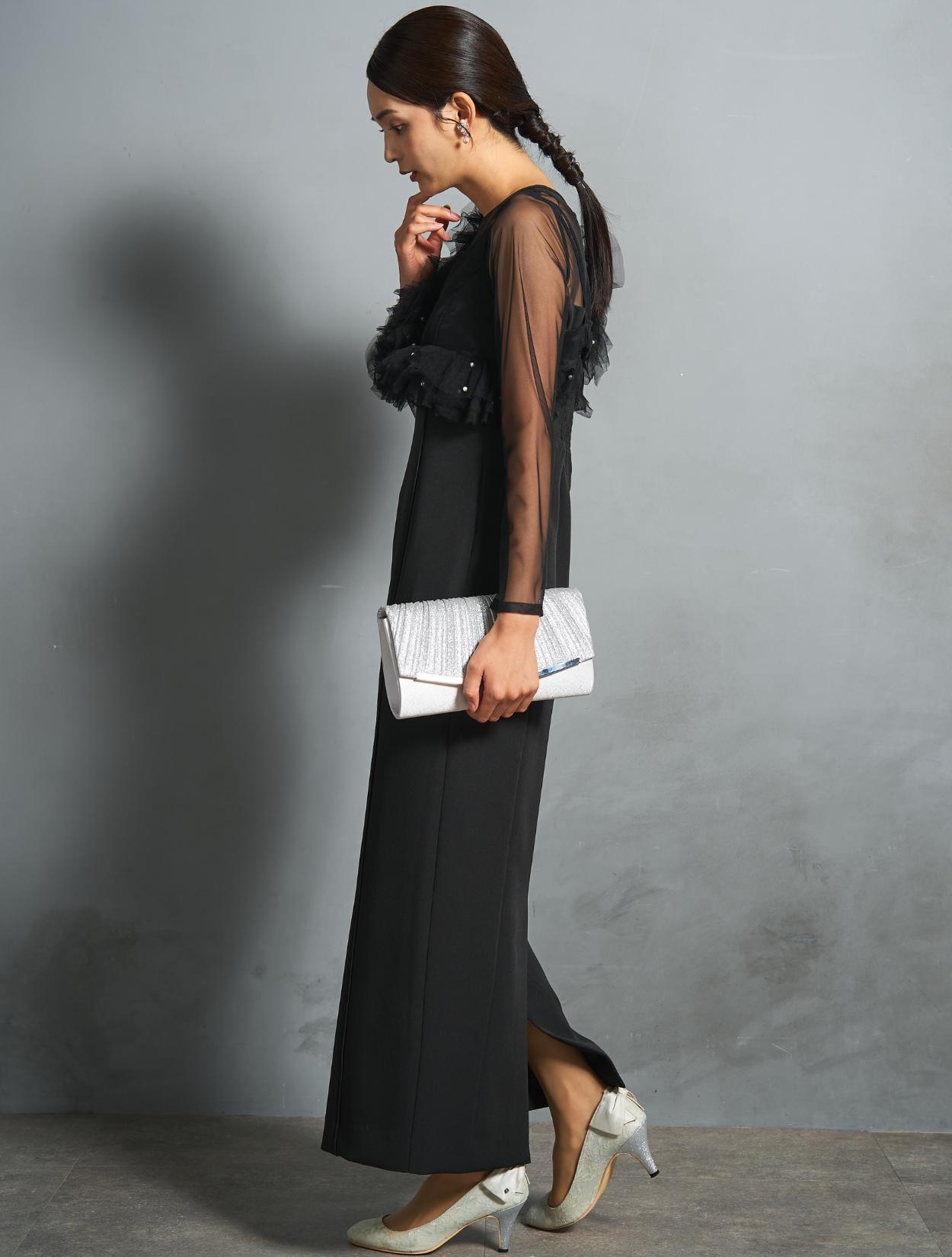ワンピースは、すっきり大人っぽく見えるIラインのストレートスカート。程よく厚みがある生地で高級感もあり、ボディラインを拾い過ぎずヘルシーな着こなしができます。さりげなくメリハリを効かせた同色のパイピングもポイント。スカートの後ろにはスリットが入っていて足捌きも◎。ポケットもあります。デコルテから袖にかけては透け感のあるシアー素材で、全体の印象に軽さや抜け感をプラスしてくれます。程よい肌見せ感もパーティーやフォーマルなシーンでは重要ポイントです。