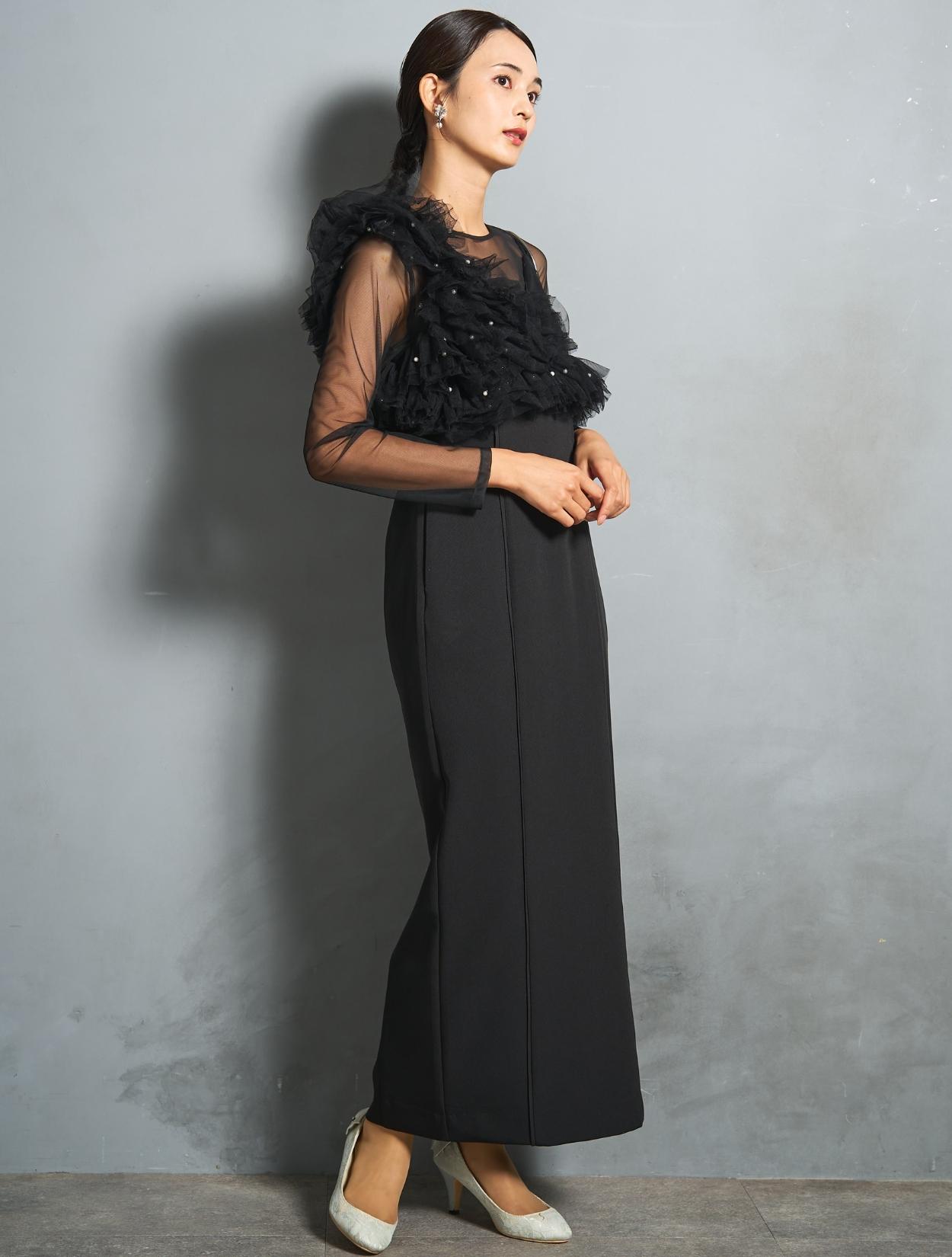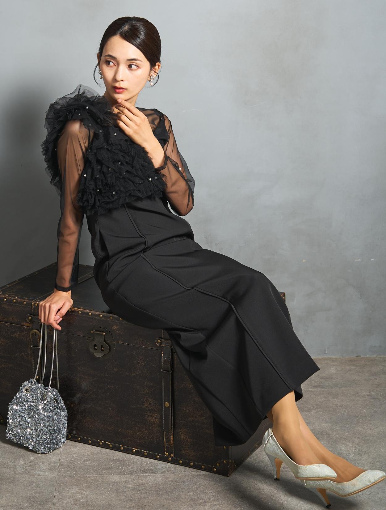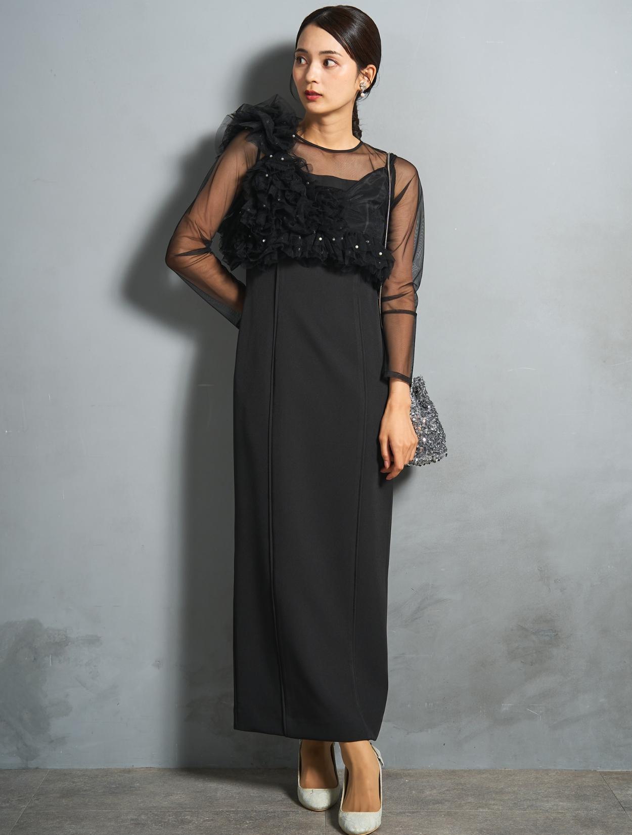 シアー素材をドッキングしたワンピースと、チュールビスチェがセットになったトレンド感のあるドレス。モードな印象もありつつ、マットなチュールを贅沢に使った「大人かわいい」がポイントです。