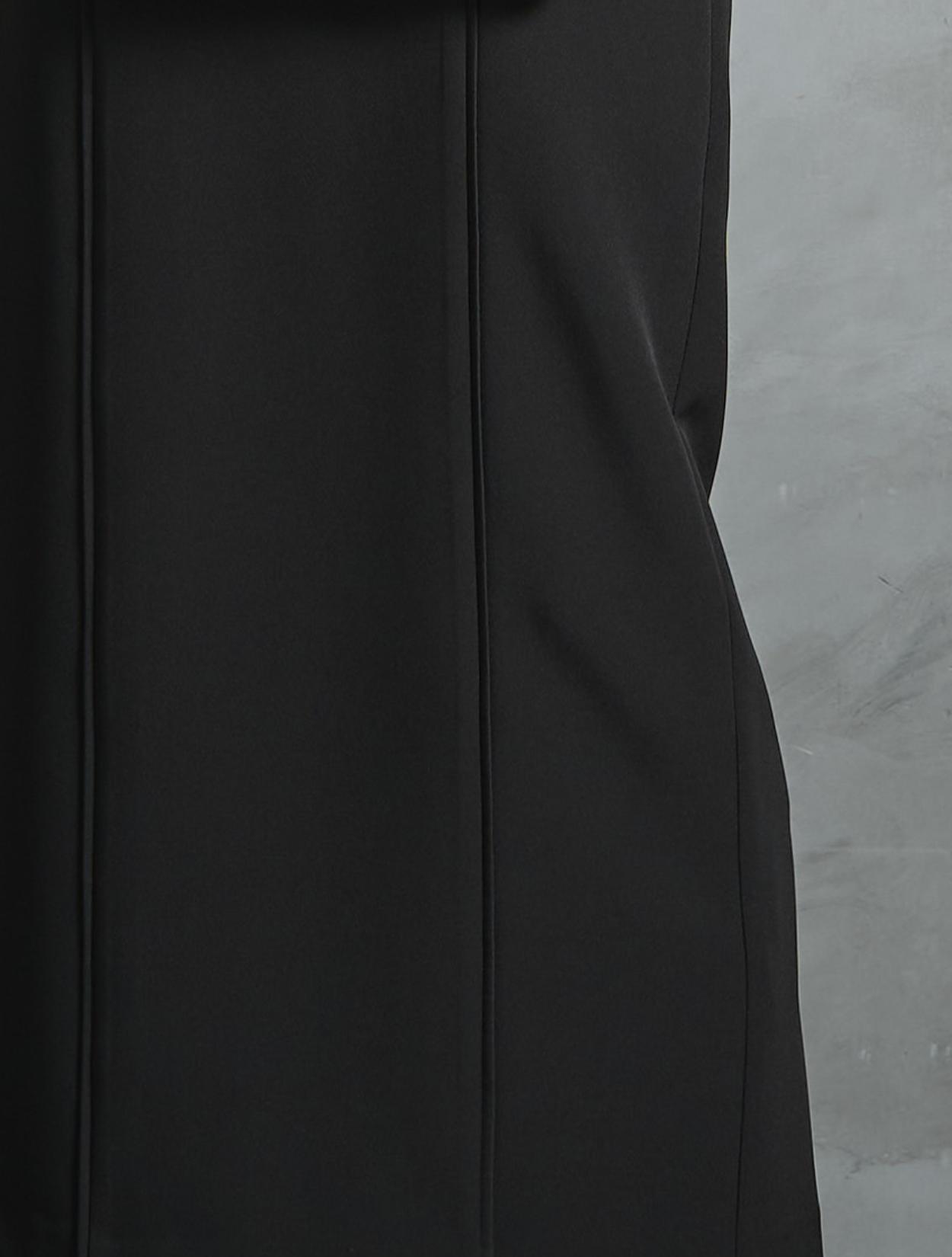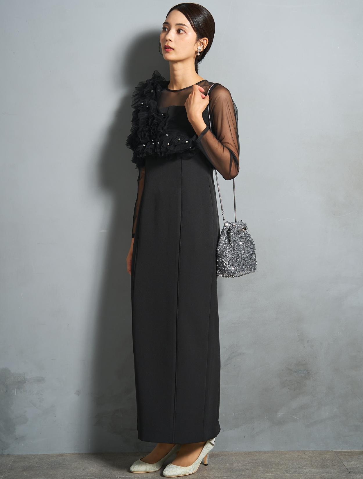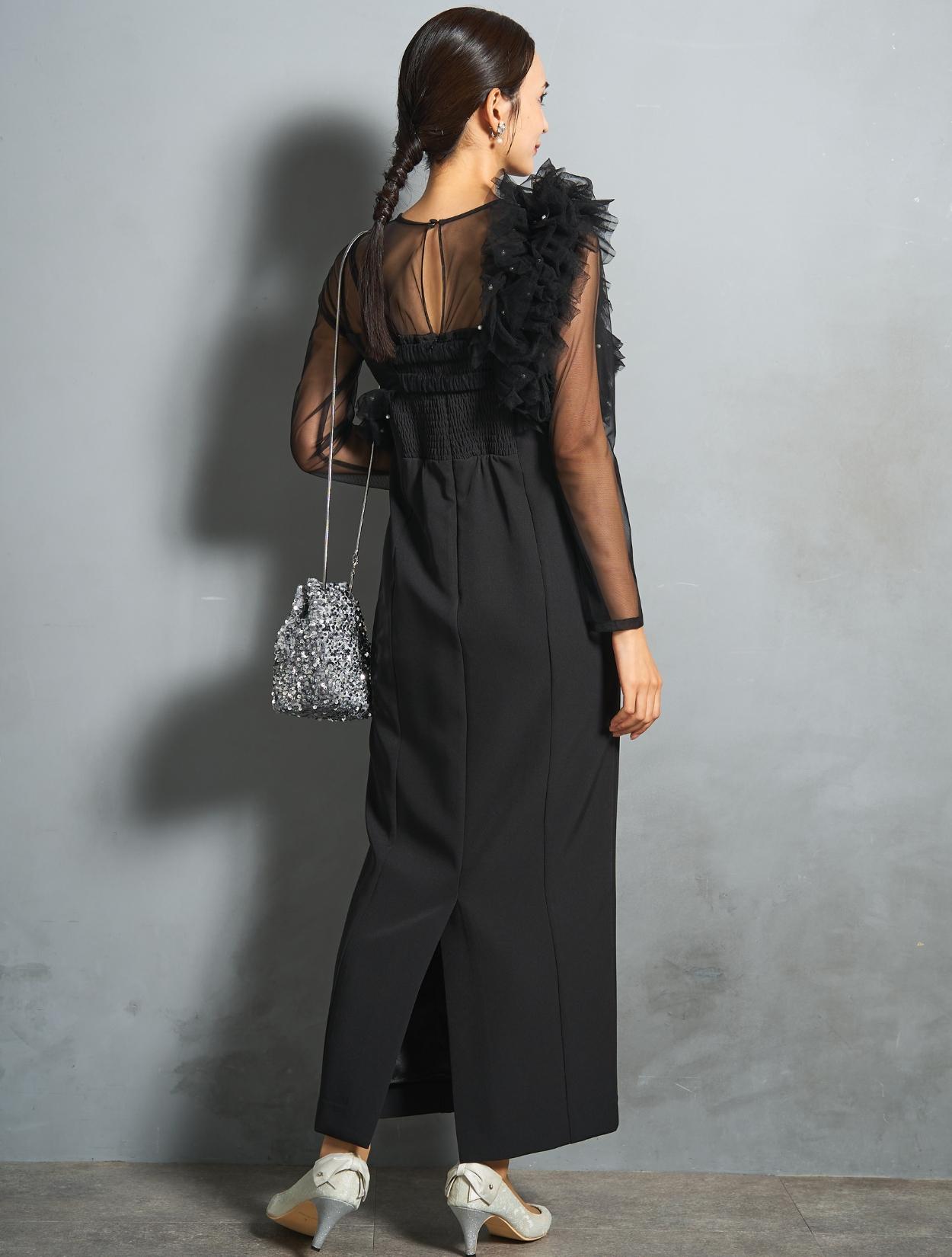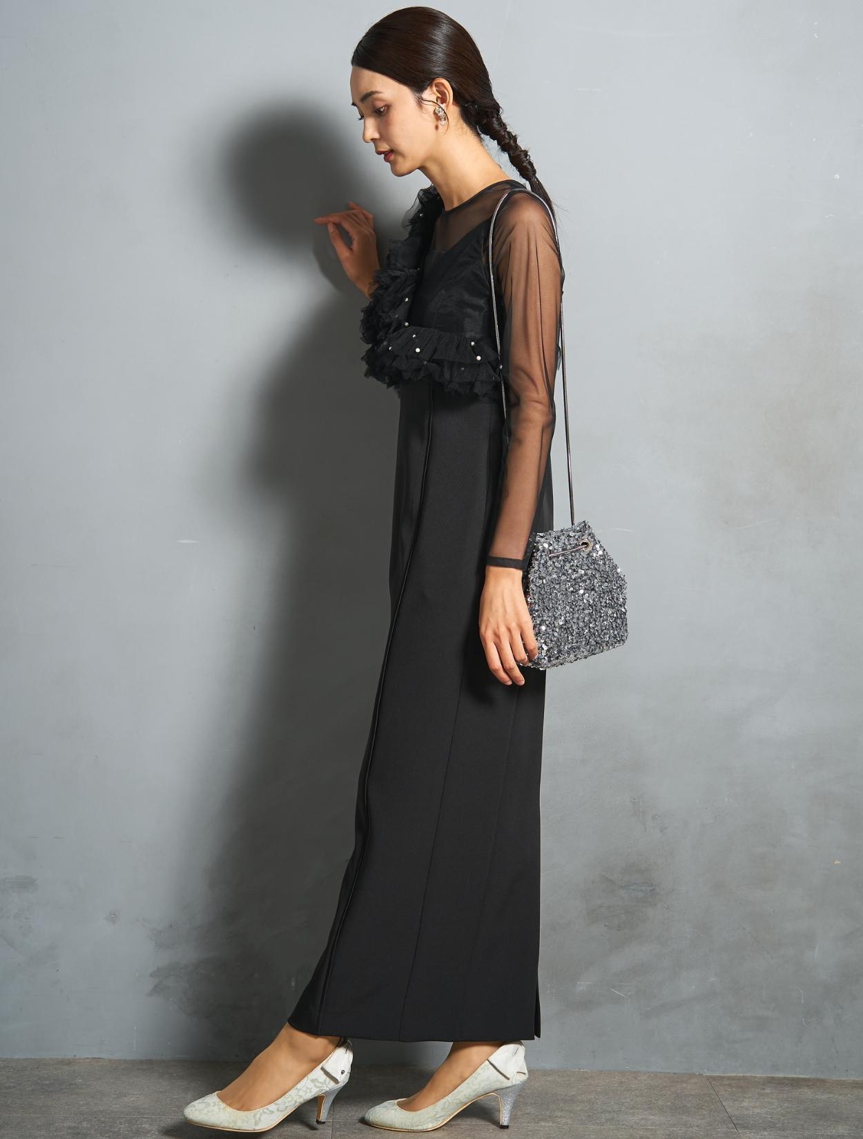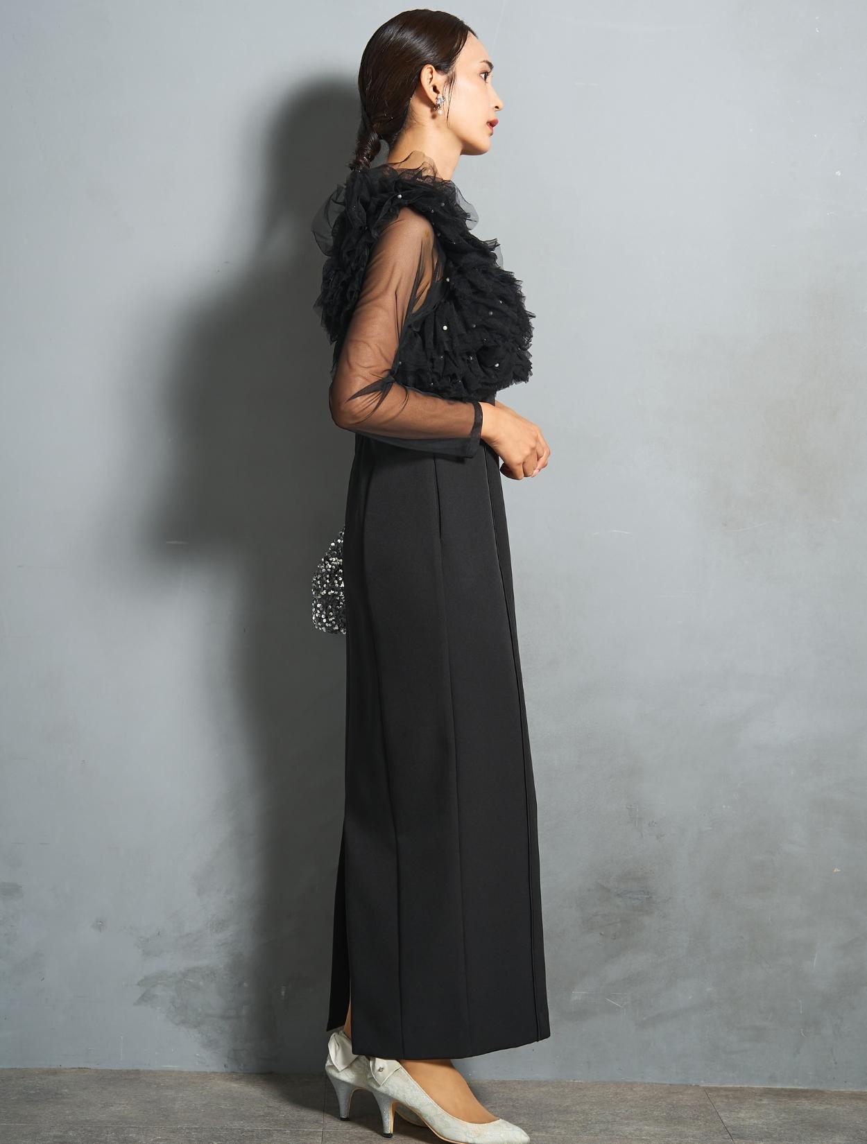 ワンピースは、すっきり大人っぽく見えるIラインのストレートスカート。程よく厚みがある生地で高級感もあり、ボディラインを拾い過ぎずヘルシーな着こなしができます。さりげなくメリハリを効かせた同色のパイピングもポイント。スカートの後ろにはスリットが入っていて足捌きも◎。ポケットもあります。デコルテから袖にかけては透け感のあるシアー素材で、全体の印象に軽さや抜け感をプラスしてくれます。程よい肌見せ感もパーティーやフォーマルなシーンでは重要ポイントです。
