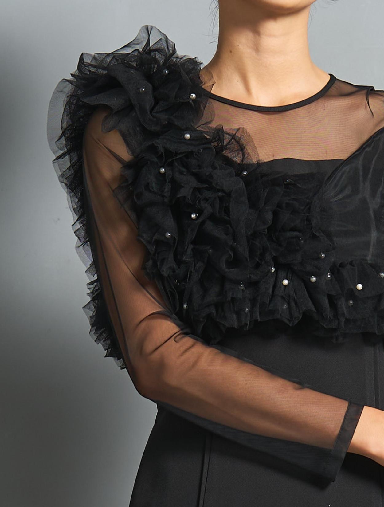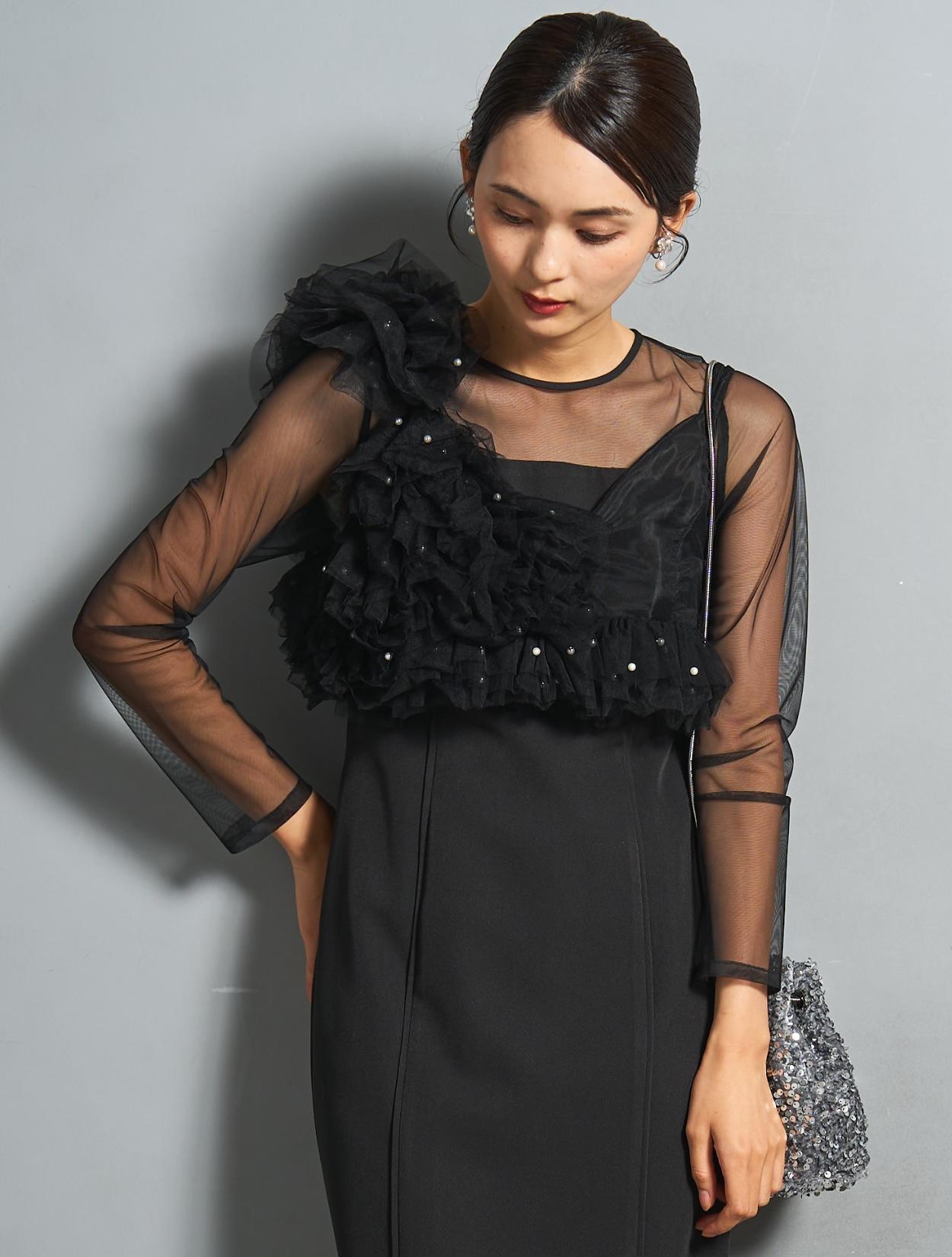 異素材のブラックドレスは、立体感がありメリハリが出るのがポイント。袖のシアー感やチュールのボリューム感、しっかりしたスカートの高級感、どのブラックも違った表情を見せてくれます。様々な立場やシーンで活躍するカラーです。ブラックは結婚式のお呼ばれにも人気。
