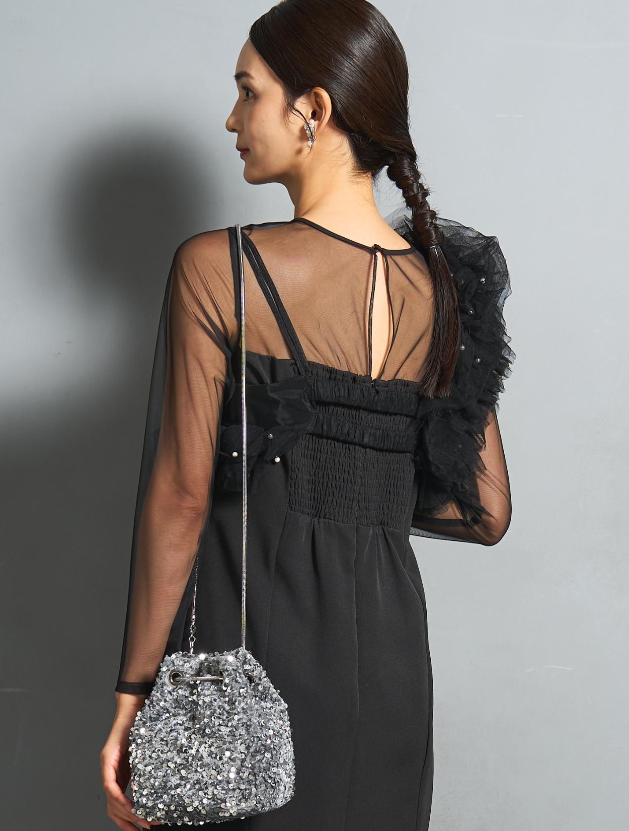 モードでトレンド感のあるドレスに、今っぽいシルバーのスパンコールバッグを合わせたおしゃれコーデ。シックながら思いっきりパーティー感も味わえる合わせがポイント。上半身にボリュームのあるデザインなので、アクセサリーは敢えてイヤリングをチョイス。大き過ぎないけれど華やかさもある人気のビジューイヤリングです。