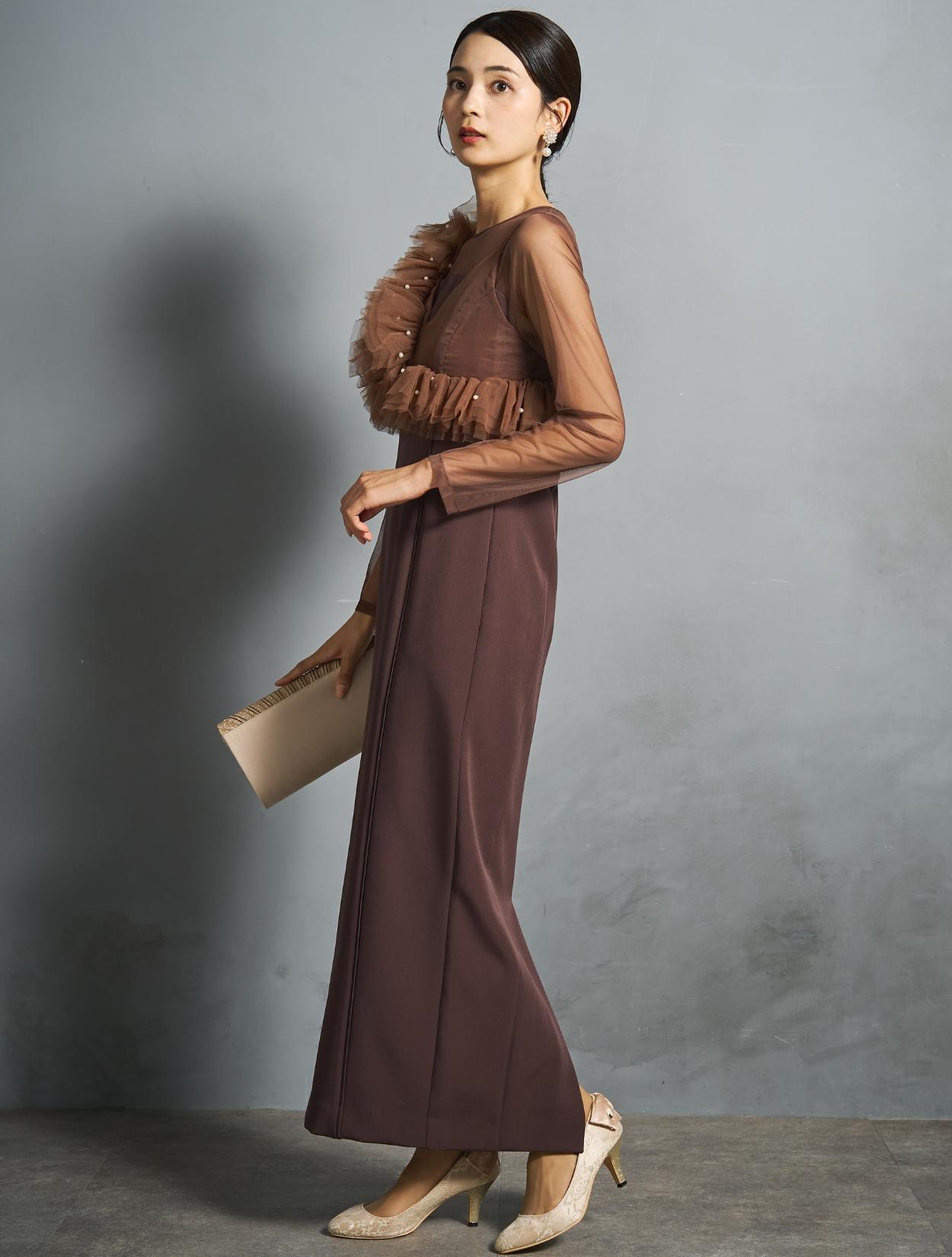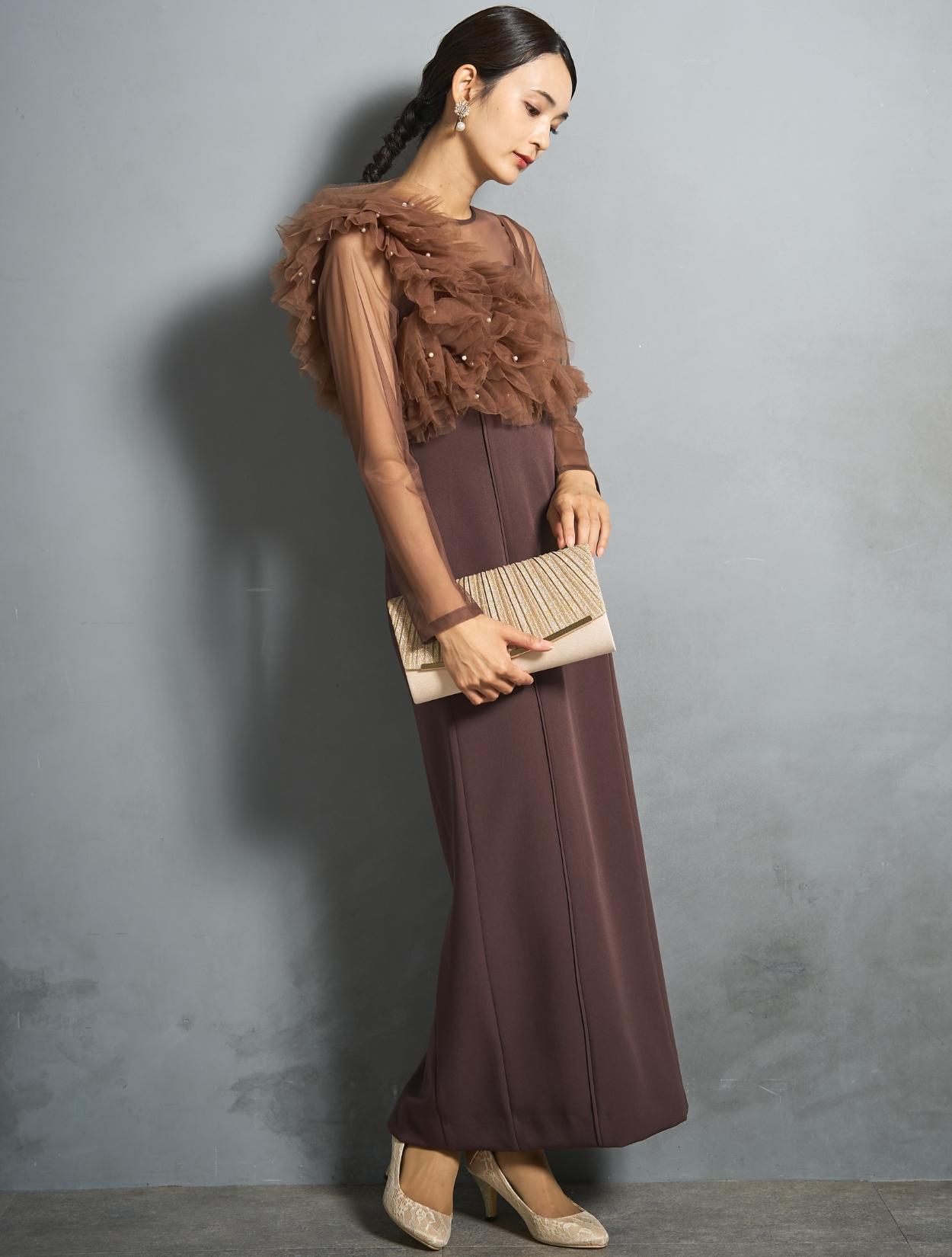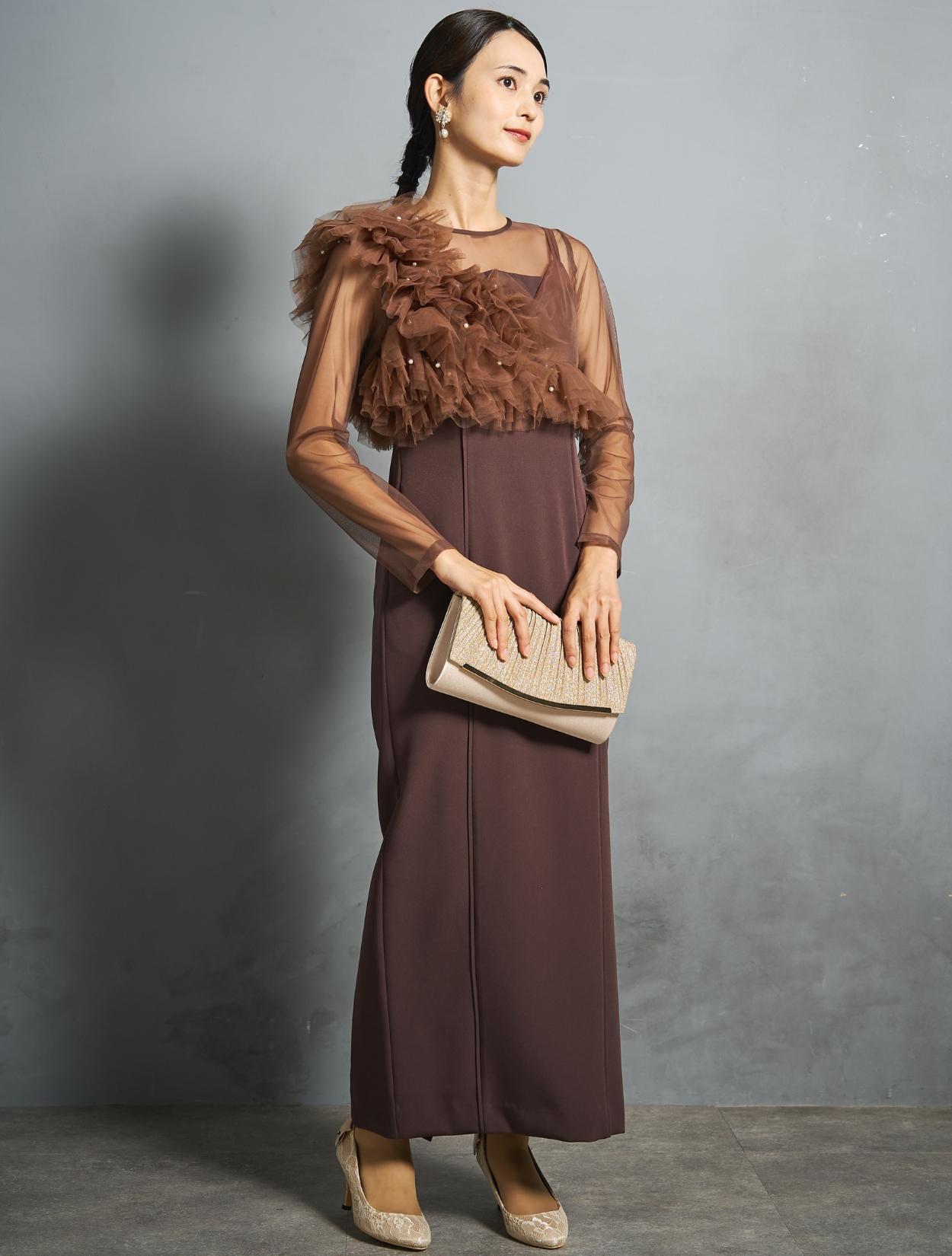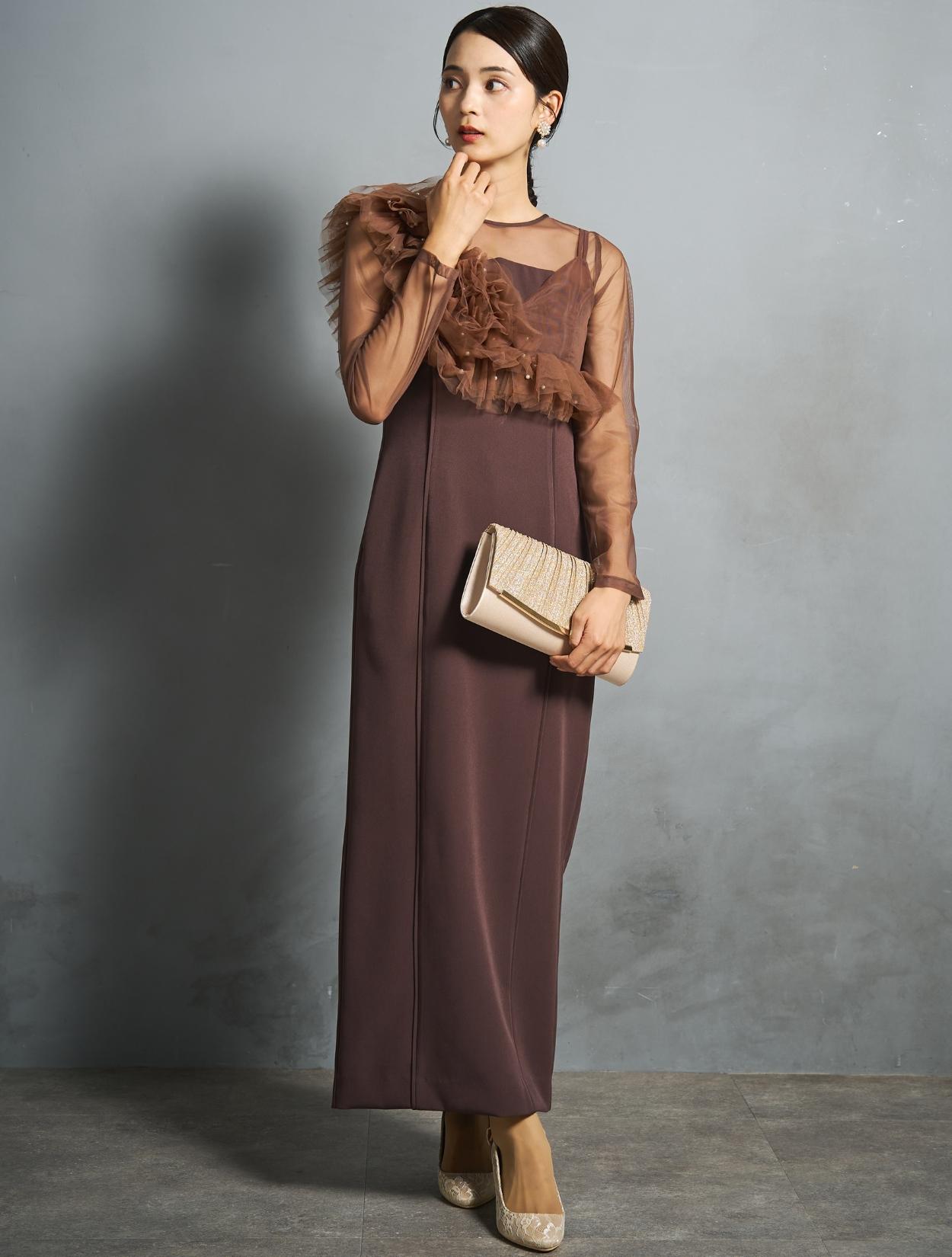 シアー素材をドッキングしたワンピースと、チュールビスチェがセットになったトレンド感のあるドレス。モードな印象もありつつ、マットなチュールを贅沢に使った「大人かわいい」がポイントです。