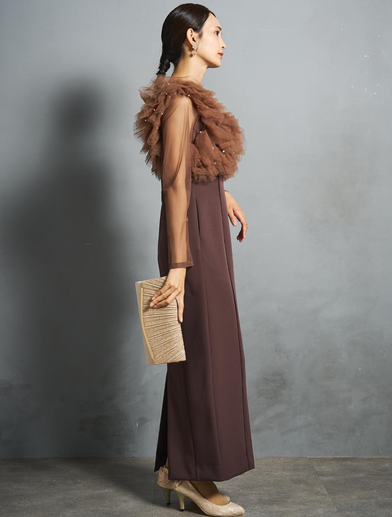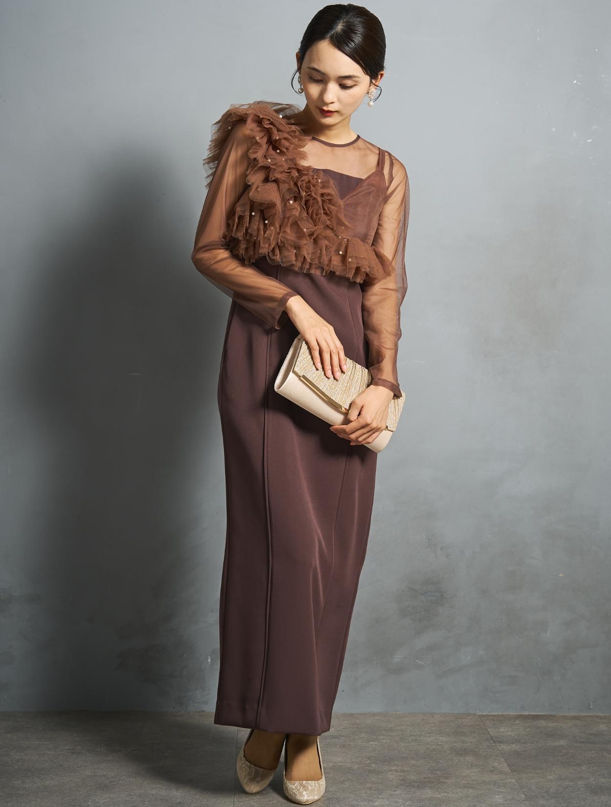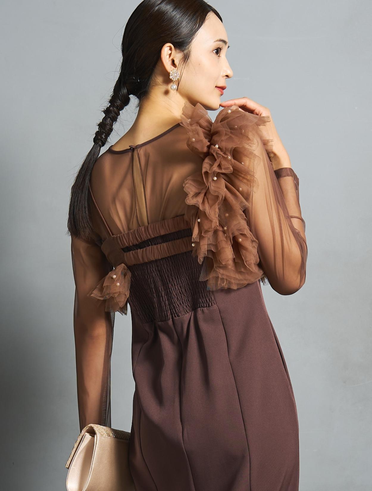 落ち着いた大人の印象のチョコレートブラウン。チュール部分はミルクチョコレートのような優しいブラウンで、同色でもメリハリが出る配色です。派手過ぎないけれどブラックよりも華やかさのあるブラウンは、近年トレンドの人気カラーです。