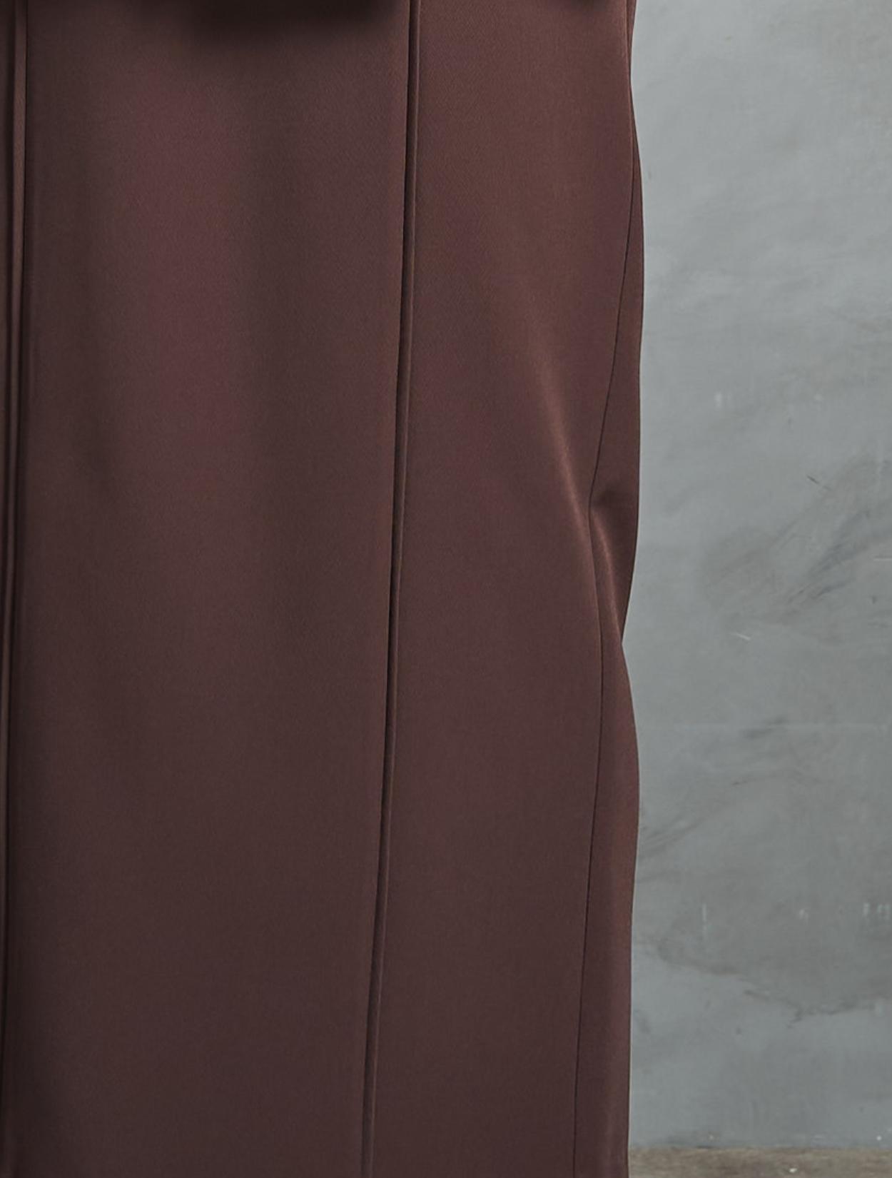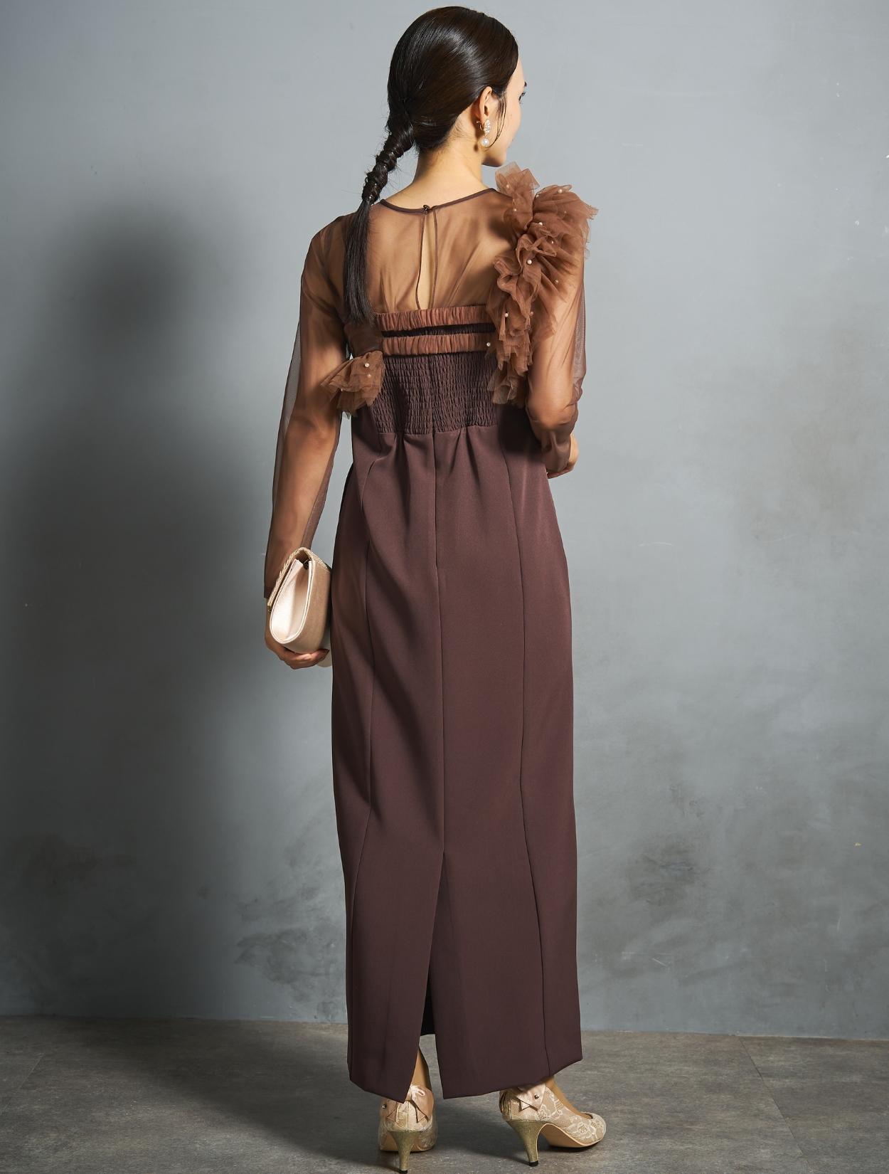 ワンピースは、すっきり大人っぽく見えるIラインのストレートスカート。程よく厚みがある生地で高級感もあり、ボディラインを拾い過ぎずヘルシーな着こなしができます。さりげなくメリハリを効かせた同色のパイピングもポイント。スカートの後ろにはスリットが入っていて足捌きも◎。ポケットもあります。デコルテから袖にかけては透け感のあるシアー素材で、全体の印象に軽さや抜け感をプラスしてくれます。程よい肌見せ感もパーティーやフォーマルなシーンでは重要ポイントです。