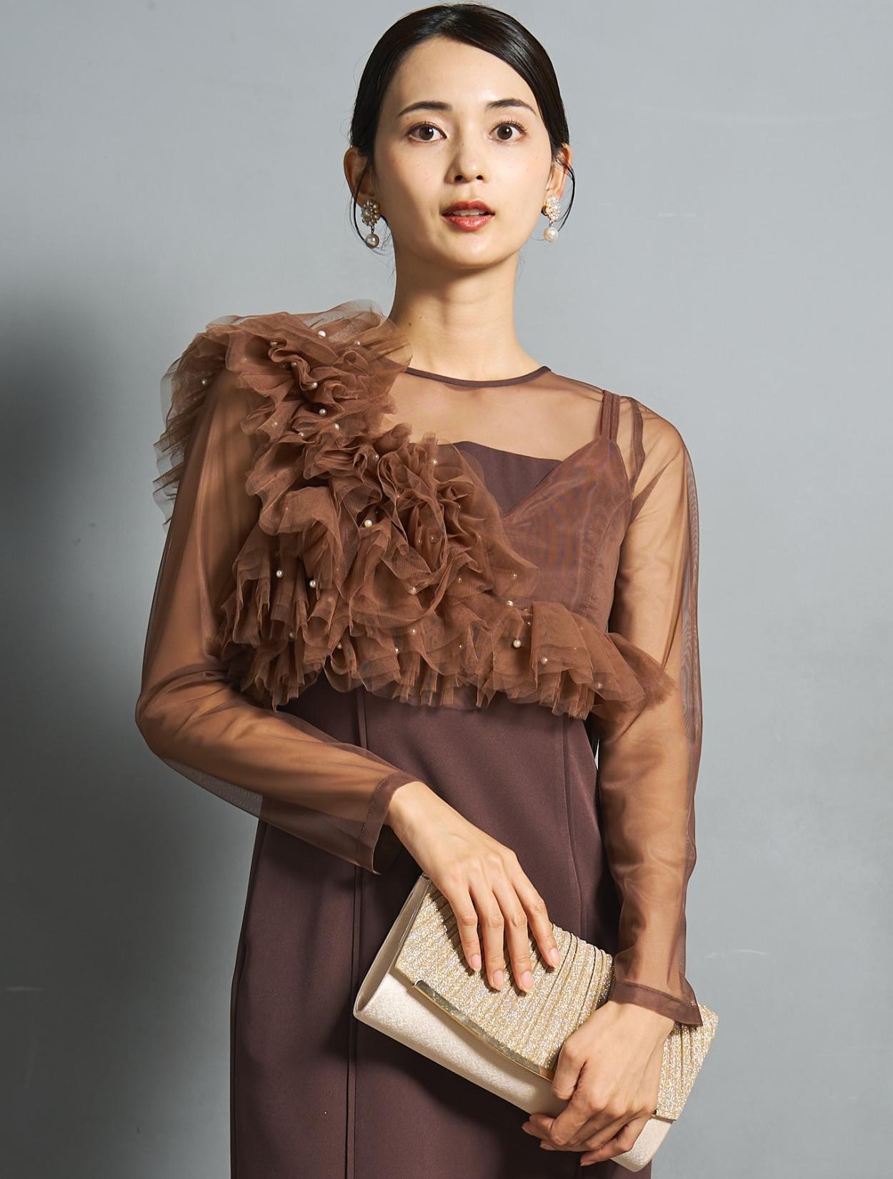 目を惹くボリューム感のチュールビスチェには、パールを散りばめたディテールが人気。パールの量は少な過ぎず多過ぎず、適度な華やかさ。アシンメトリーデザインでボリュームの印象が丁度良く、おしゃれなのに派手過ぎず着やすい一着です。