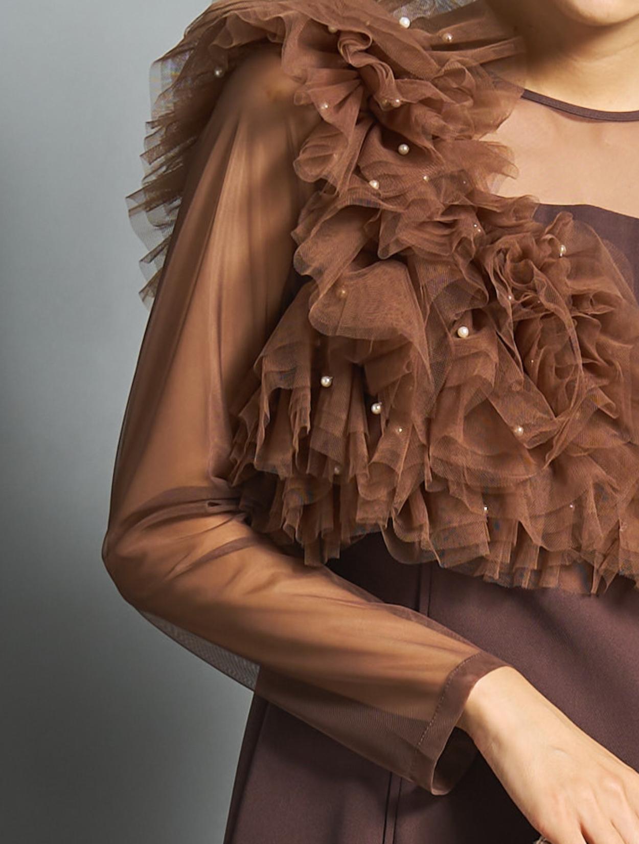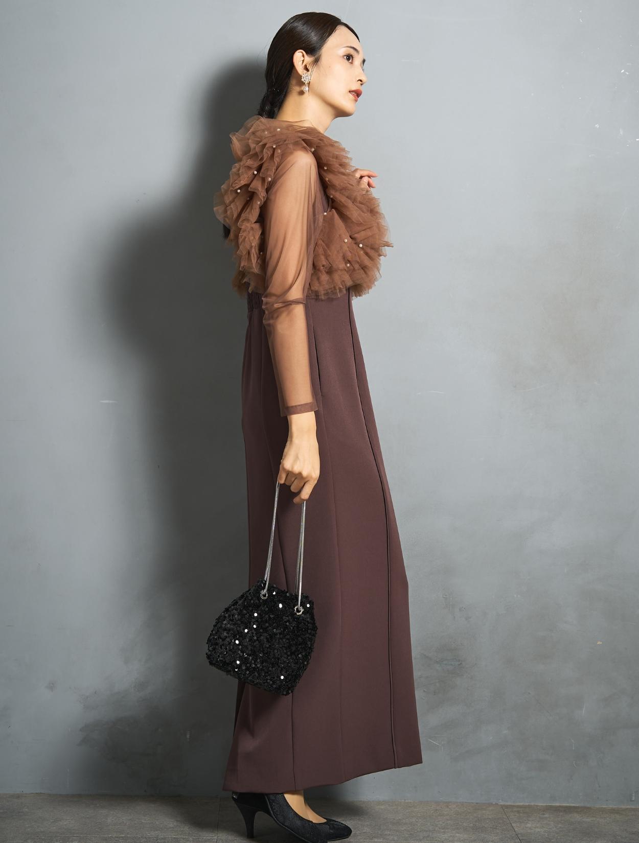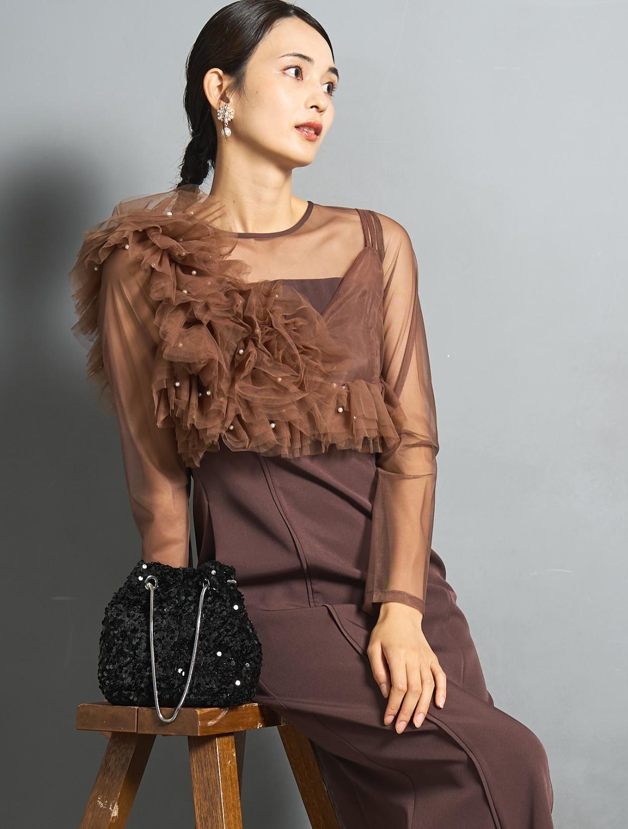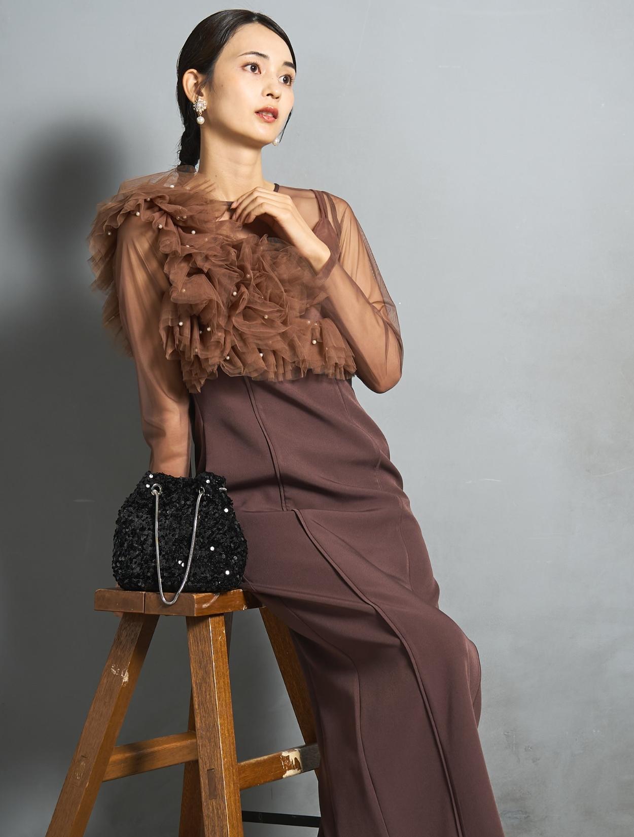 目を惹くボリューム感のチュールビスチェには、パールを散りばめたディテールが人気。パールの量は少な過ぎず多過ぎず、適度な華やかさ。アシンメトリーデザインでボリュームの印象が丁度良く、おしゃれなのに派手過ぎず着やすい一着です。