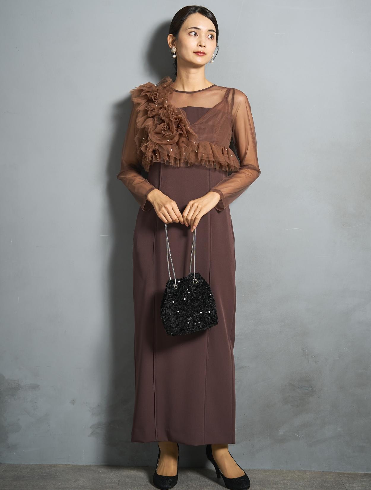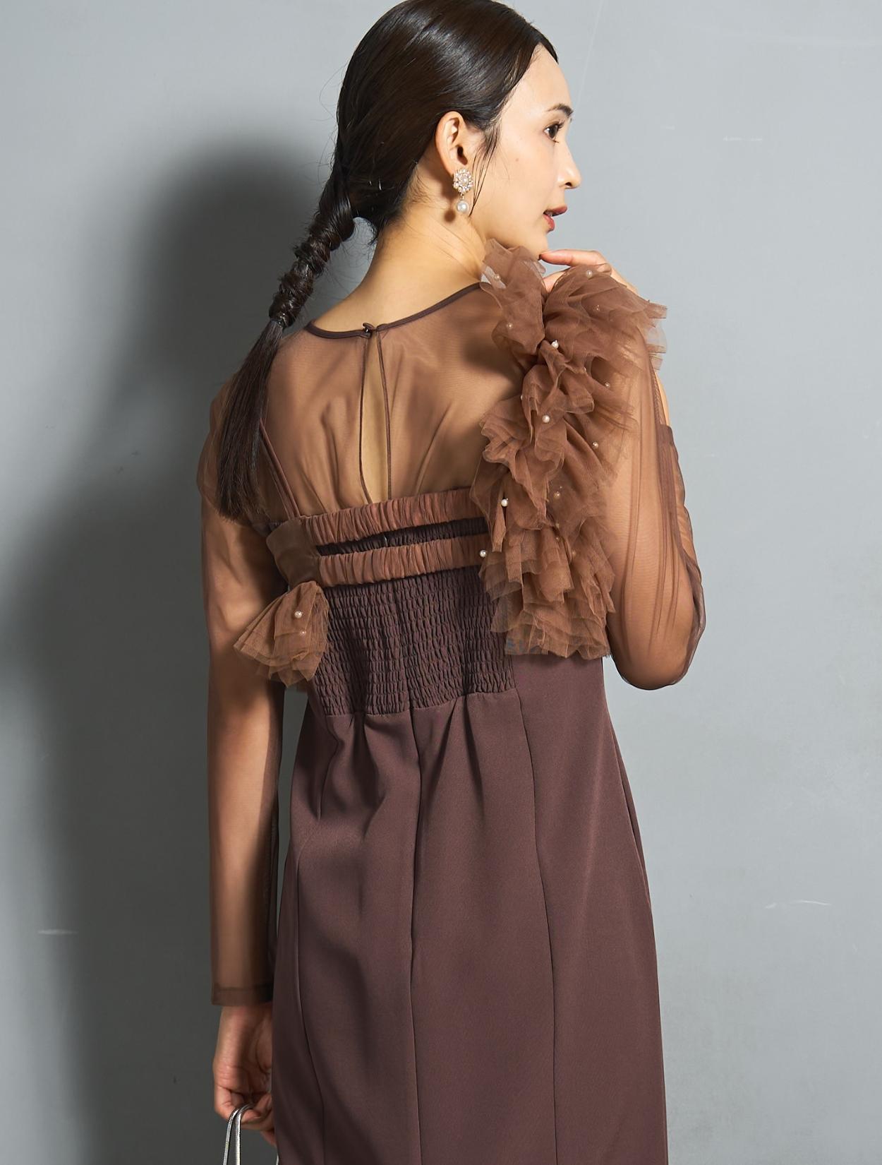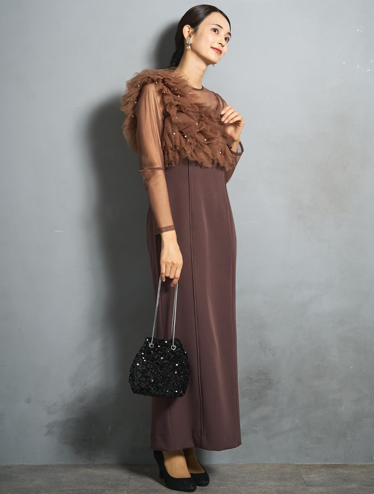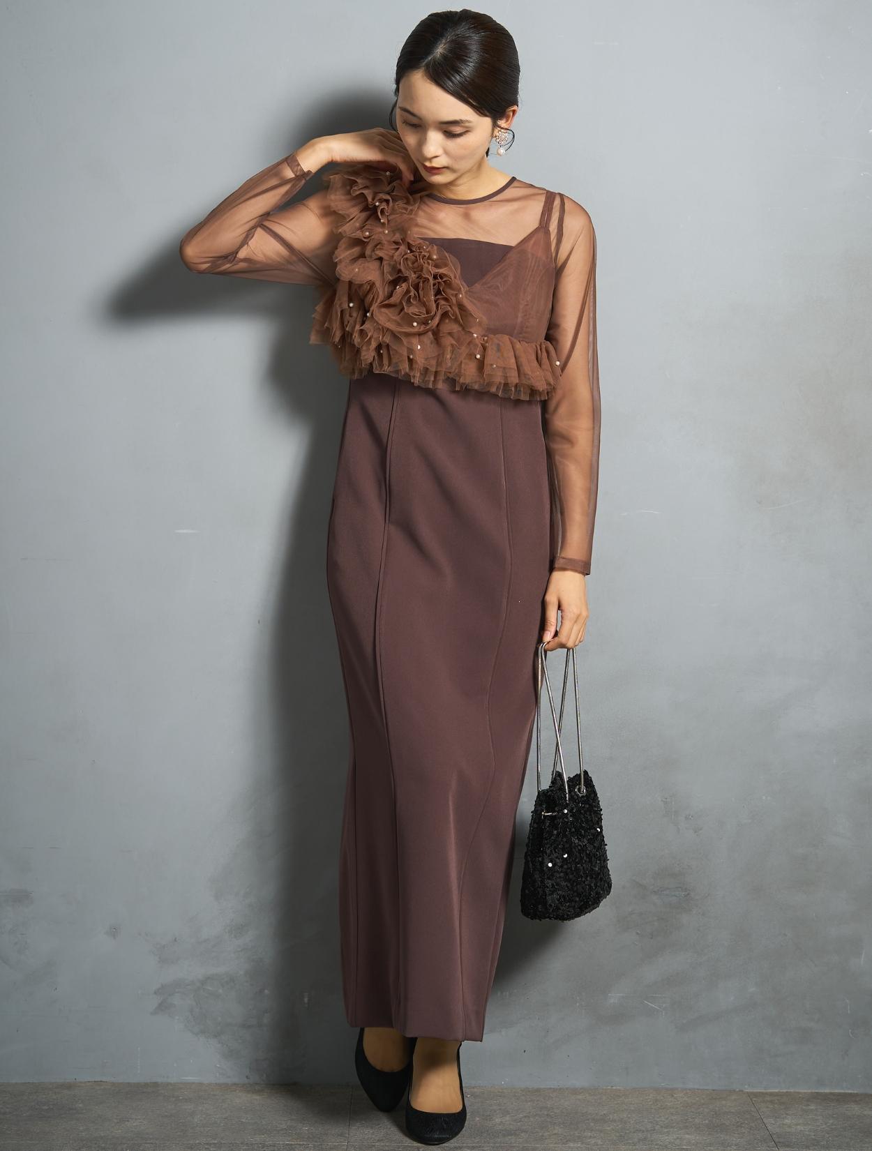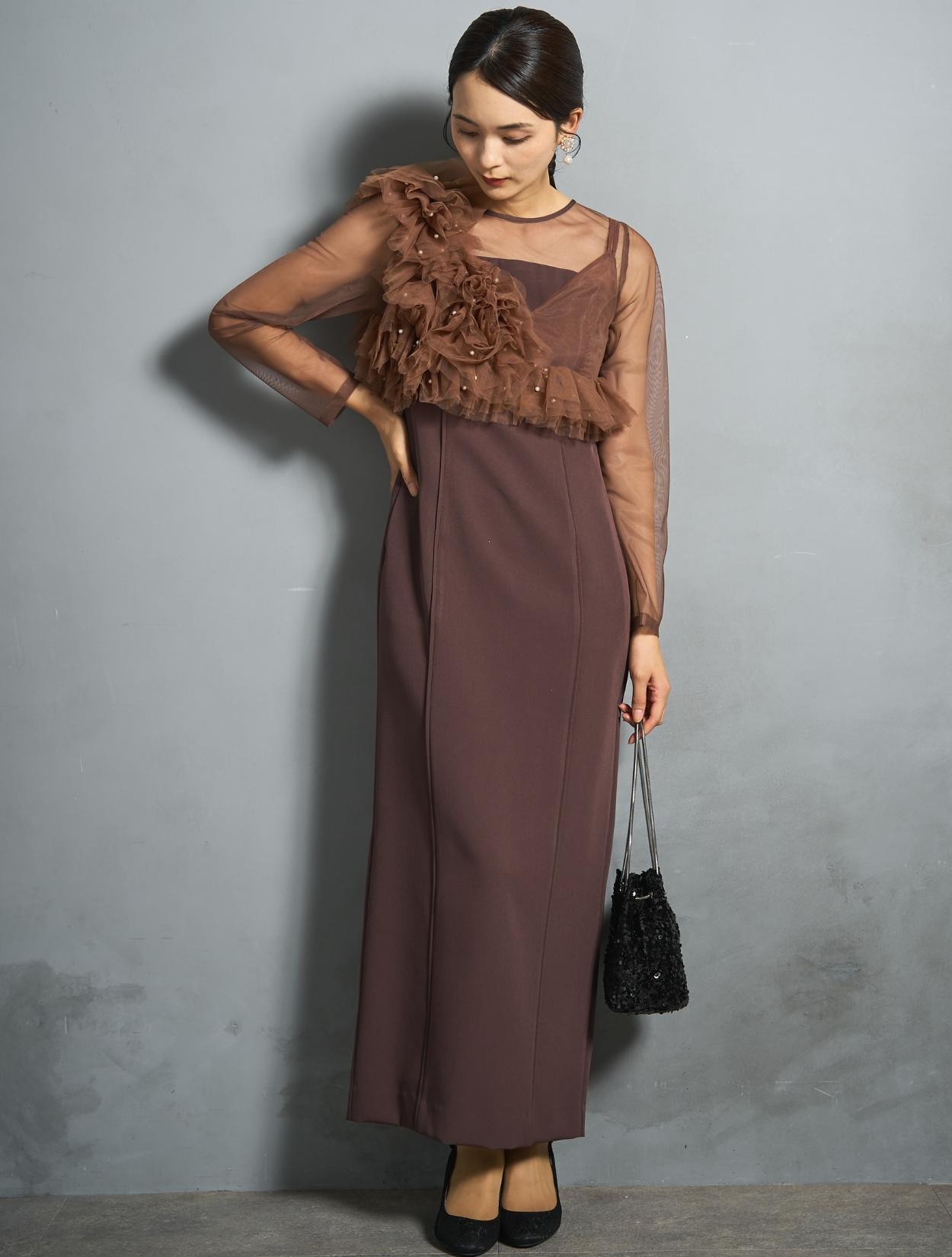 シアー素材をドッキングしたワンピースと、チュールビスチェがセットになったトレンド感のあるドレス。モードな印象もありつつ、マットなチュールを贅沢に使った「大人かわいい」がポイントです。