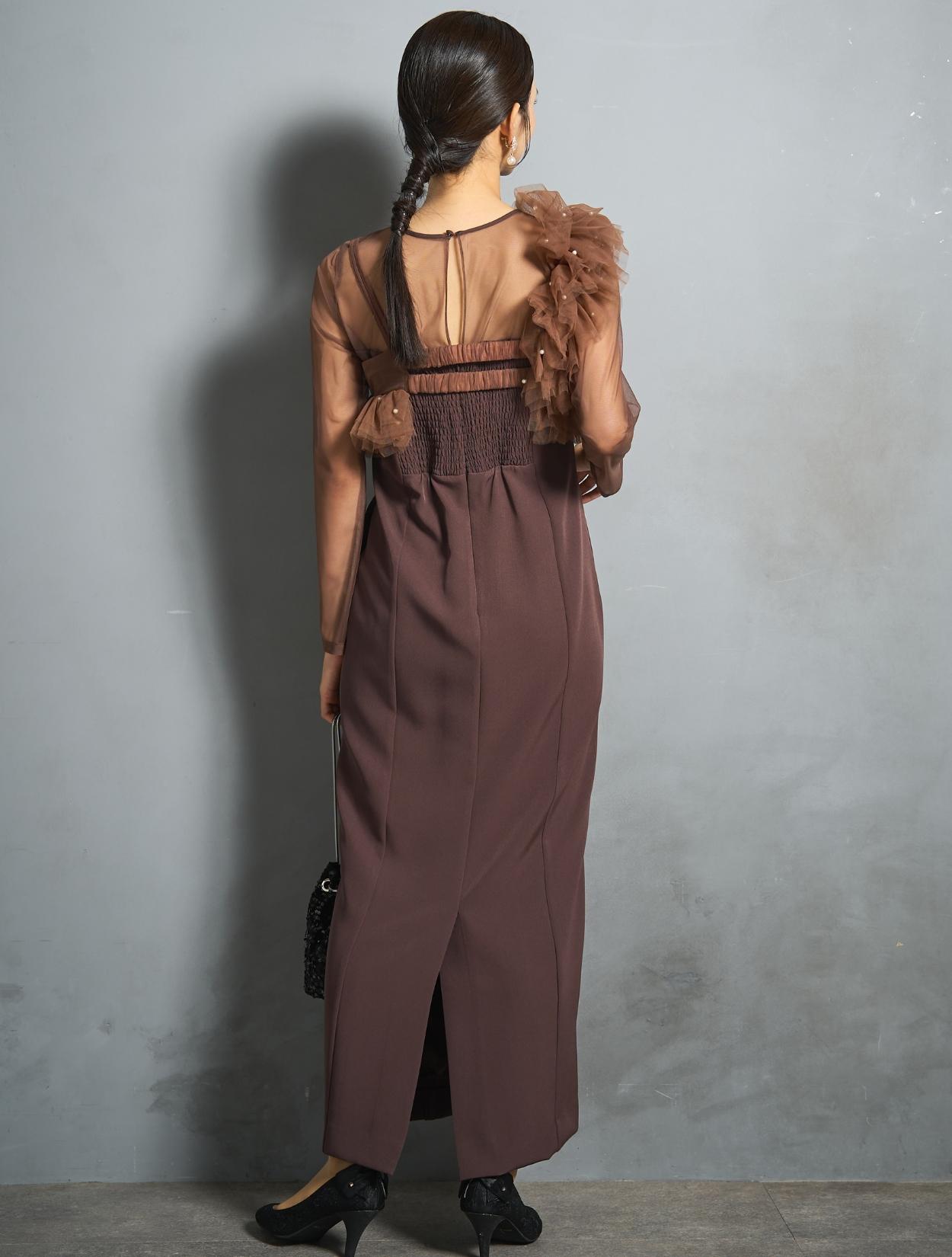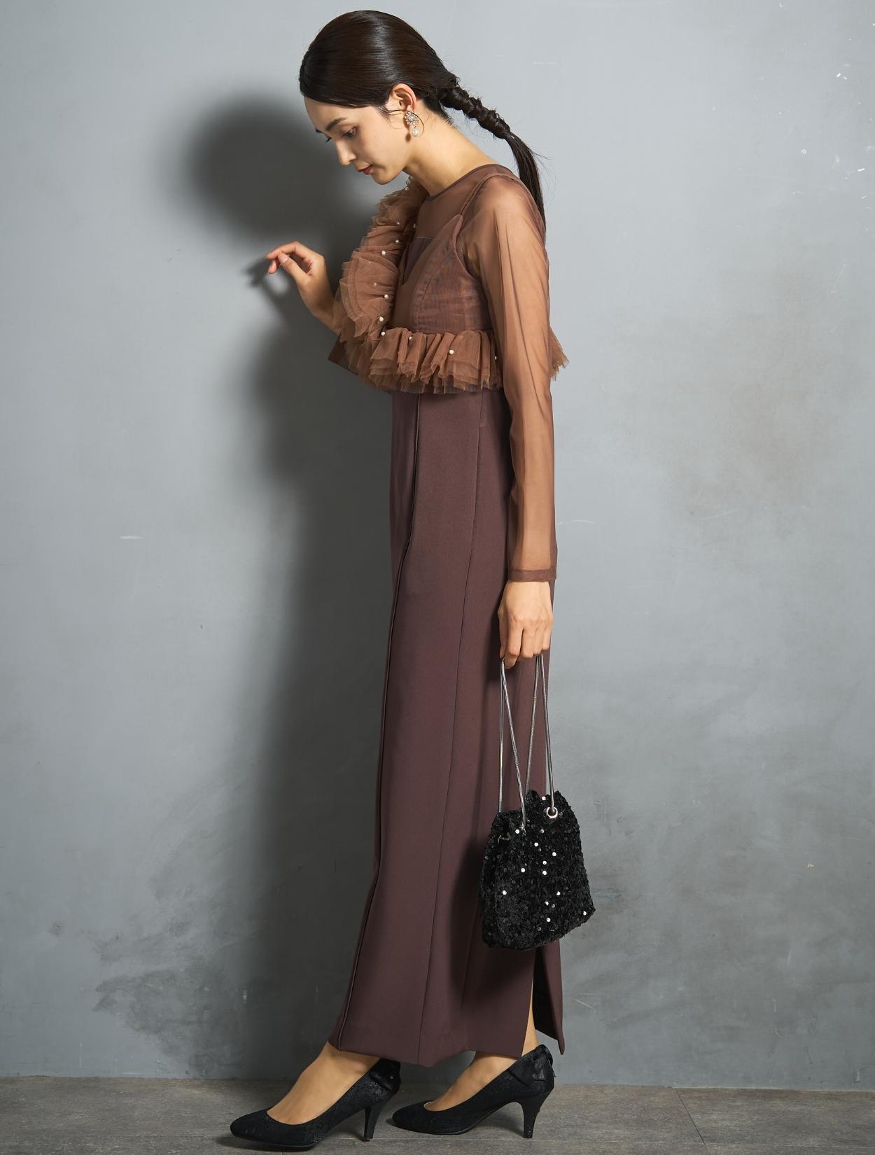 ワンピースは、すっきり大人っぽく見えるIラインのストレートスカート。程よく厚みがある生地で高級感もあり、ボディラインを拾い過ぎずヘルシーな着こなしができます。さりげなくメリハリを効かせた同色のパイピングもポイント。スカートの後ろにはスリットが入っていて足捌きも◎。ポケットもあります。デコルテから袖にかけては透け感のあるシアー素材で、全体の印象に軽さや抜け感をプラスしてくれます。程よい肌見せ感もパーティーやフォーマルなシーンでは重要ポイントです。