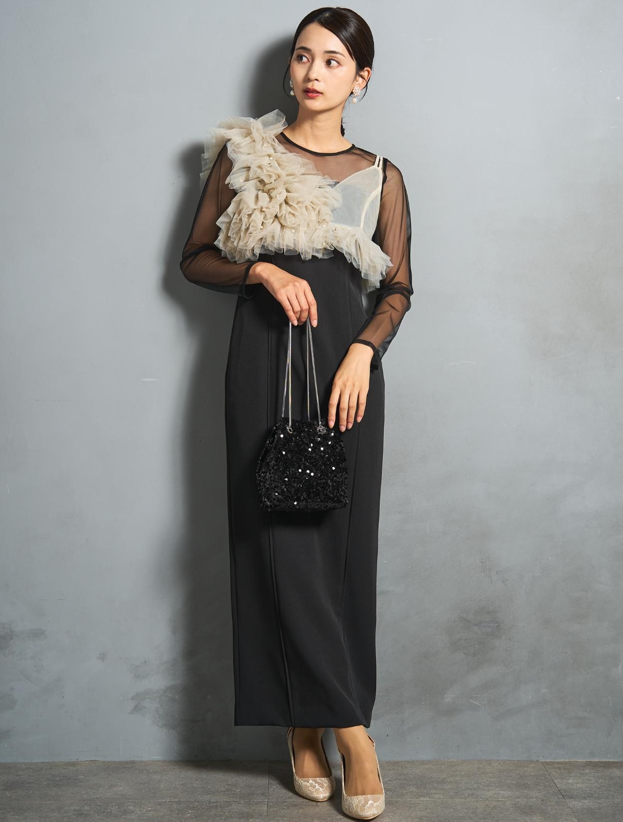 トップのチュールビスチェを引き立てるブラックコーデ。バッグは人気のスパンコール巾着バッグ。モードな印象のドレスを思いっきりトレンド感のある着こなしで楽しめます。スパンコールなのでブラックコーデでもさみしく見えないのもポイント。上半身にボリュームのあるデザインなので、アクセサリーは敢えてイヤリングをチョイス。ブラックのドレスに映えるフラワーモチーフの華やかさのある人気のイヤリングです。