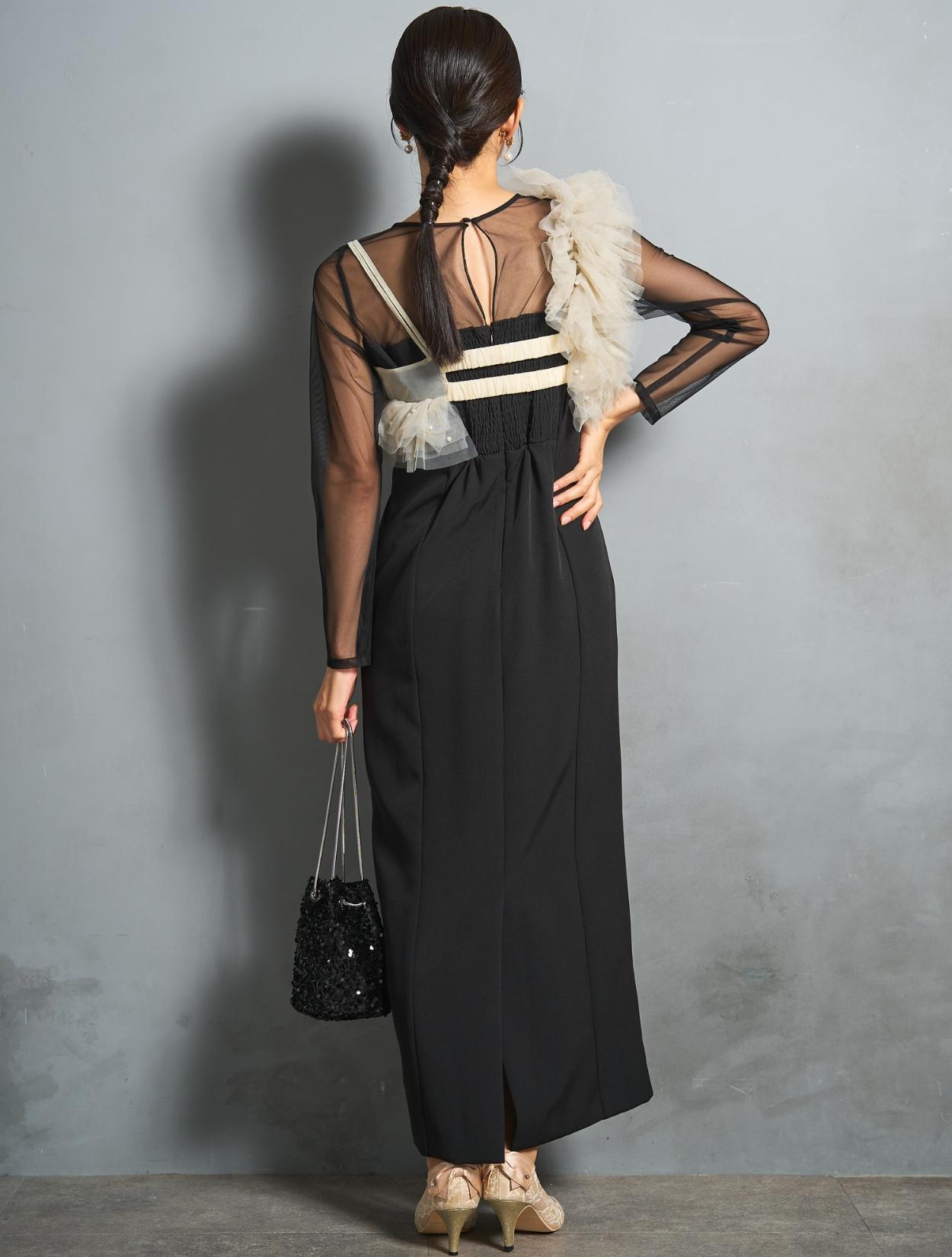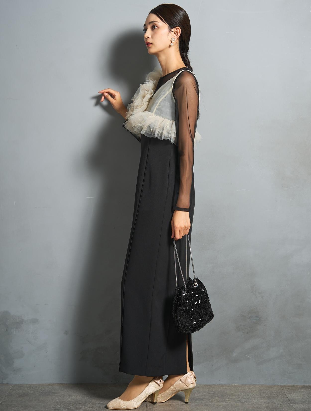 シアー素材をドッキングしたワンピースと、チュールビスチェがセットになったトレンド感のあるドレス。モードな印象もありつつ、マットなチュールを贅沢に使った「大人かわいい」がポイントです。