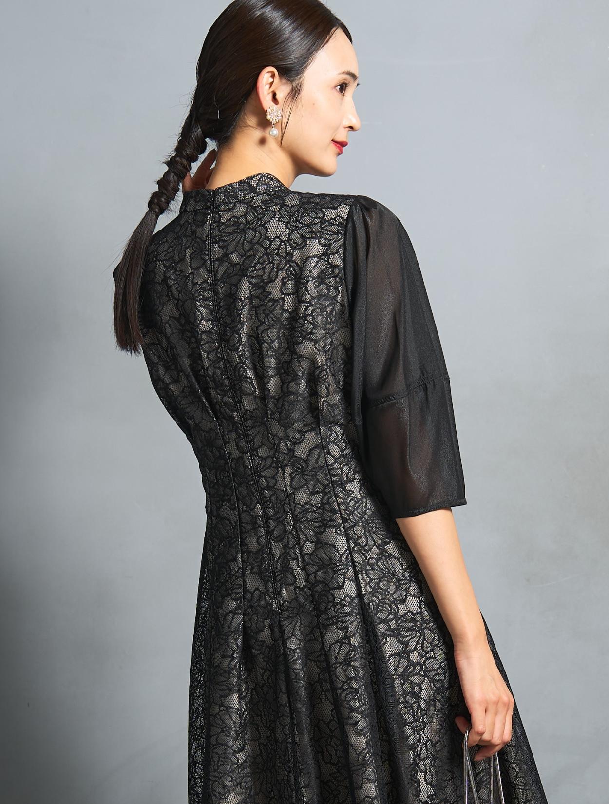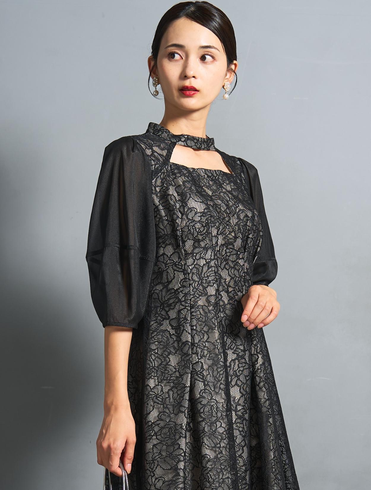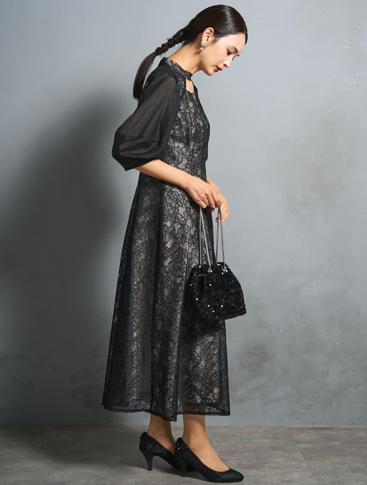 ブラックのレースに、レースから透けるインナーワンピースは上品なベージュゴールド。ブラックドレスでも柄が良く見えて華やかな印象に。シックな印象なブラックカラーですが、程よく華やかさもありパーティーシーンにぴったりです。