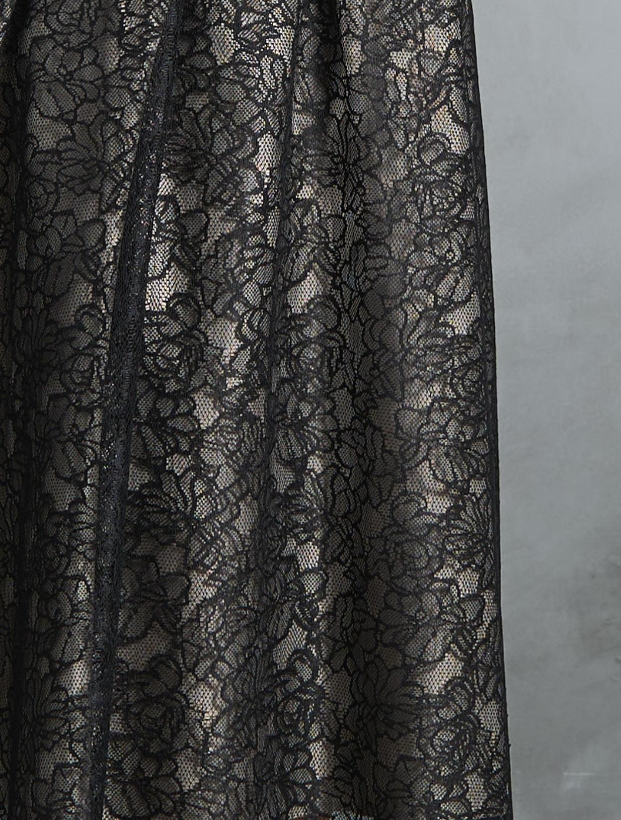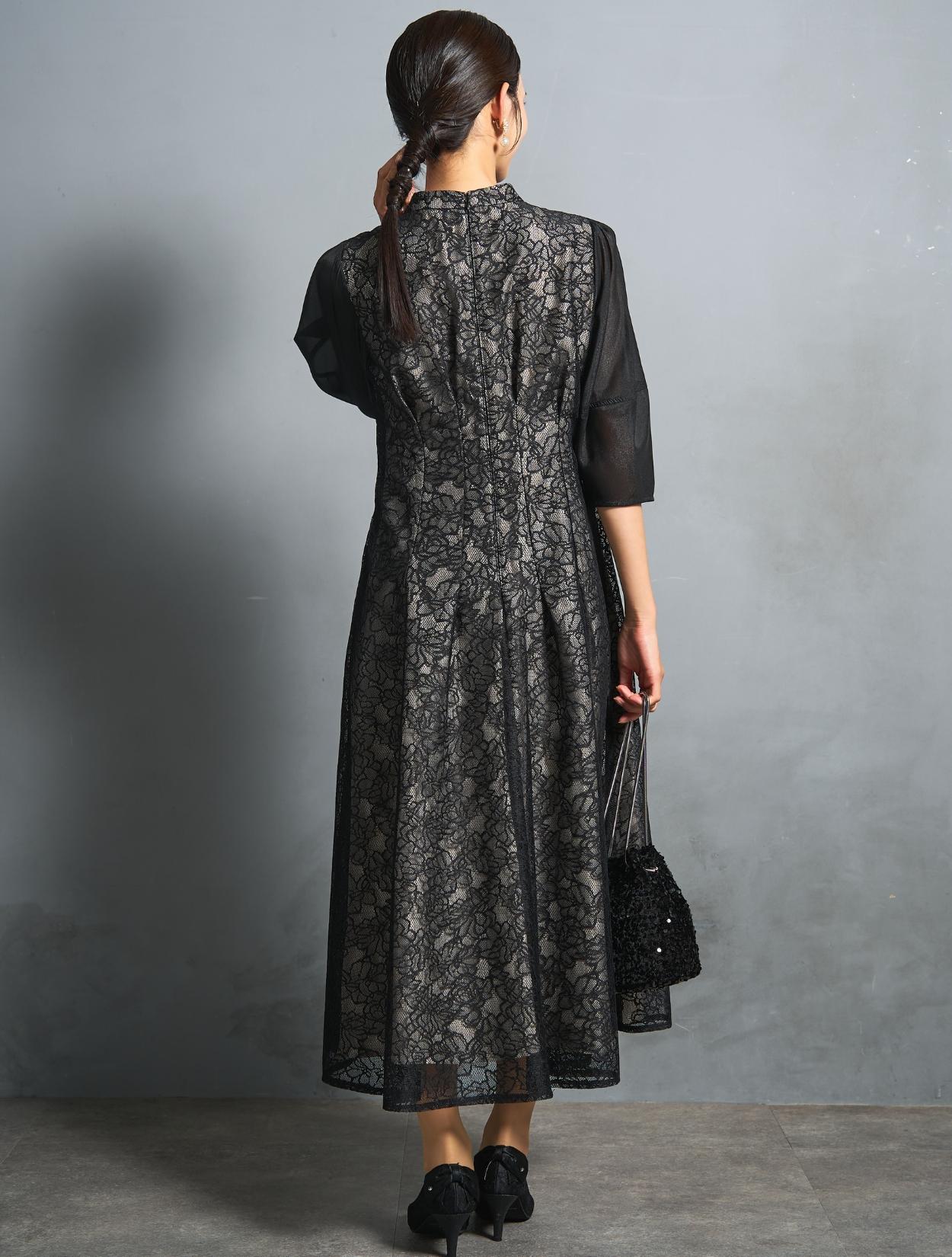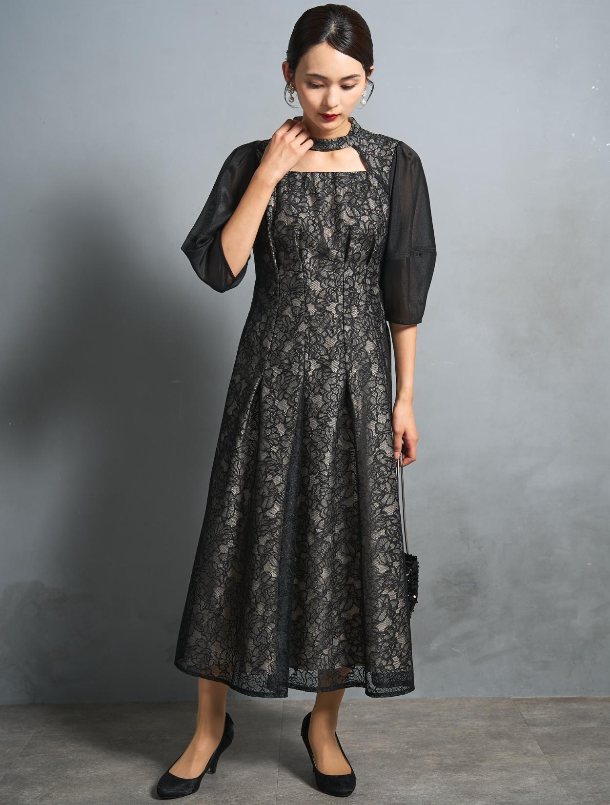 ブラックのレースに、レースから透けるインナーワンピースは上品なベージュゴールド。ブラックドレスでも柄が良く見えて華やかな印象に。シックな印象なブラックカラーですが、程よく華やかさもありパーティーシーンにぴったりです。