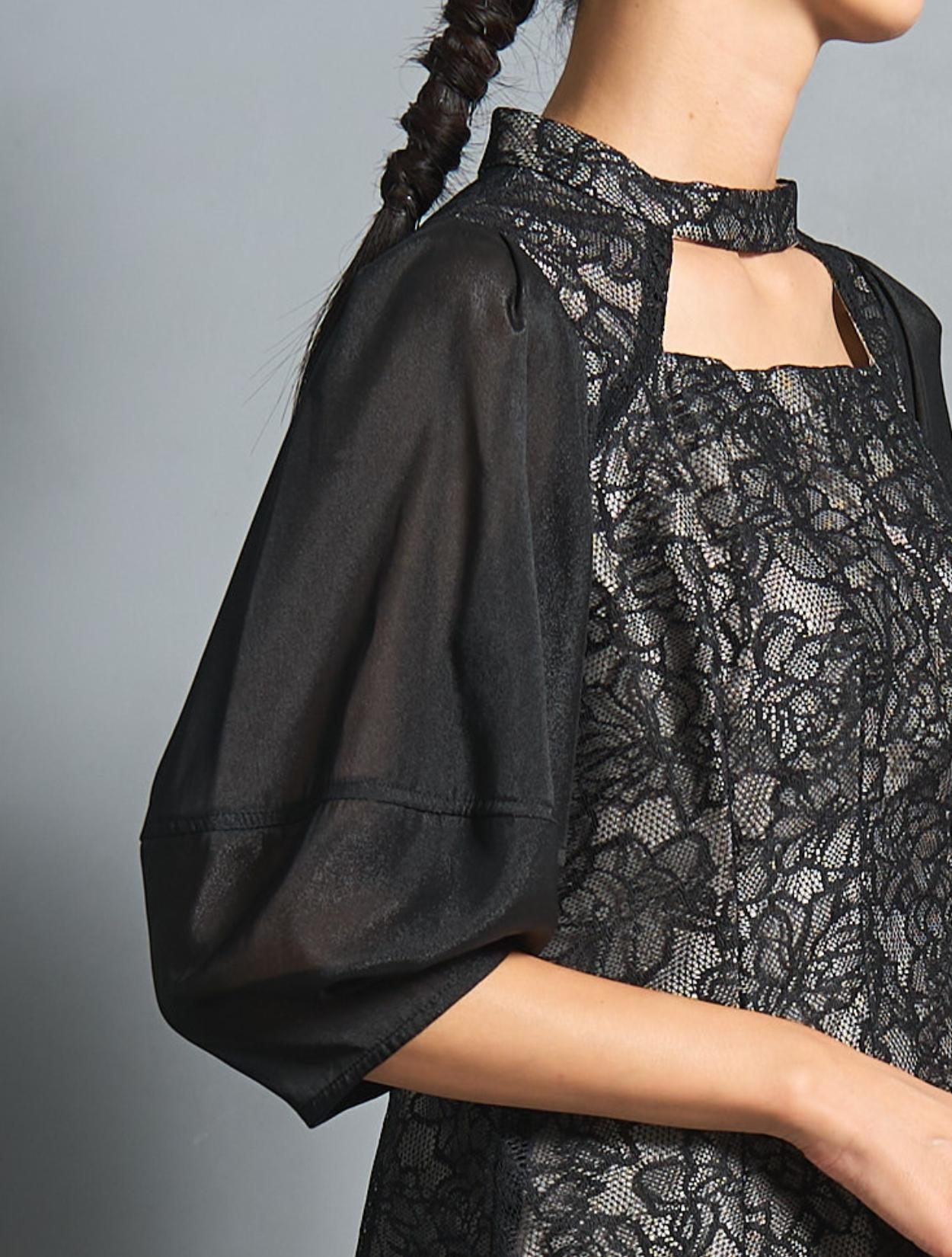 キュッと詰まった首元に、デコルテのカットアウトがポイントのドレス。クラシカルなフラワーレースにモードなテイストが入った、甘辛MIXな着こなしが楽しめます。デコルテの抜け感や、程よい肌感のあるオーガンジースリーブが、全体の印象を軽やかに見せてくれます。