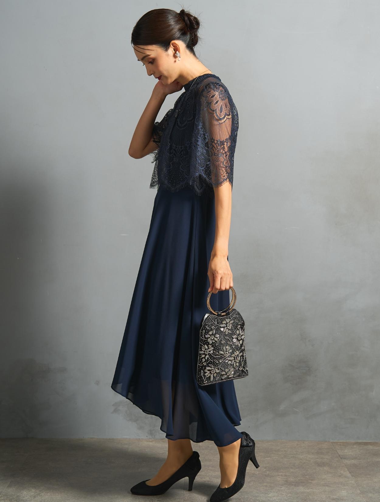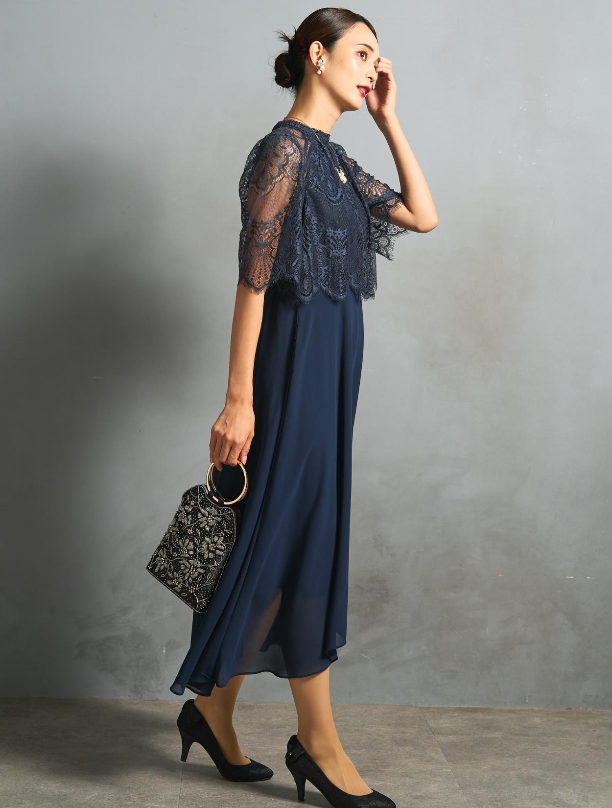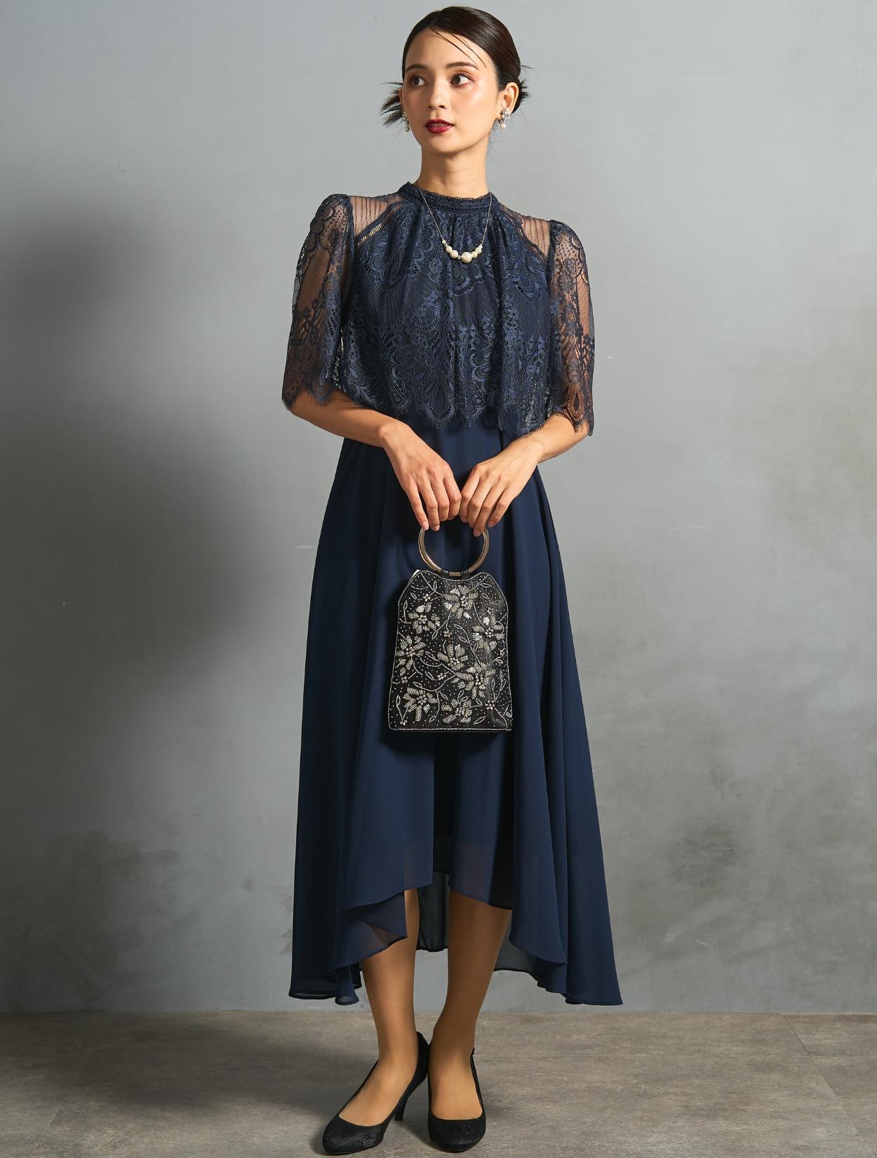 ヘム裾スカートが華やかなデザインのドレス。長すぎない丈感は、低身長の方にもおすすめです。ウエストの切り替えは、表からは見えないですが高めに設定されているので脚長効果抜群。低身長の方でもバランスよく着こなせます。フワッとしたオーバーブラウス風レースが、ウエストや腰周りをすっきり見せてくれる人気のデザイン。着痩せ効果がかなり期待できます。ウエストは背中部分のみゴム仕様で、着心地も◎。ミニスタンドネックが上品でクラシカルな印象。結婚式などのフォーマルな場面にぴったりです。肩から袖は透け感がありますが、デコルテ部分は透けないので幅広い年代が安心して着られます。