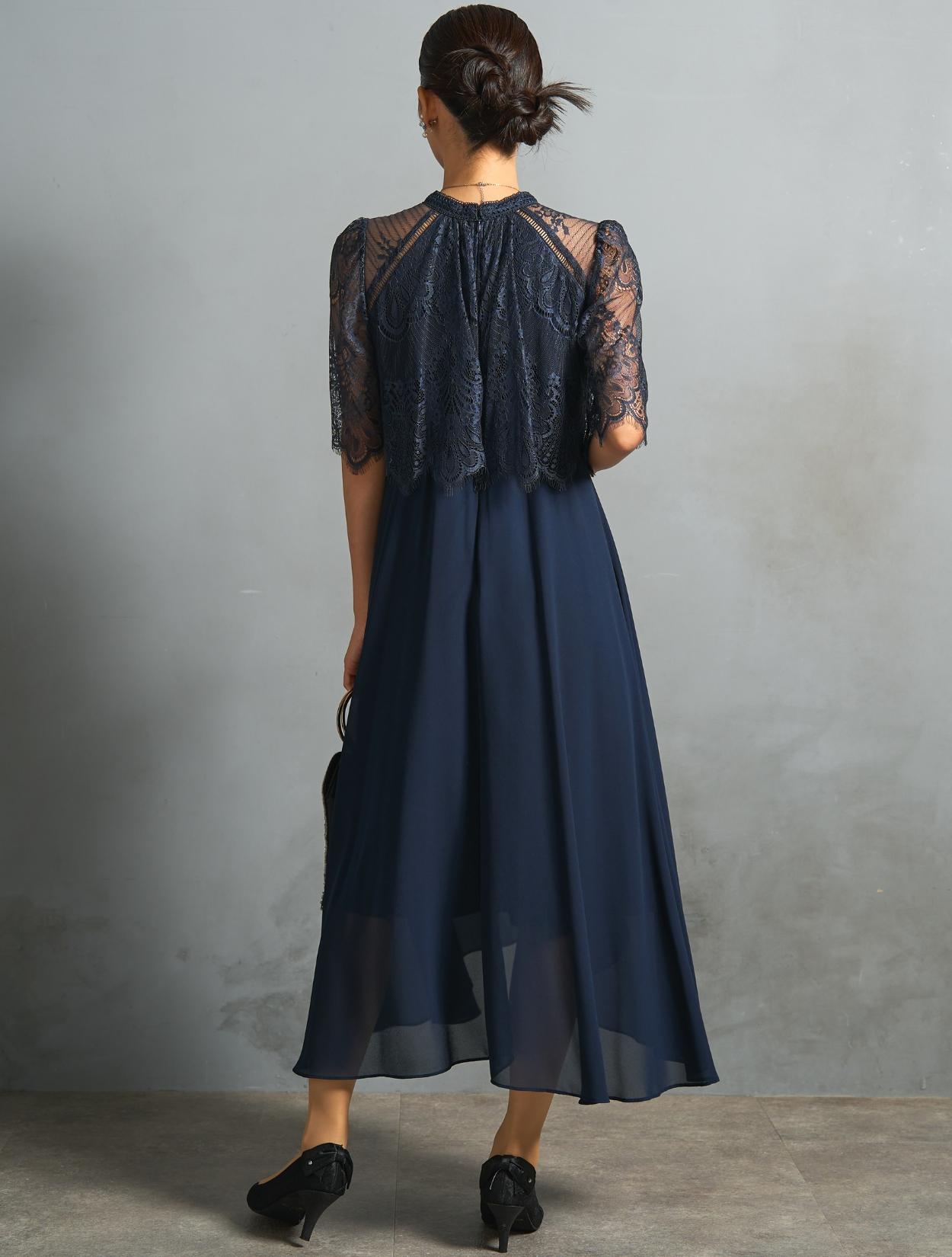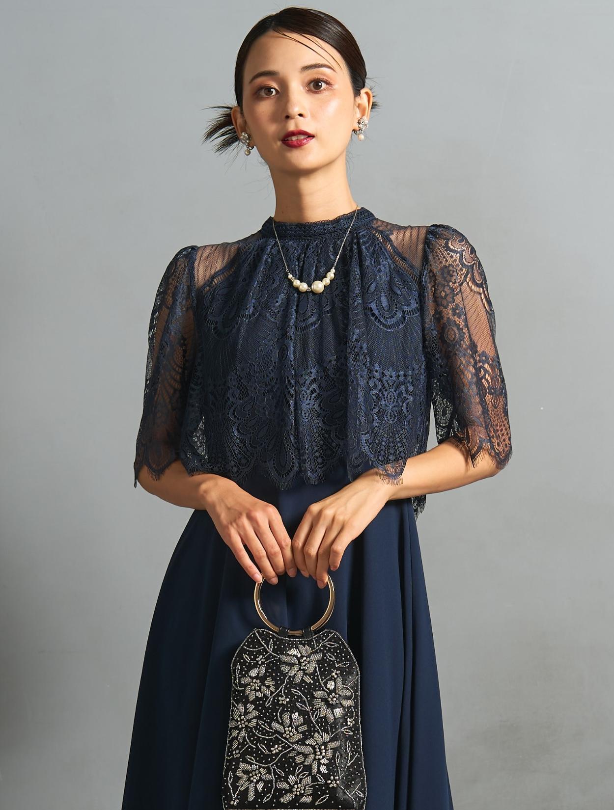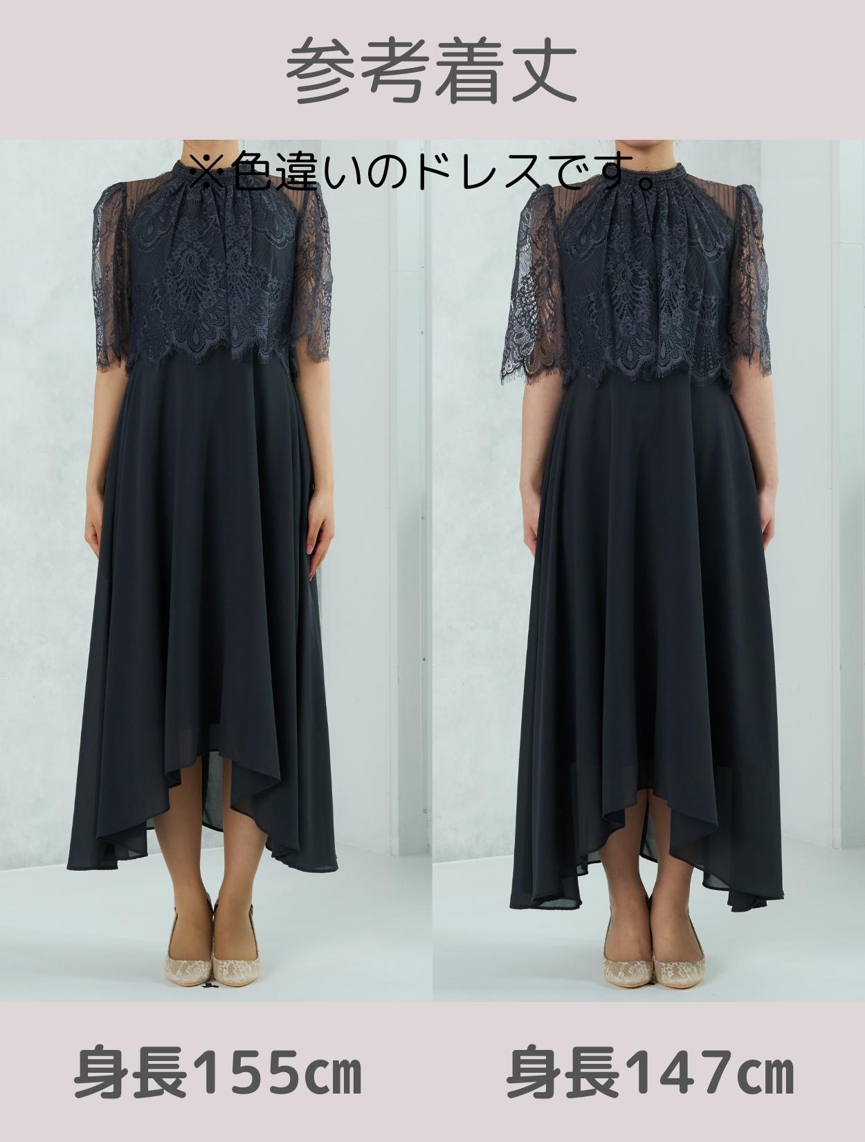 ヘム裾スカートが華やかなデザインのドレス。長すぎない丈感は、低身長の方にもおすすめです。ウエストの切り替えは、表からは見えないですが高めに設定されているので脚長効果抜群。低身長の方でもバランスよく着こなせます。フワッとしたオーバーブラウス風レースが、ウエストや腰周りをすっきり見せてくれる人気のデザイン。着痩せ効果がかなり期待できます。ウエストは背中部分のみゴム仕様で、着心地も◎。ミニスタンドネックが上品でクラシカルな印象。結婚式などのフォーマルな場面にぴったりです。肩から袖は透け感がありますが、デコルテ部分は透けないので幅広い年代が安心して着られます。