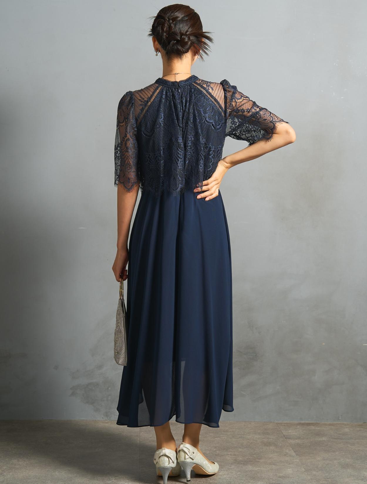 ヘム裾スカートが華やかなデザインのドレス。長すぎない丈感は、低身長の方にもおすすめです。ウエストの切り替えは、表からは見えないですが高めに設定されているので脚長効果抜群。低身長の方でもバランスよく着こなせます。フワッとしたオーバーブラウス風レースが、ウエストや腰周りをすっきり見せてくれる人気のデザイン。着痩せ効果がかなり期待できます。ウエストは背中部分のみゴム仕様で、着心地も◎。ミニスタンドネックが上品でクラシカルな印象。結婚式などのフォーマルな場面にぴったりです。肩から袖は透け感がありますが、デコルテ部分は透けないので幅広い年代が安心して着られます。