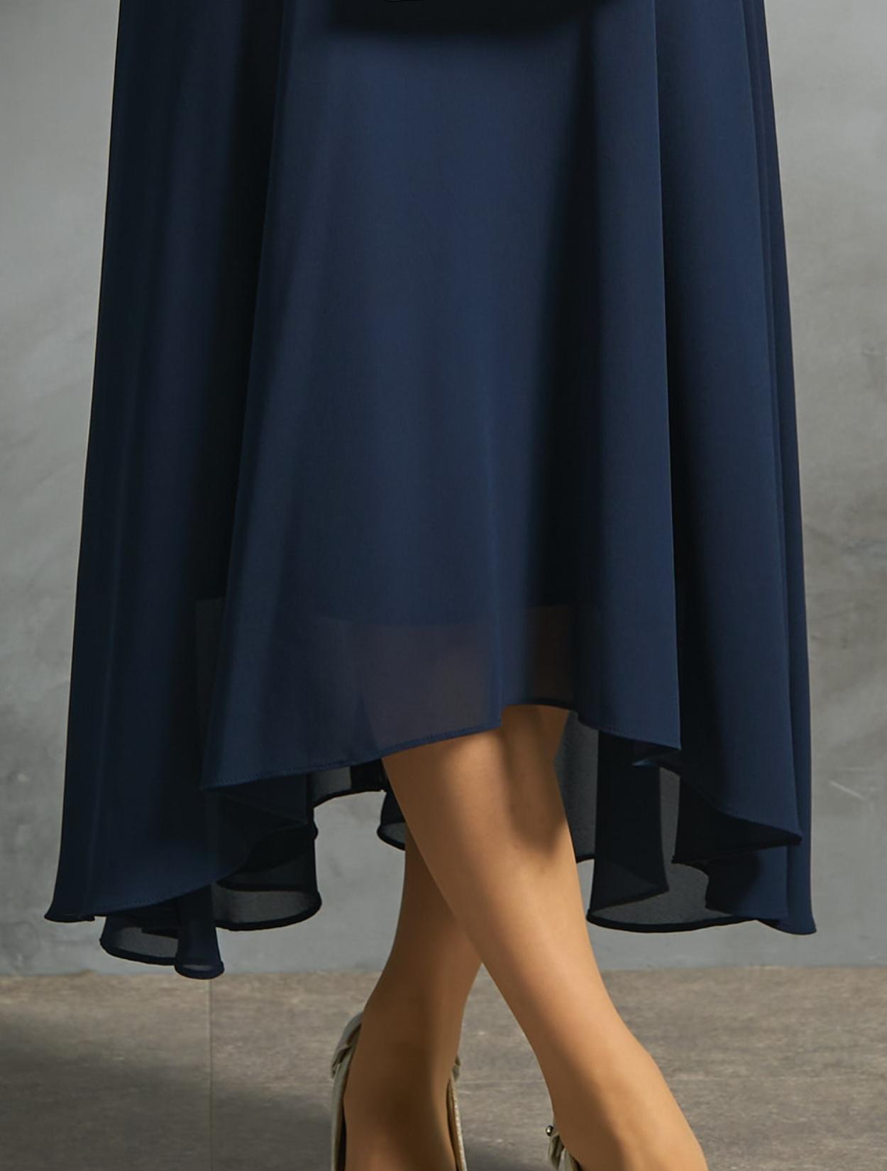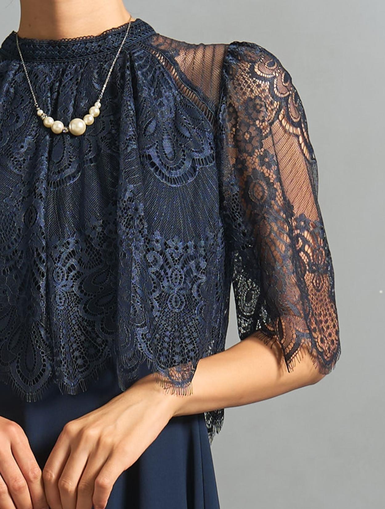 ヘム裾スカートが華やかなデザインのドレス。長すぎない丈感は、低身長の方にもおすすめです。ウエストの切り替えは、表からは見えないですが高めに設定されているので脚長効果抜群。低身長の方でもバランスよく着こなせます。フワッとしたオーバーブラウス風レースが、ウエストや腰周りをすっきり見せてくれる人気のデザイン。着痩せ効果がかなり期待できます。ウエストは背中部分のみゴム仕様で、着心地も◎。ミニスタンドネックが上品でクラシカルな印象。結婚式などのフォーマルな場面にぴったりです。肩から袖は透け感がありますが、デコルテ部分は透けないので幅広い年代が安心して着られます。