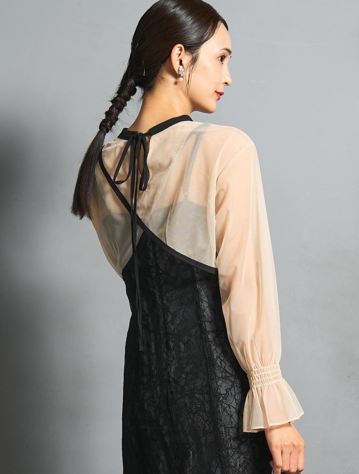 トレンドのレイヤードスタイルのドレス。シアーブラウスとレースのキャミワンピがセットになっています。シアーブラウスは、前後2wayで着られるデザイン。クロスしたデザインをフロントにすると、ひと癖あるおしゃれな着こなしに。シンプルなデザインを前にすると、ワンピースのレースを引き立たせるスッキリとした着こなしに。長めのリボン紐は、程よく可愛さを抑えた大人ナチュラルな印象に。しっかりとした長袖ですが、シアー素材なのでどんな季節でも着こなしやすいのもポイントです。