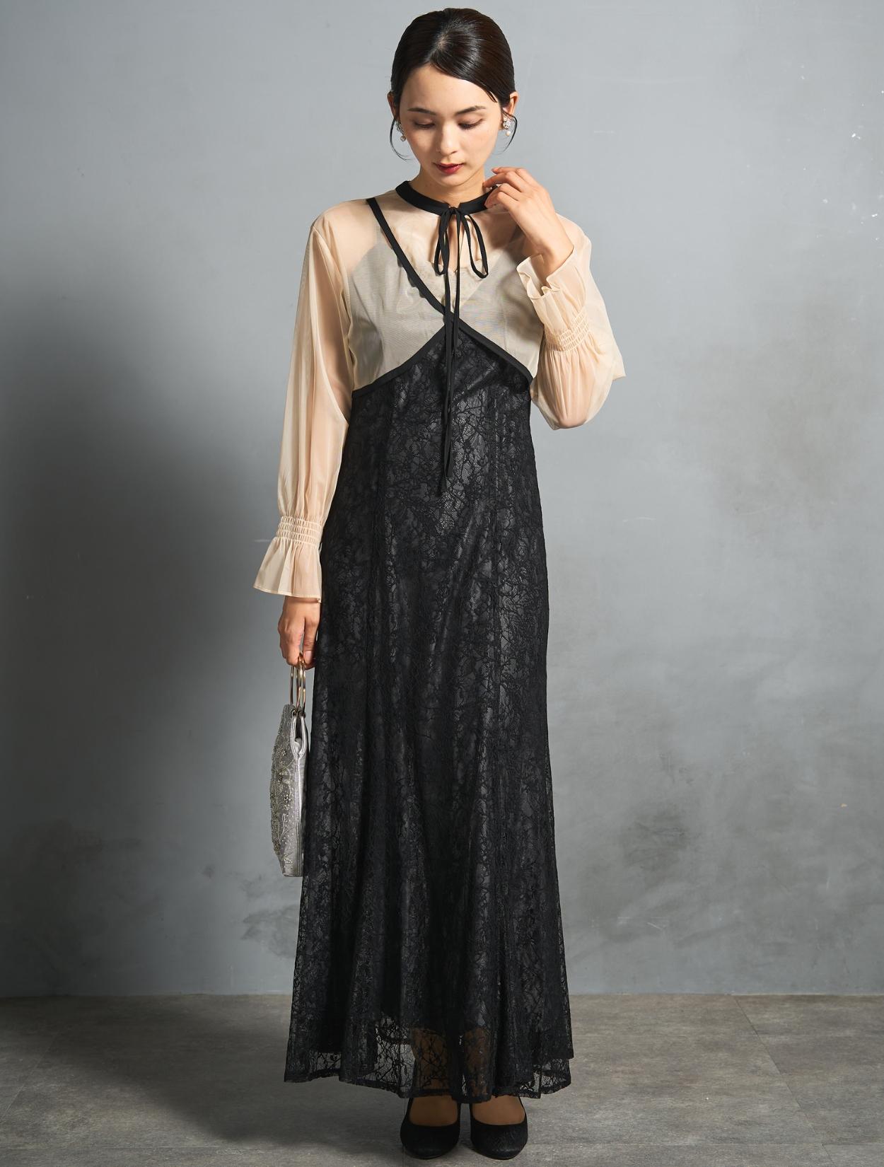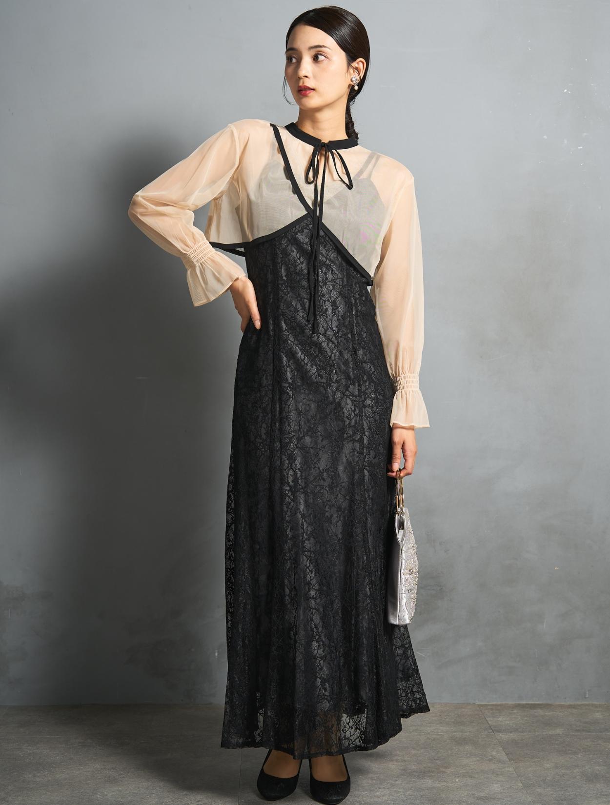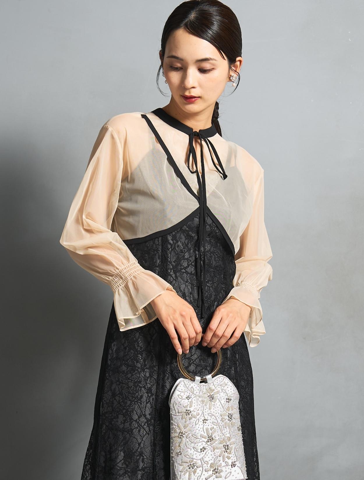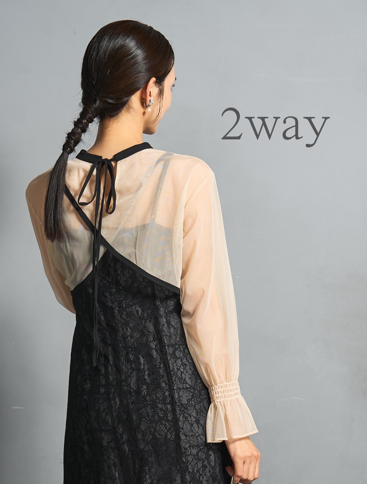 トレンドのレイヤードスタイルのドレス。シアーブラウスとレースのキャミワンピがセットになっています。シアーブラウスは、前後2wayで着られるデザイン。クロスしたデザインをフロントにすると、ひと癖あるおしゃれな着こなしに。シンプルなデザインを前にすると、ワンピースのレースを引き立たせるスッキリとした着こなしに。長めのリボン紐は、程よく可愛さを抑えた大人ナチュラルな印象に。しっかりとした長袖ですが、シアー素材なのでどんな季節でも着こなしやすいのもポイントです。