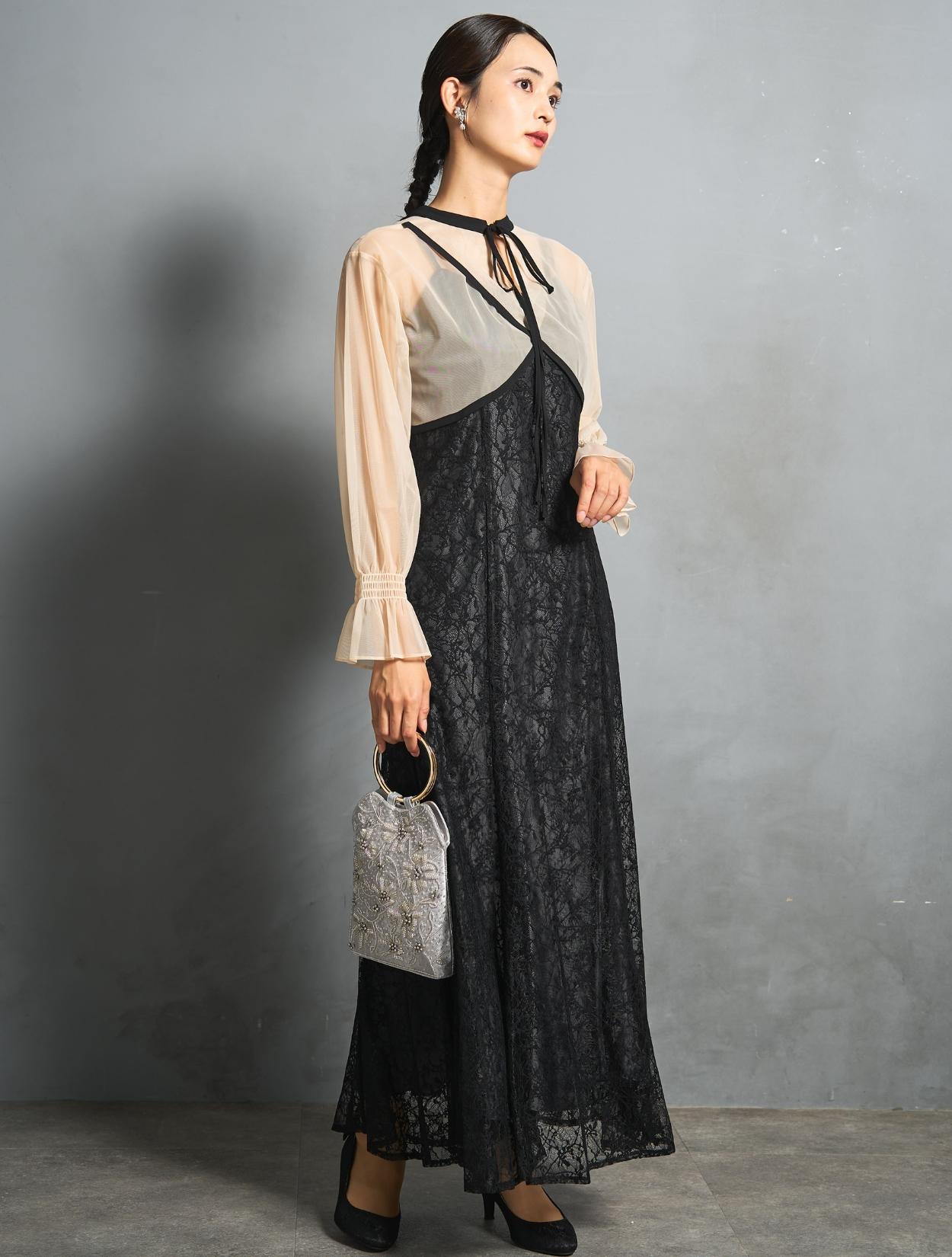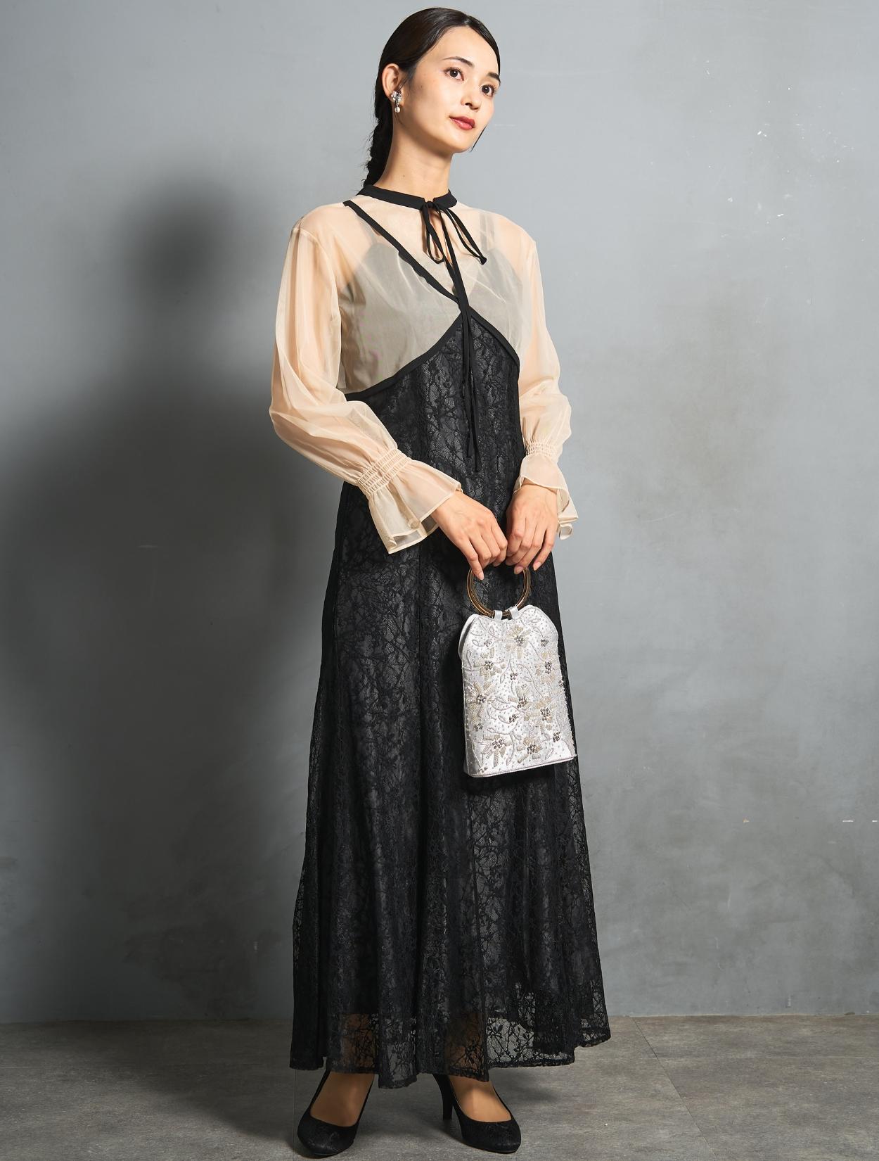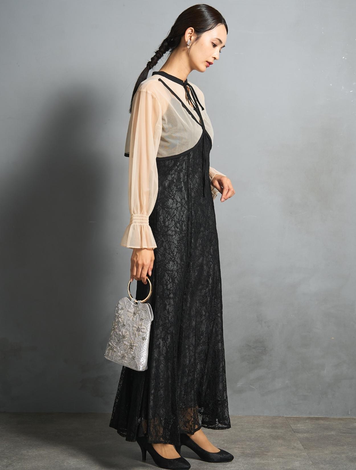 トレンドのレイヤードスタイルのドレス。シアーブラウスとレースのキャミワンピがセットになっています。シアーブラウスは、前後2wayで着られるデザイン。クロスしたデザインをフロントにすると、ひと癖あるおしゃれな着こなしに。シンプルなデザインを前にすると、ワンピースのレースを引き立たせるスッキリとした着こなしに。長めのリボン紐は、程よく可愛さを抑えた大人ナチュラルな印象に。しっかりとした長袖ですが、シアー素材なのでどんな季節でも着こなしやすいのもポイントです。