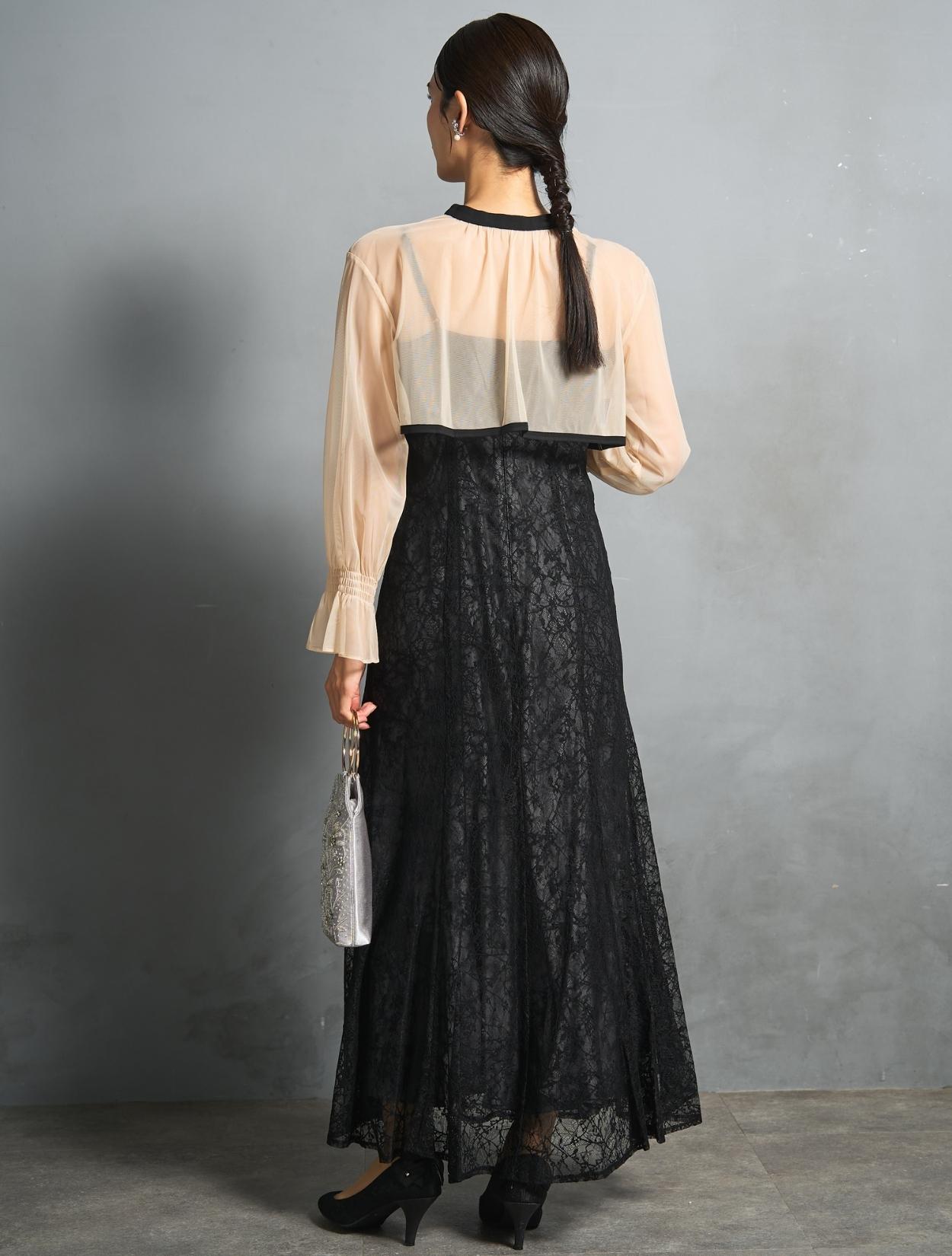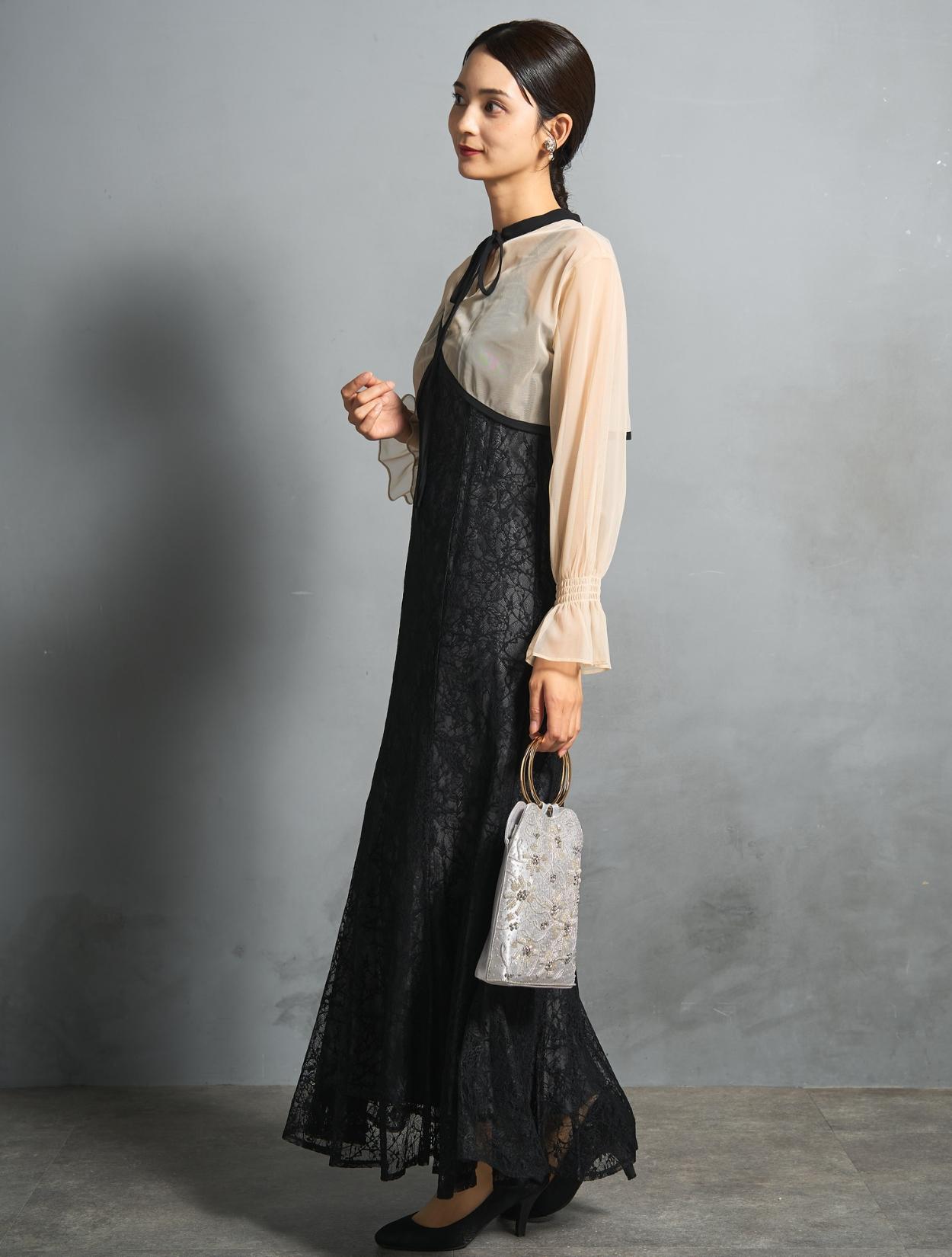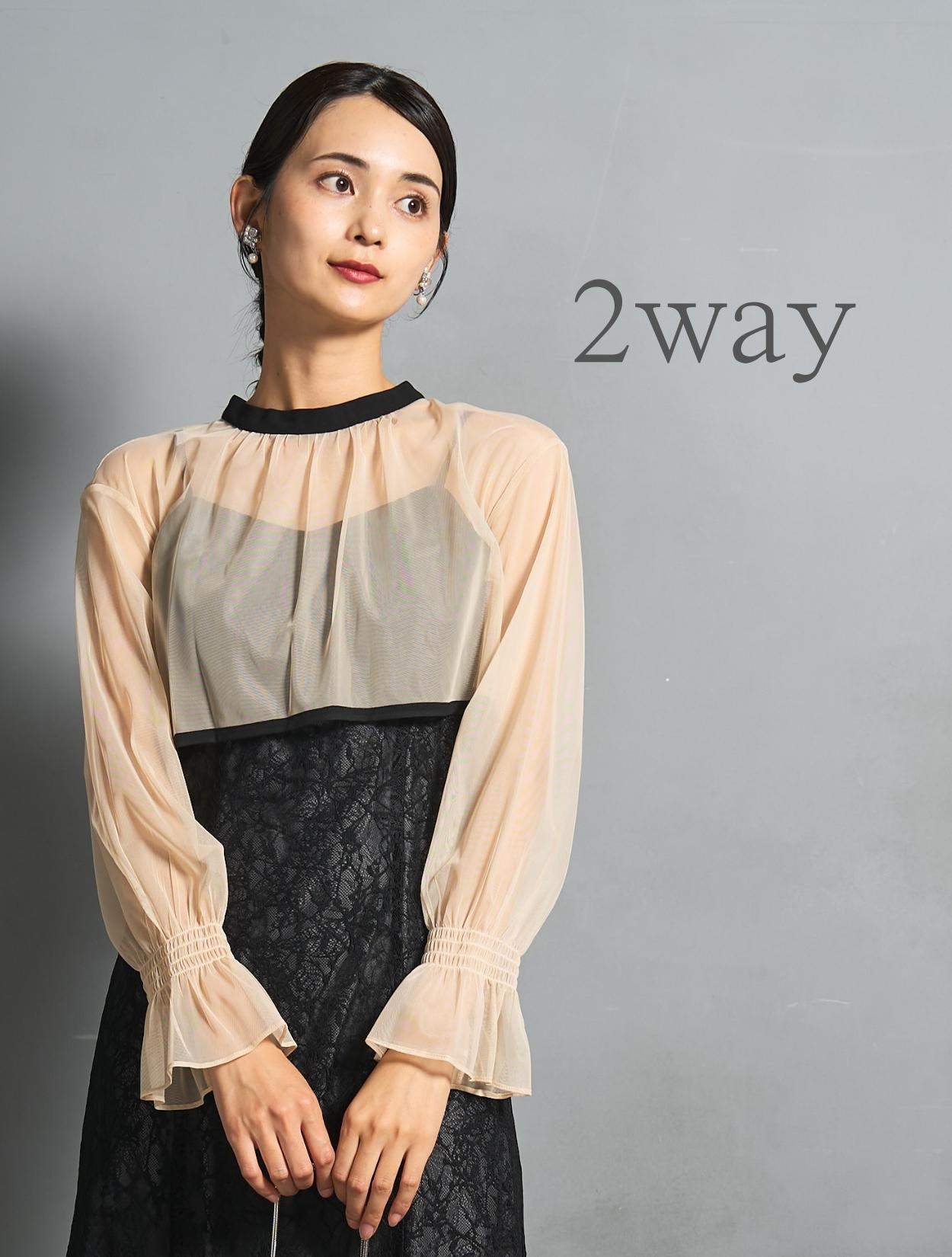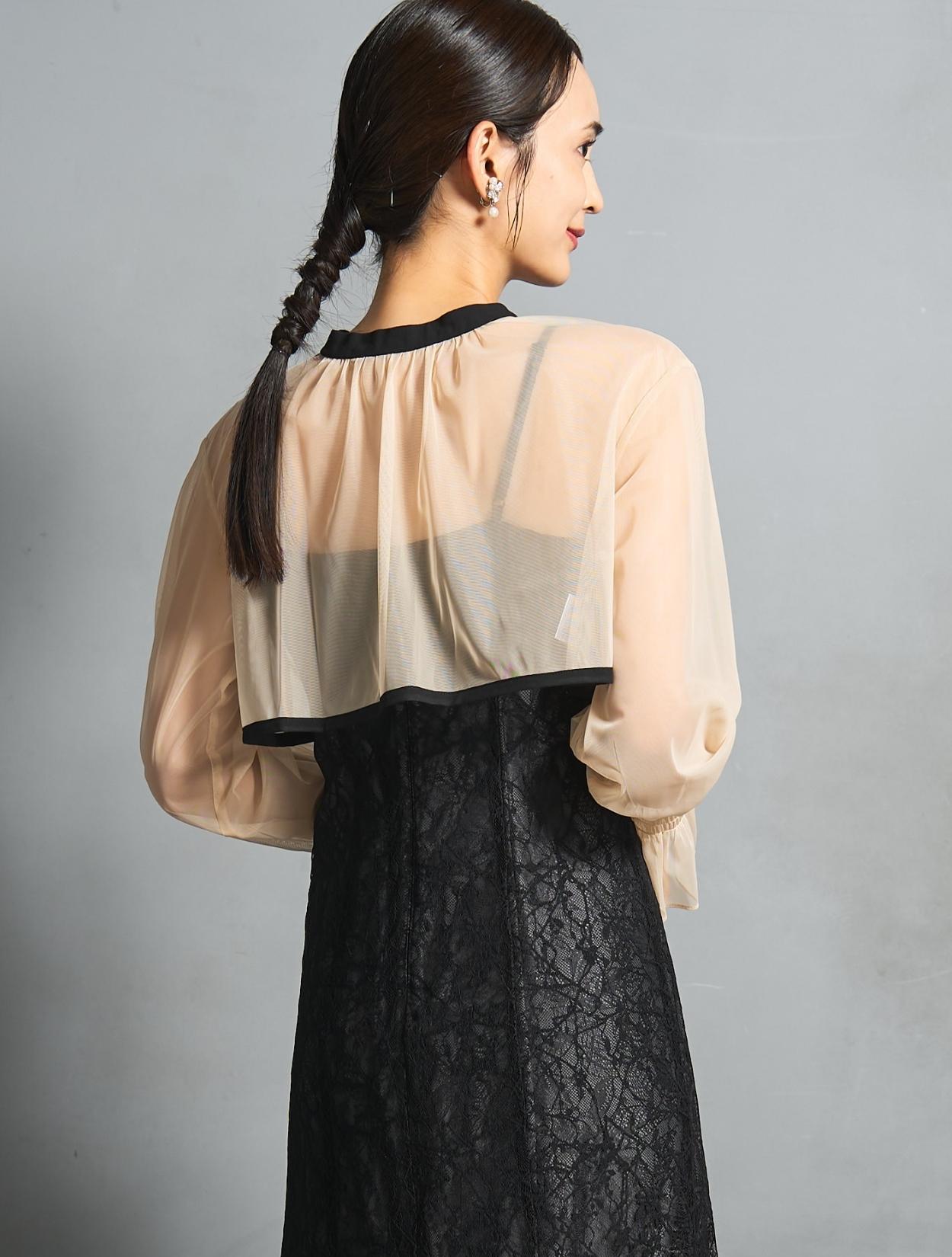 トレンドのレイヤードスタイルのドレス。シアーブラウスとレースのキャミワンピがセットになっています。シアーブラウスは、前後2wayで着られるデザイン。クロスしたデザインをフロントにすると、ひと癖あるおしゃれな着こなしに。シンプルなデザインを前にすると、ワンピースのレースを引き立たせるスッキリとした着こなしに。長めのリボン紐は、程よく可愛さを抑えた大人ナチュラルな印象に。しっかりとした長袖ですが、シアー素材なのでどんな季節でも着こなしやすいのもポイントです。