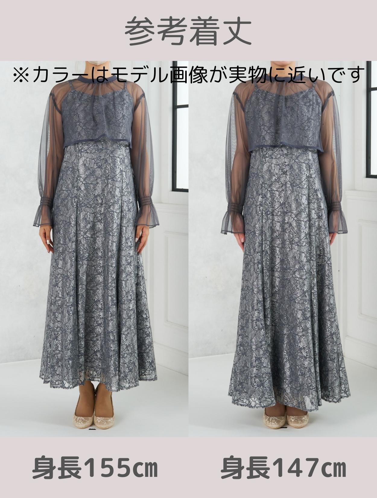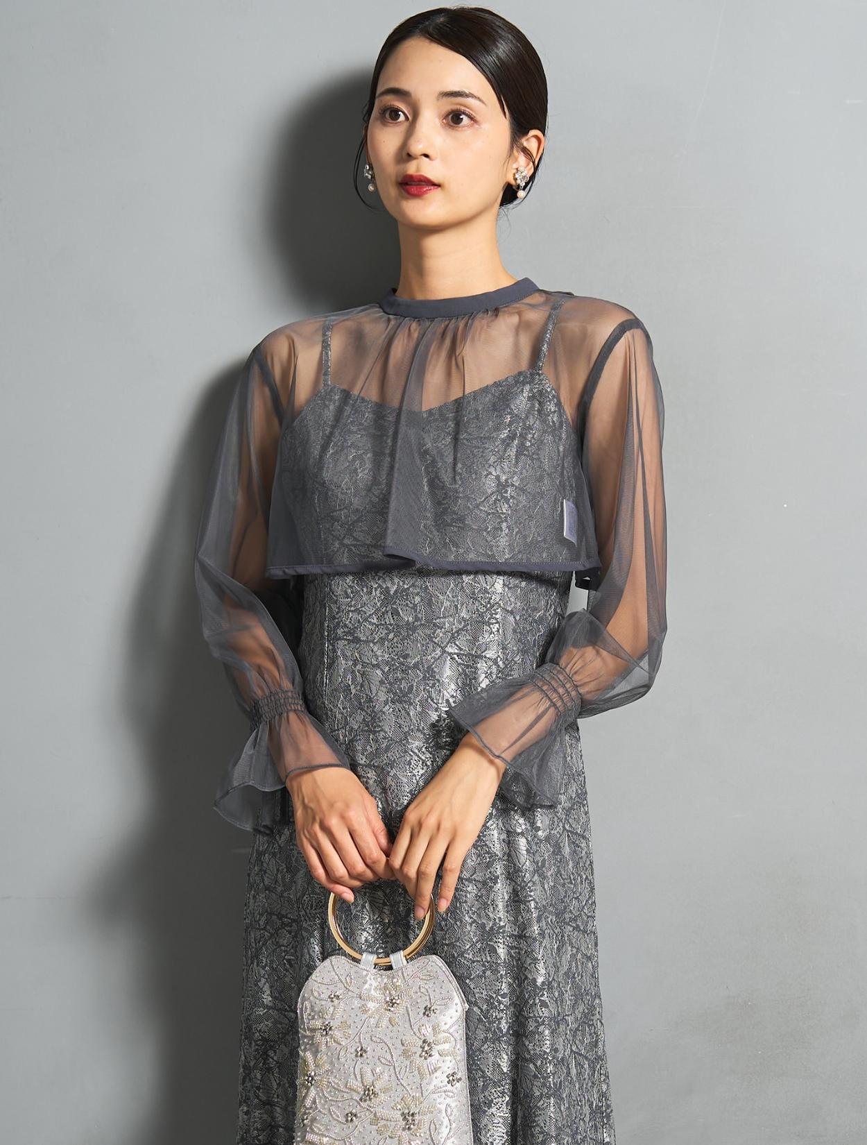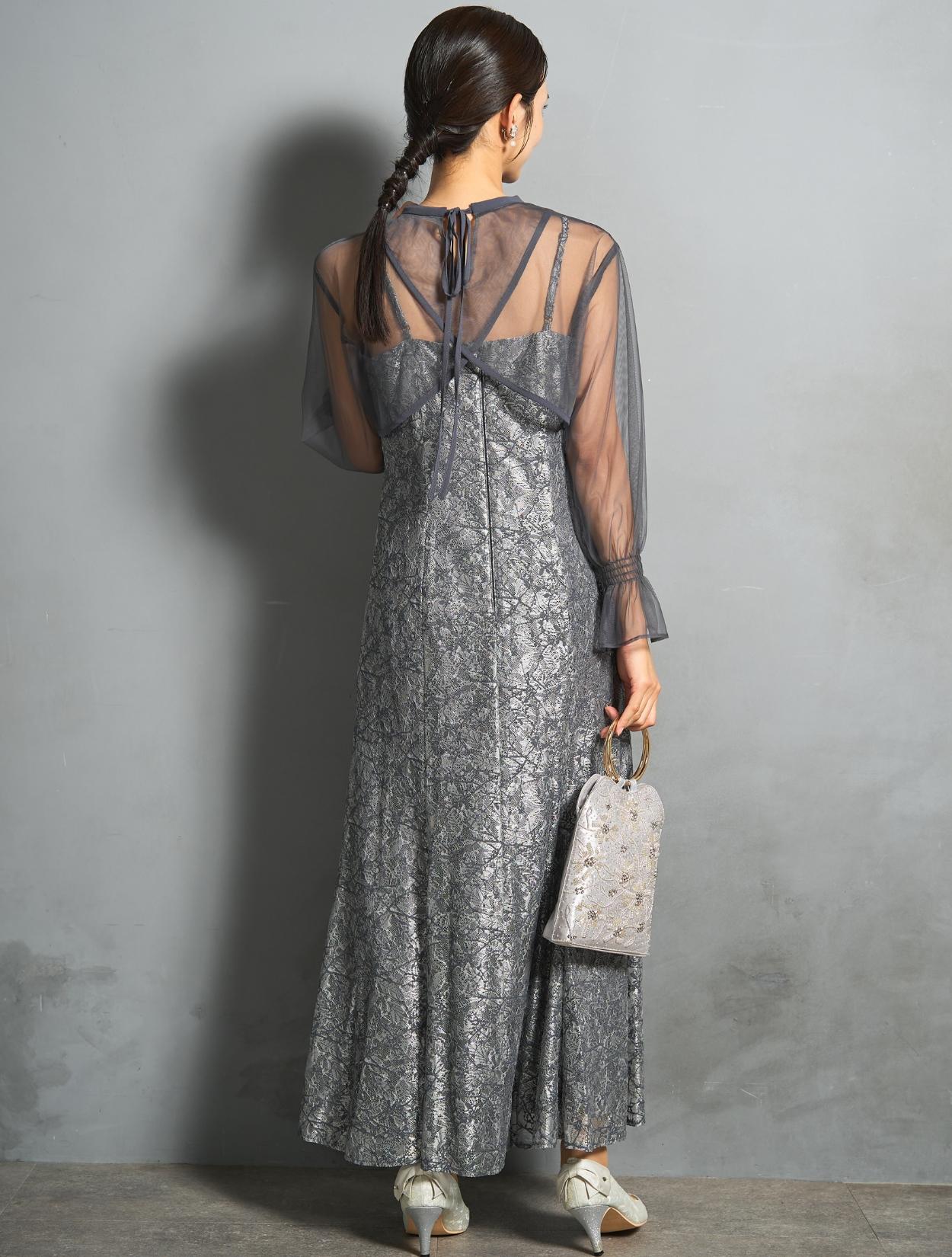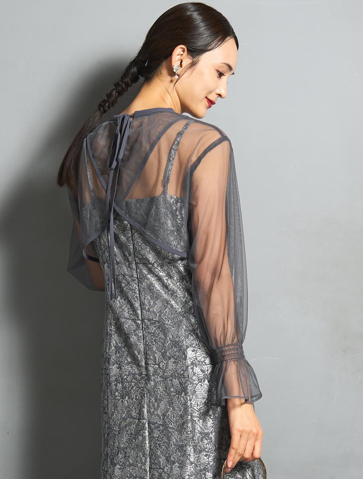 トレンドのレイヤードスタイルのドレス。シアーブラウスとレースのキャミワンピがセットになっています。シアーブラウスは、前後2wayで着られるデザイン。クロスしたデザインをフロントにすると、ひと癖あるおしゃれな着こなしに。シンプルなデザインを前にすると、ワンピースのレースを引き立たせるスッキリとした着こなしに。長めのリボン紐は、程よく可愛さを抑えた大人ナチュラルな印象に。しっかりとした長袖ですが、シアー素材なのでどんな季節でも着こなしやすいのもポイントです。