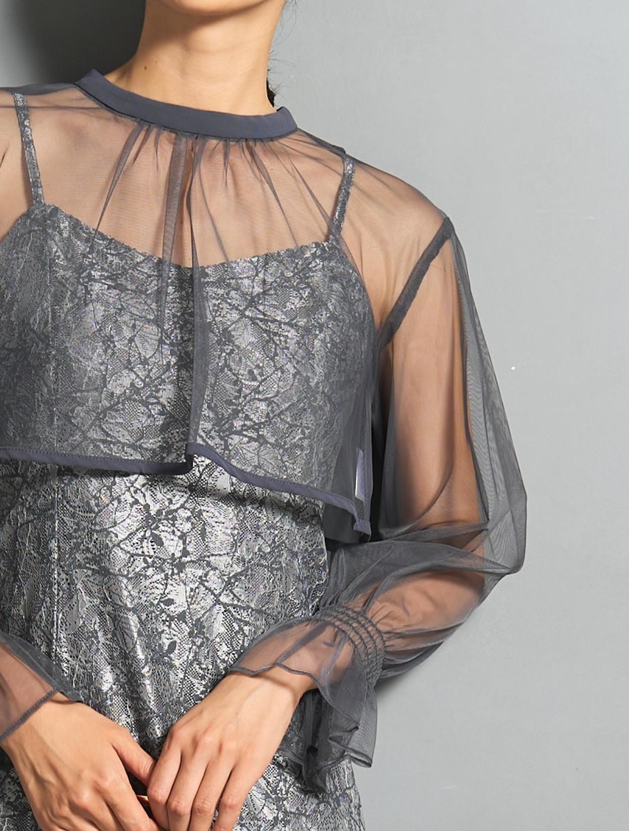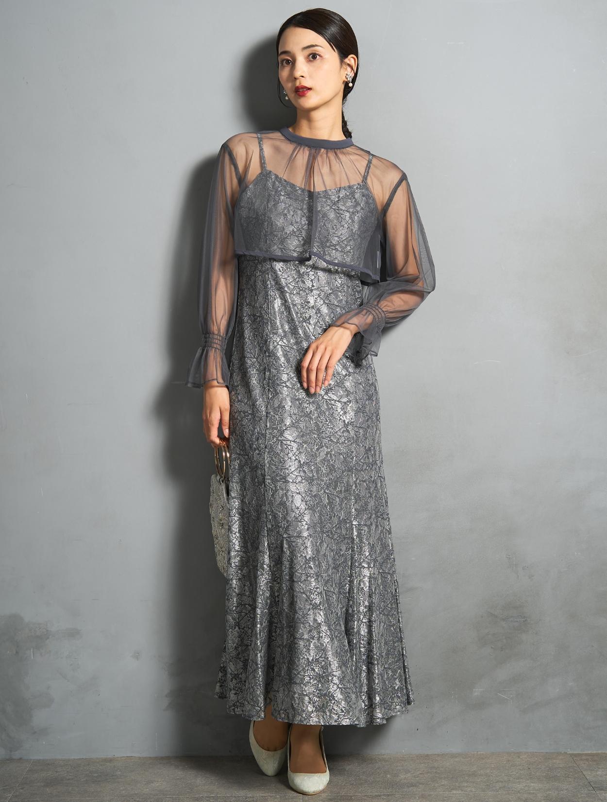 【Color】***a*首元のパイピング部分は、くすみのあるチャコールグレーグレーのようなグレイッシュネイビー。柔らかなニュアンスのあるシアーブラウスのアクセントになります。ワンピースはシルバーグレーの光沢糸と、シックなグレイッシュネイビーがモードで華やかな雰囲気があります。おしゃれだけど上品で控えめな色味です。